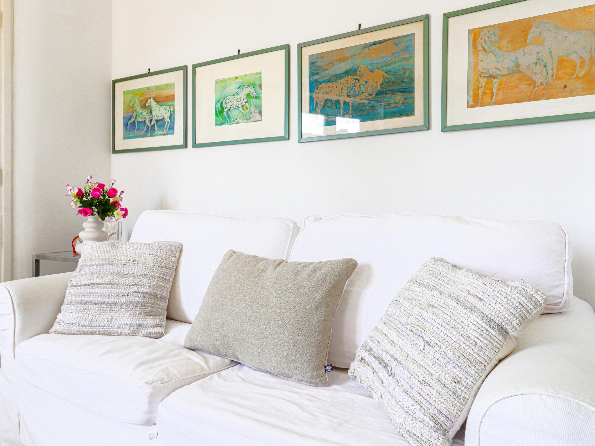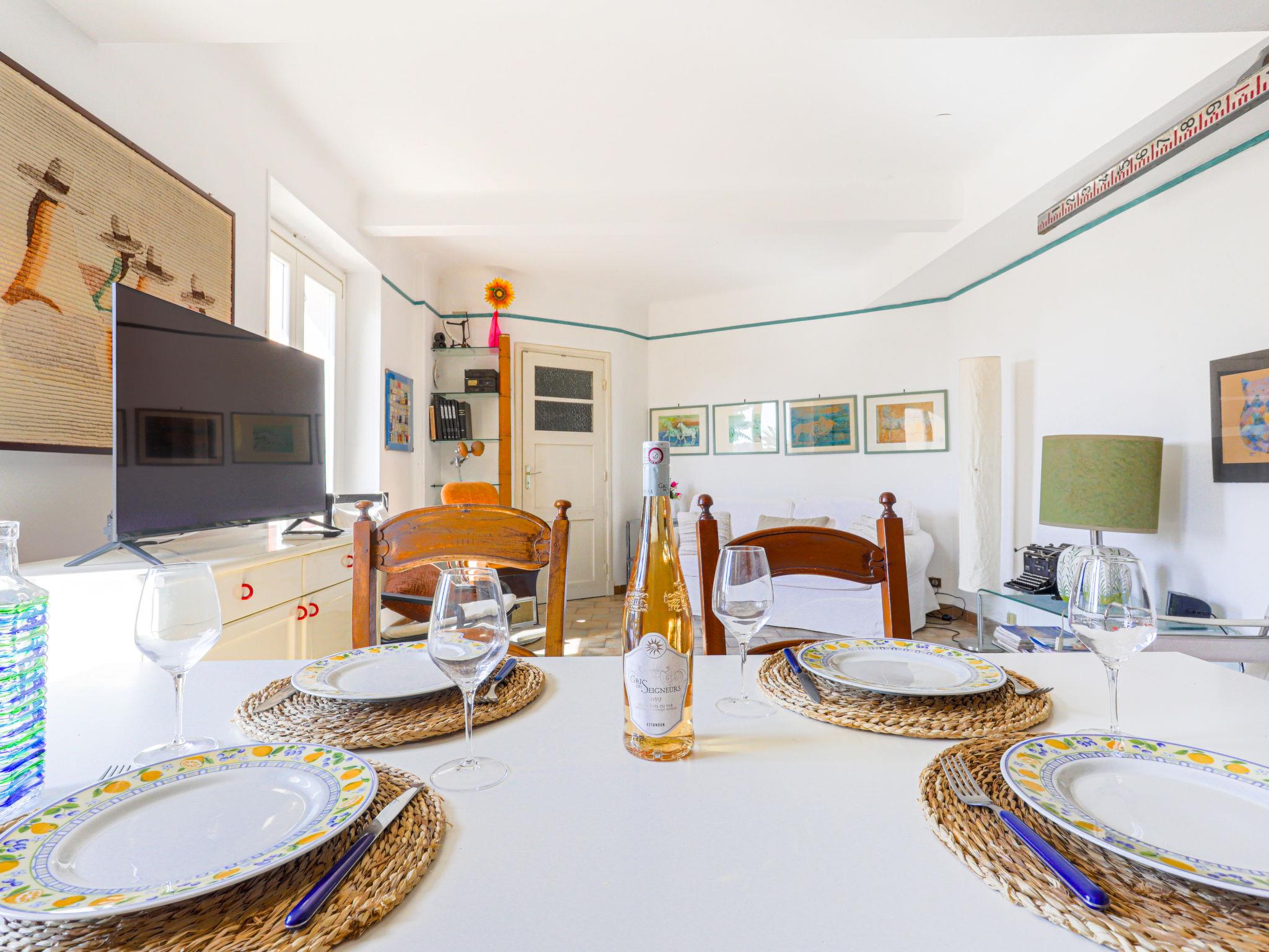 2-room apartment 57 m2, on the upper ground floor, south facing position. Bright, comfortable furnishings: large living/dining room with 1 double sofabed (140 cm, length 190 cm), electric heater. 1 room with 1 french bed (140 cm, length 190 cm), electric heater. Kitchen (4 hot plates, oven, toaster, kettle, electric coffee machine). Bathroom, sep. WC. Electric heating. Beautiful view of the sea and the bay. Facilities: washing machine. Internet (WiFi, free). Please note: 1 small pet/ dog allowed. Smoke alarm. Offer by a private individual according to Art. 155, IV of CGI. 06159032233DP