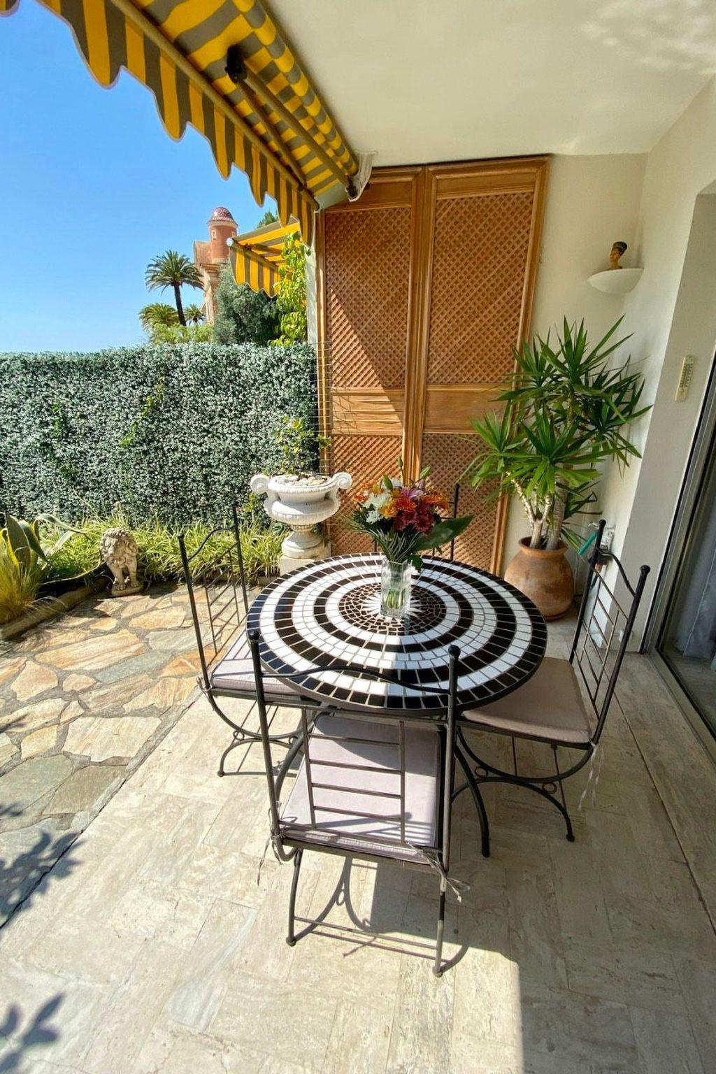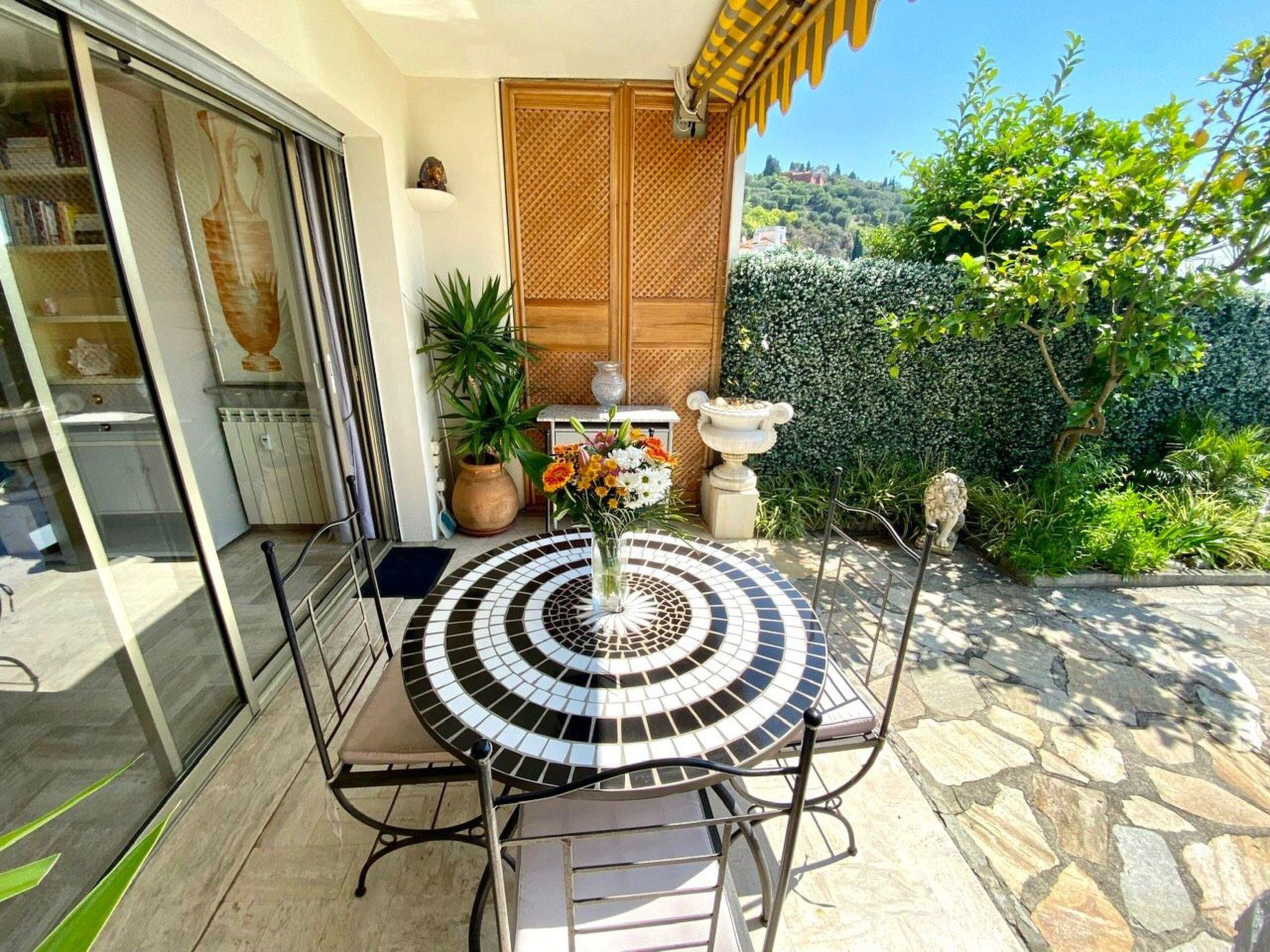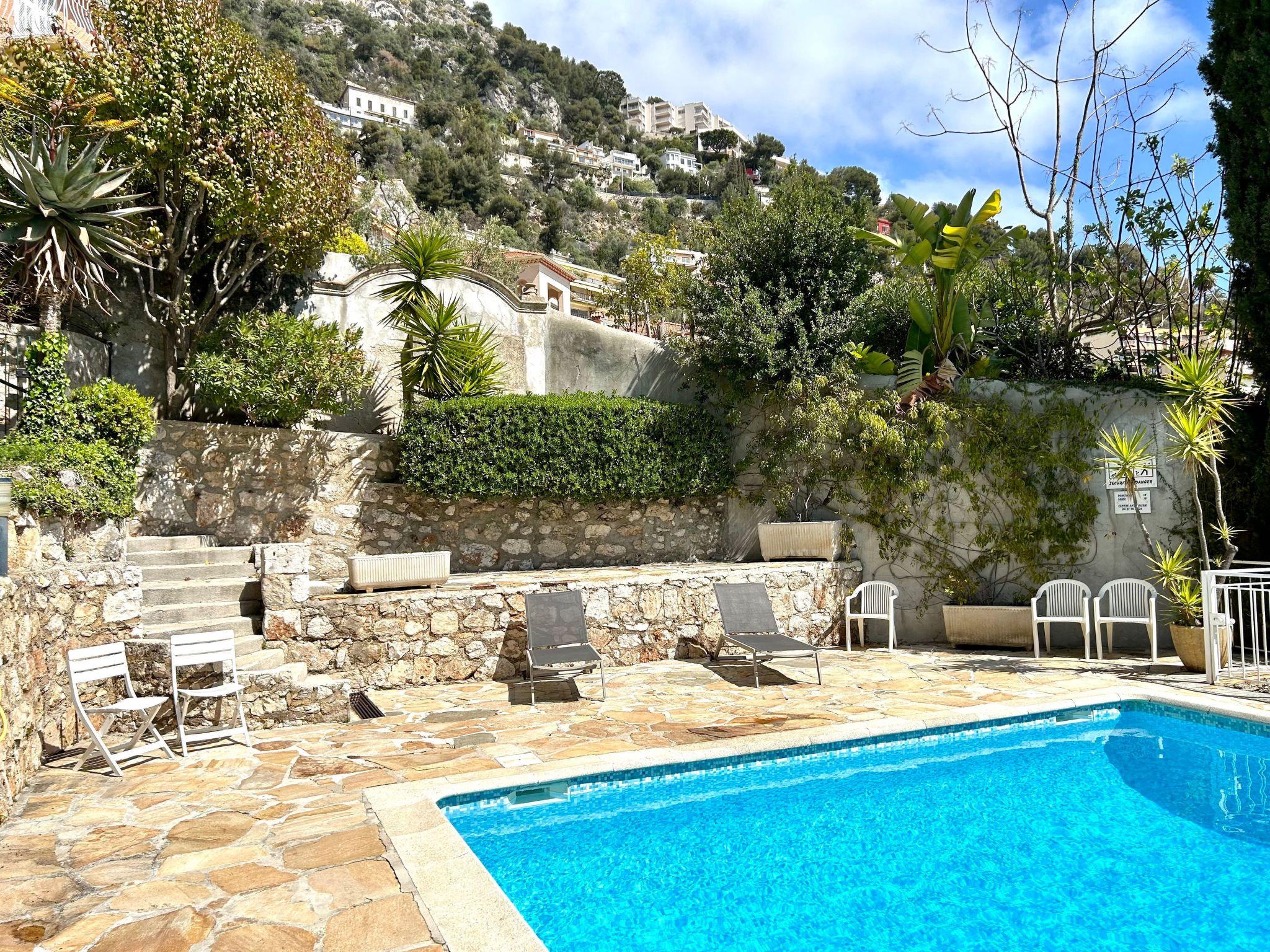 The little apartment has a terrace and a garden (40m²). The terrace affords a unique panorama of the Cap Ferrat peninsula, the Villefranche sur Mer bay and the old town. The residence has a caretaker, a shared pool (which is never overcrowded even in summer), a private parking space and a Mediterranean park. The whole complex, including the pool and the park, is illuminated at night, in case you fancy swimming a couple of rounds late in the evening. The pool is not heated, but can be used from the end of May to the end of September. The pool area, however, is open all year round for those who just want to relax in the sun by the pool.