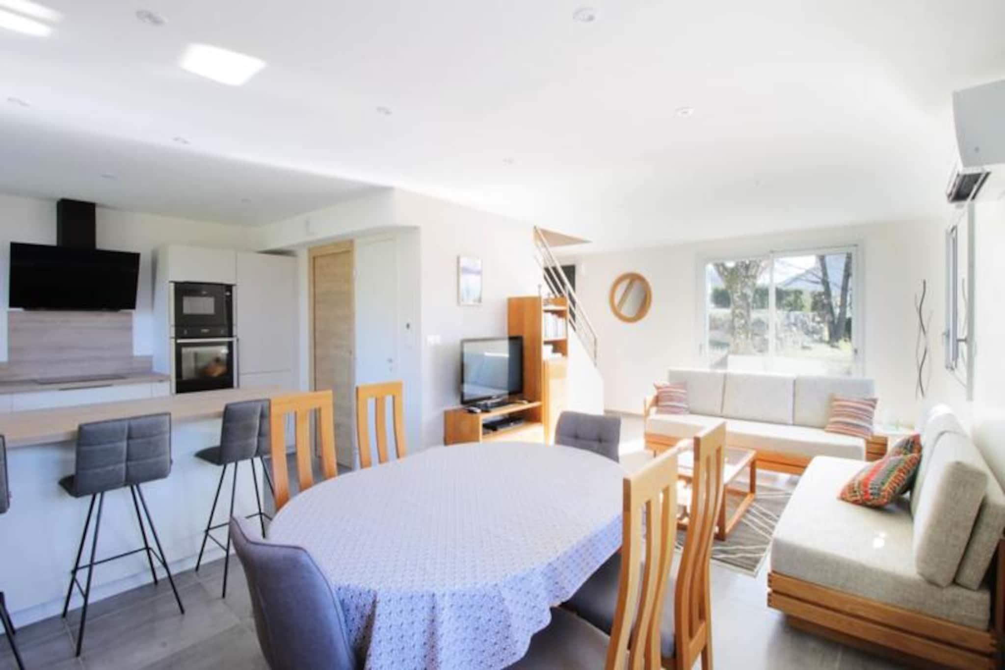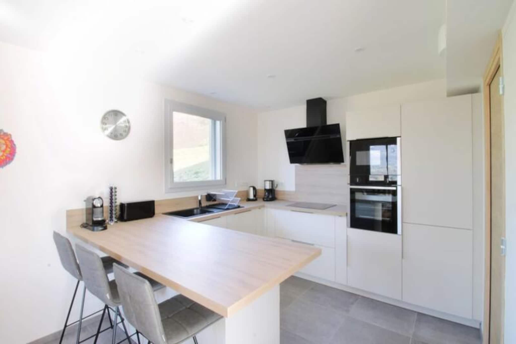 La deg forføre av dette vakre nye huset med alt nødvendig utstyr å bo i. et hyggelig og komfortabelt opphold: klimaanlegg, nytt og kvalitetssengetøy, 2 bad, terrasse! Mellom innsjøer, fjell og sjarmerende byer (Chambéry, Aix-Les-Bains, Annecy), vil du være perfekt plassert for alle typer sportslige, nautiske eller kulturelle aktiviteter! Array Huset ser slik ut: I første etasje kommer du direkte inn i den store åpne stuen og finner: - stue med sofaer, salongbord og flatskjerm-TV - spisestue med trebord og seks stoler - et moderne og meget velutstyrt kjøkken (kjøleskap med fryser, oppvaskmaskin, induksjonstopp, kaffemaskin av Nespresso-typen, filterkaffetrakter, brødrister, vannkoker, stavmikser...) med sats og 3 høye stoler Du finner også i første etasje: en garderobe, separate toaletter, et vaskerom med vaskemaskin og tørketrommel, samt et lite pantry med hvitevarer. raclette, crepe maker, vafler til kokeapparater... Ovenpå vil du ha 3 soverom og 2 bad: Soverom 1 type foreldre utstyrt med en queen-size 160 cm seng, et skap/garderobeskap og et bad med dusj og servantskap Soverom 2: queen size seng 160 cm som kan gjøres om til dobbeltseng. i to 80cm enkeltsenger (spesifiseres ved bestilling) og skap/garderobe Soverom 3: 140 cm dobbeltseng og kommode Selvstendig bad med dusj, servantskap og toalett. Utenfor, Du kan nyte spisestuen; uteservering (som vil bli installert til våren) på terrassen, ved siden av. skyggen av et stort tre! Du vil også ha nytte av en plancha. Eiendommen Den er ikke stengt, men du kan bruke kjeller dersom du ønsker å sikre deg sykler eller diverse utstyr. Vær oppmerksom på at for din komfort: - Sengetøy og håndklær leveres og settes opp - Inn- og utsjekkingstider kan være fleksible på forespørsel, bortsett fra ved krysset ankomst og avreise. - Huset har wifi internett - Du kan parkere 2 personer unna. 3 biler på den private utendørs parkeringsplassen. Huset ligger på de første høydene av Voglans, så du blir: - 5 minutter med bil fra Landiers kommersielle område, hvor; du kan shoppe og shoppe - Mindre enn 10 minutter med bil fra den praktfulle Lac du Bourget som er så kjær for poeten Lamartine, den største naturlige innsjøen i Frankrike, støtte for et bredt utvalg av nautiske aktiviteter (seiling, kitesurfing, vannski, roing, padling, cruise…) – - Mindre enn 20 minutter fra sentrum med bil fra byen Aix les Bains, Riviera des Alpes, dedikert til velvære og turisme med sine kulturelle og historiske steder, sine termalbad, sine spa, restauranter, kasinoer og sine internasjonale kjent 18-hulls golfbane (klubb 1895) åpen hele året hele året – - Mindre enn 15 minutter fra sentrum med bil til byen Chaméry, den historiske hovedstaden i Savoie, rik på en rik fortid. hertug og en stor arkitektonisk arv – - 40 minutter med bil fra Bauges Massif Regional Natural Park hvor du kan trene terrengsykling, fotturer, paragliding, treklatring med spesielt feriestedene Savoie Grand Revard (med La F&eac;claz) og Aillons-Margériaz – Før ankomst til overnattingsstedet vil du motta et velkomsthefte på e-post som inneholder diverse praktisk og turistinformasjon! Voglans ligger nær Chambéry-motorveiavkjørselen, så du vil være via det alpine motorveinettverket: - til 1 time fra Genève - til 1 time fra Lyon (50 minutter fra flyplassen) - til 45 minutter fra Grenoble - til 40 minutter fra Annecy - til 5 minutter fra den lille Chambéry flyplassen Paul og hans kone har valgt å legge ledelsen av boligen deres i våre omsorgsfulle hender og dermed tillate deg: - å stole på vår tilgjengelighet for å ønske deg velkommen eller hjelpe deg i tilfelle problemer under hele oppholdet. - for å dra nytte av concierge-tjenester når det passer deg. Noen, som er vant til perfekt ro, kan bli plaget av støyen fra veien som passerer i dalen nedenfor når de er på terrassen Innskudd (i euro) - 900