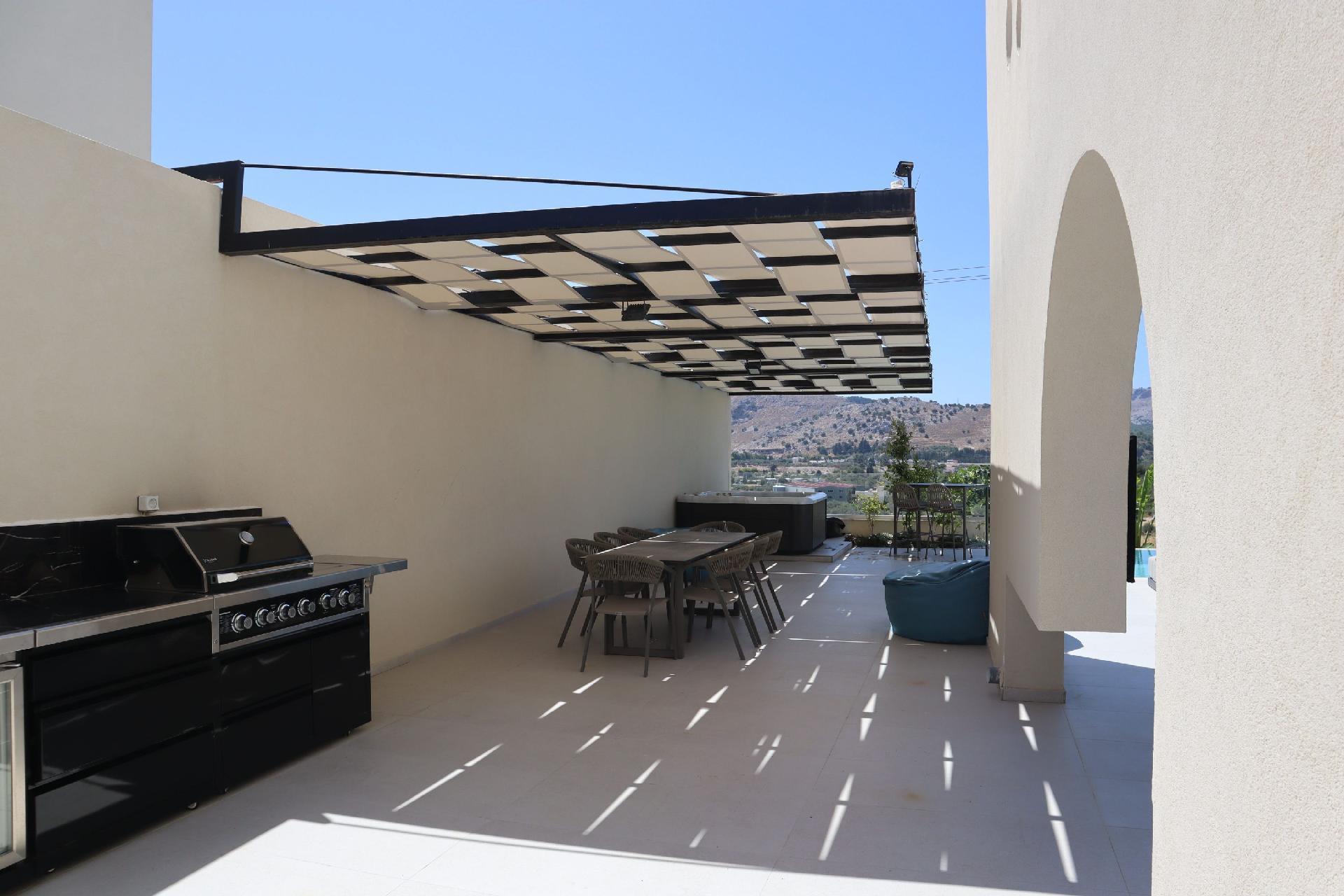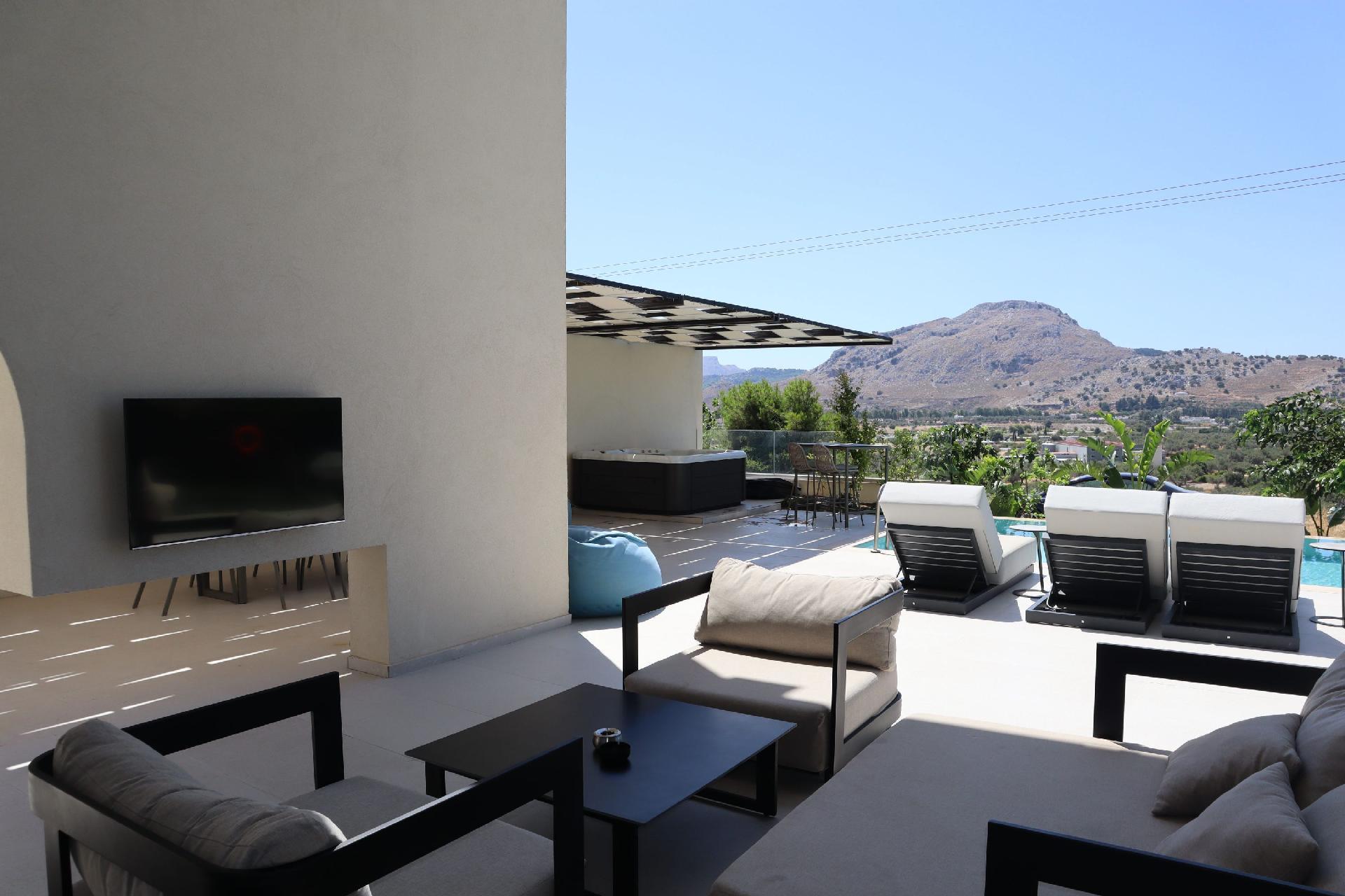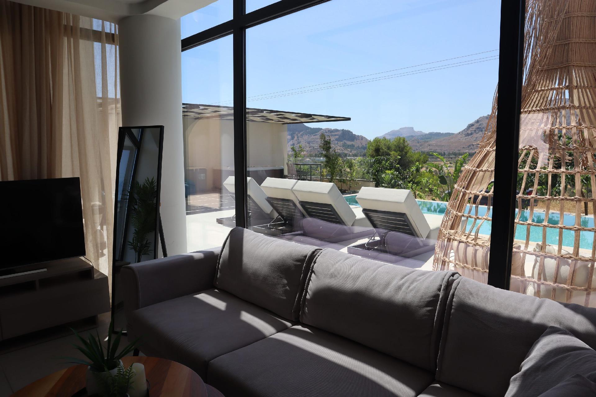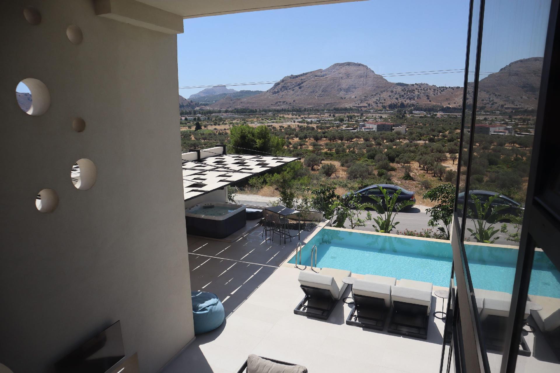 Welcome to the magic luxury living of Trapezia Villas. Trapezia Luxury Living boasts a stunning design that combines modern aesthetics with timeless elegance. Every detail is meticulously crafted to create a sophisticated and luxurious atmosphere. They offers expansive living spaces, including large living rooms, dining areas, and three fully equipped bedrooms with en-suite. The high ceilings and open floor plan enhance the sense of grandeur and provide ample room for relaxation and entertainment. All Trapezia villas are equipped with top-of-the-line amenities to ensure an unparalleled experience of luxury. From a fully-equipped outdoor gourmet kitchen to a private swimming pool and spa, every aspect of comfort and indulgence is taken care of. Trapezia Luxury Living is the epitome of opulence and sophistication, offering a truly exceptional living experience for those seeking the finest in accommodation.Type A villas are two floor luxury detached villas that hosts up to 6 guests.There are 3 fully air-conditioned bedrooms with unique decorations. All of the bedrooms offer ensuite bathrooms with a shower. There’s a fully equipped kitchen in warm colors, suitable for any meal preparation accompanied by the seating area and the living room. There’s a smart TV and free WIFI access throughout the property. Outdoors, there’s a private swimming pool and jacuzzi with sunbeds and a seating area where you can relax under the rays of the Aegean sun. The amazing outdoor kitchen with the dinning are promises memorable dinner’s under the Greek sky. You can spend your time by your private swimming pool or enjoy a fresh meal prepared in the BBQ installation. This amazing property and the beautiful location make the perfect match for a memorable stay and unforgettable holidays in Rhodes!