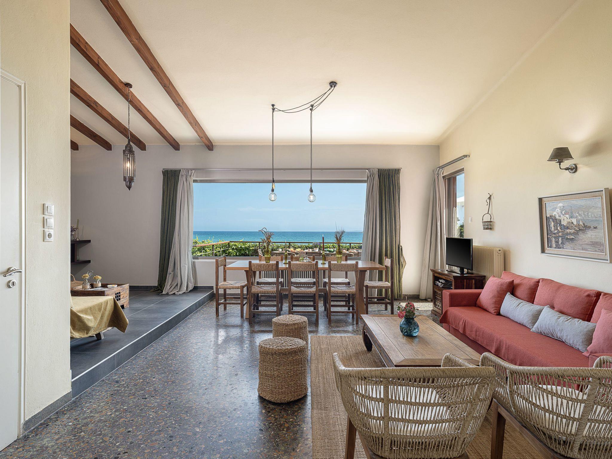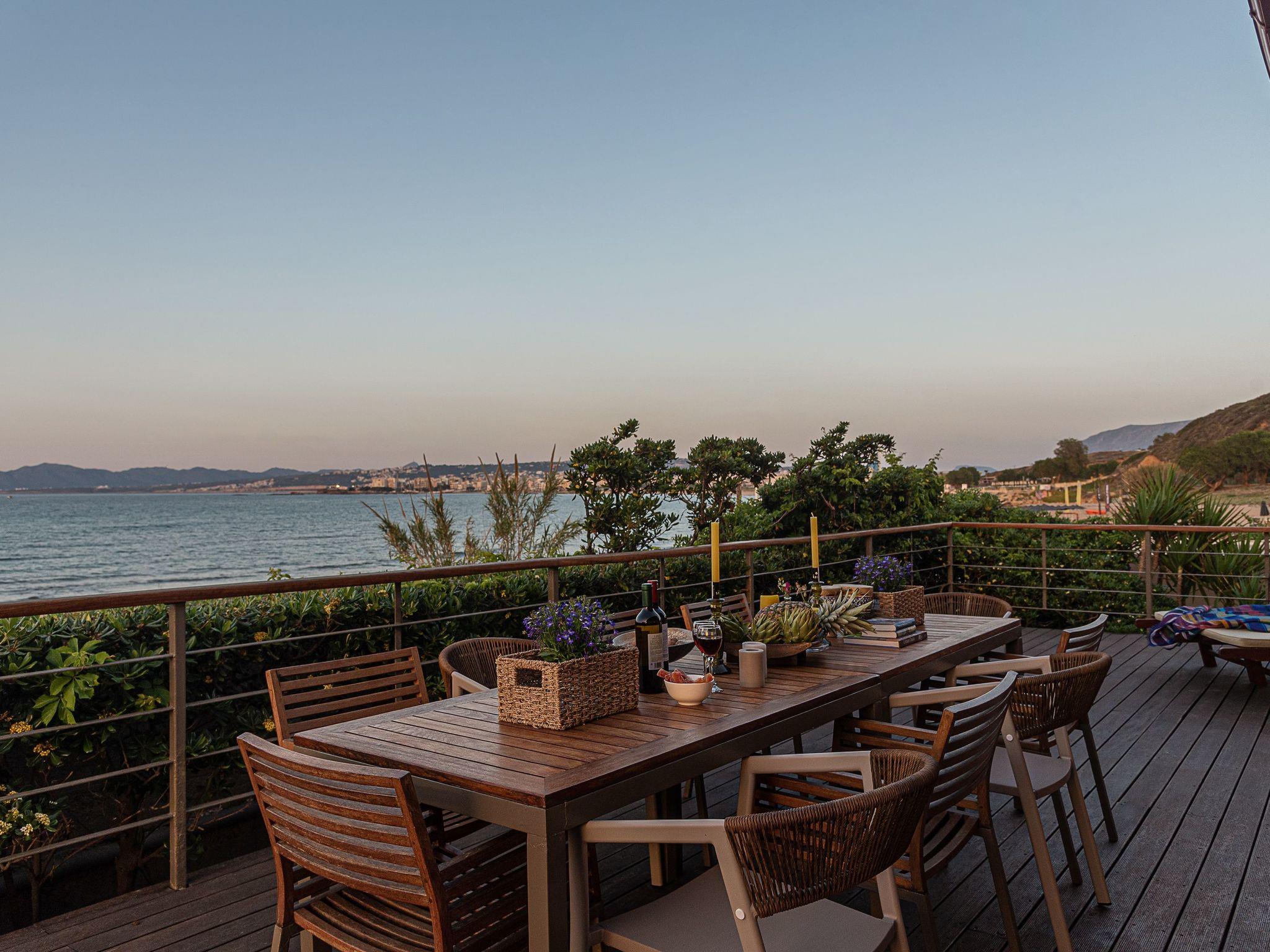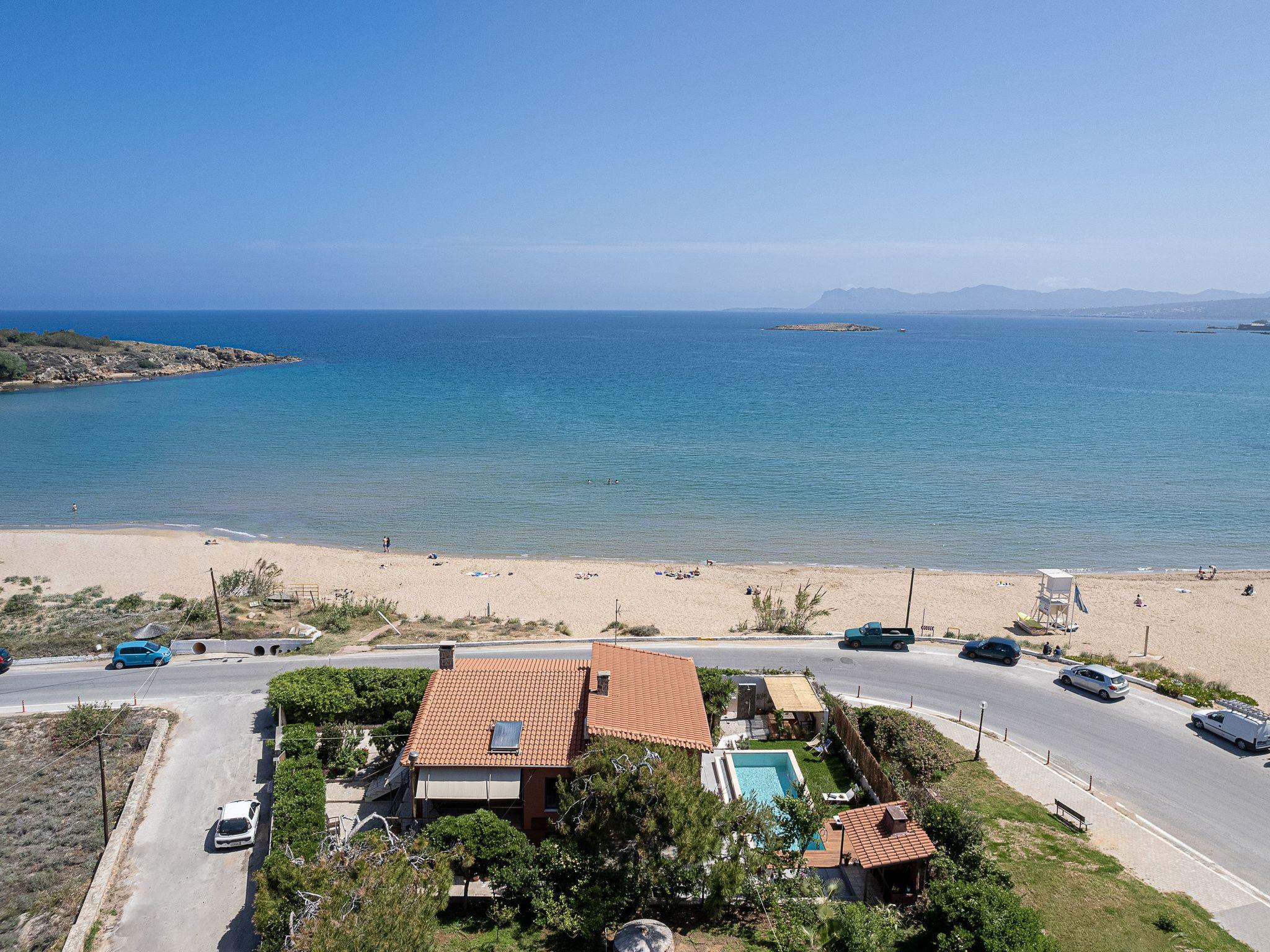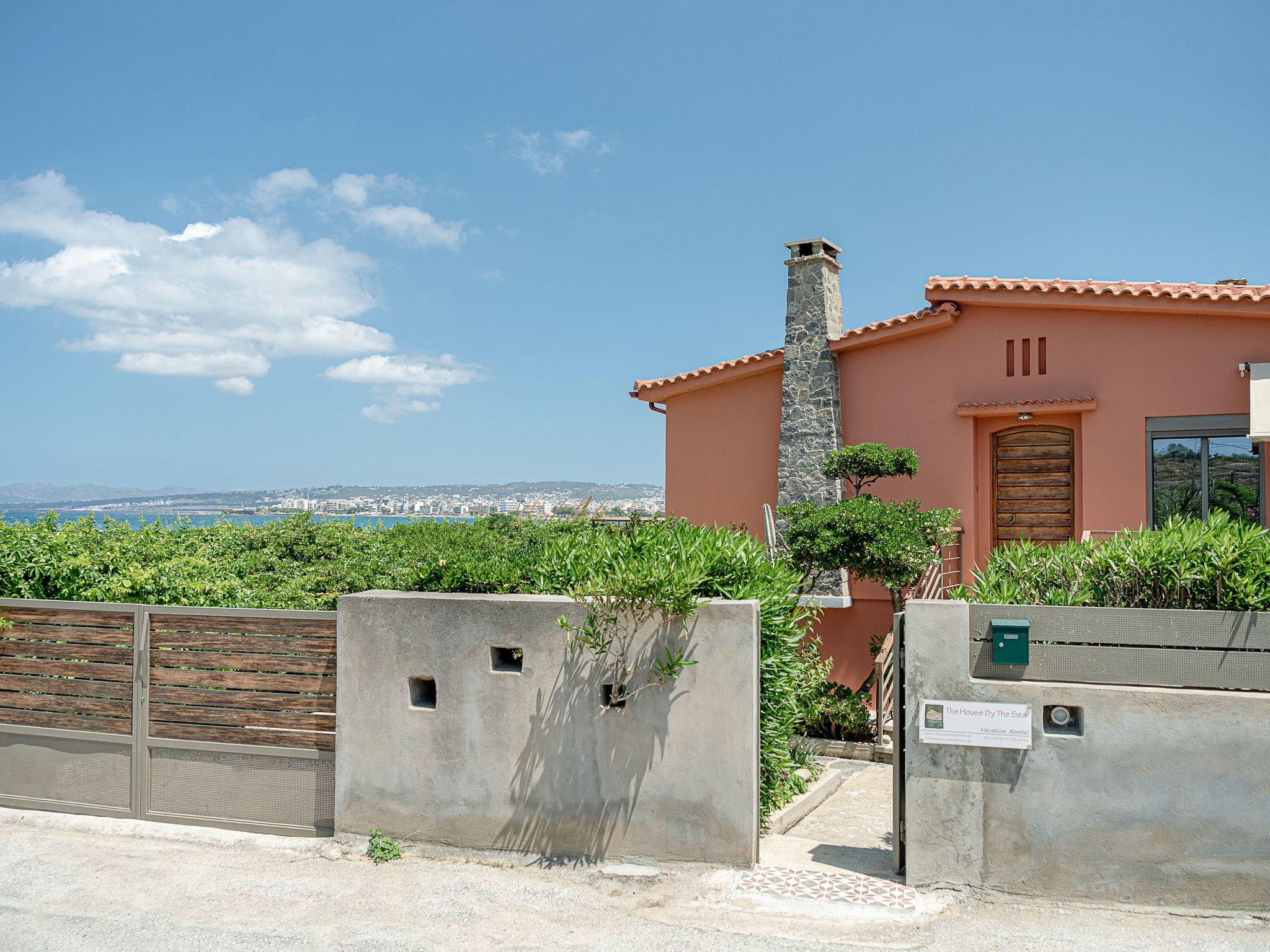 “The House by the Sea” - a stylish and relaxed family-friendly beach house near Chania in Crete, in a lovely position, situated behind the middle of Chrissi Akti Beach, only a few steps away from the sand..Designed to provide the ultimate in convenience and privacy, for a unique stay, this summer getaway is the perfect place for guests to escape the hustle and bustle of everyday life in a unique holiday ambience.From most of the spacious rooms the panoramic views across the Mediterranean sea, to the small island of Lazaretta and the town of Chania, is breathtaking. The traditional main building, is strategically located area, just in the front of the sandy beach and has been carefully renovated to preserve its character.There are two apartments with a shared courtyard and garden and rented together.The whole villa can be booked only by one guest, one family, or two friend-families or relatives, but only by one booking.Both apartments are furnished and decorated with romantic style. The prospect of a totally relaxing holiday in Crete close to nature is completed by the beach, patio and garden. Scheduled flights to Athens arrive daily from just about everywhere. You can then either fly on to Crete or take the overnight ferry. Aegean Air is generally a bit cheaper than Olympic for the domestic hop Athens-Chania, and you can book online.We can arrange for a taxi or hire car to meet you at Chania airport or Souda ferry port.Chania airport is about 30 minutes drive from Chrissi Akti Ferries:If you fly to Athens airport there is a bus to Piraeus (the port of Athens) which takes about an hour, or you can take a taxi. Make sure your flight arrives in time to get to the port.The ANEK line ferries usually leave Piraeus at 21.00 and arrive at Souda (The port for Chania) at 05.30 am the next day. The return ferry leaves Souda at 21.00 and arrives at Piraeus at 05.30.They are very comfortable and you can book a cabin.Souda is about 10 minutes' drive from Chrissi Akti.Walking from the house to Chania town:Continue along the beach of Chrissi Akti, through Aptera beach, continue along the beach of Nea Chora and arrive at the Firkas Fort in the Old TownIt is a very nice bike ride.Finding us by busBuses start at “Nea Katastimata” square, and it is about 10 minutes' ride to the house.The bus stop in Chrissi Akti is 50m from the house (Chrissi Akti station)