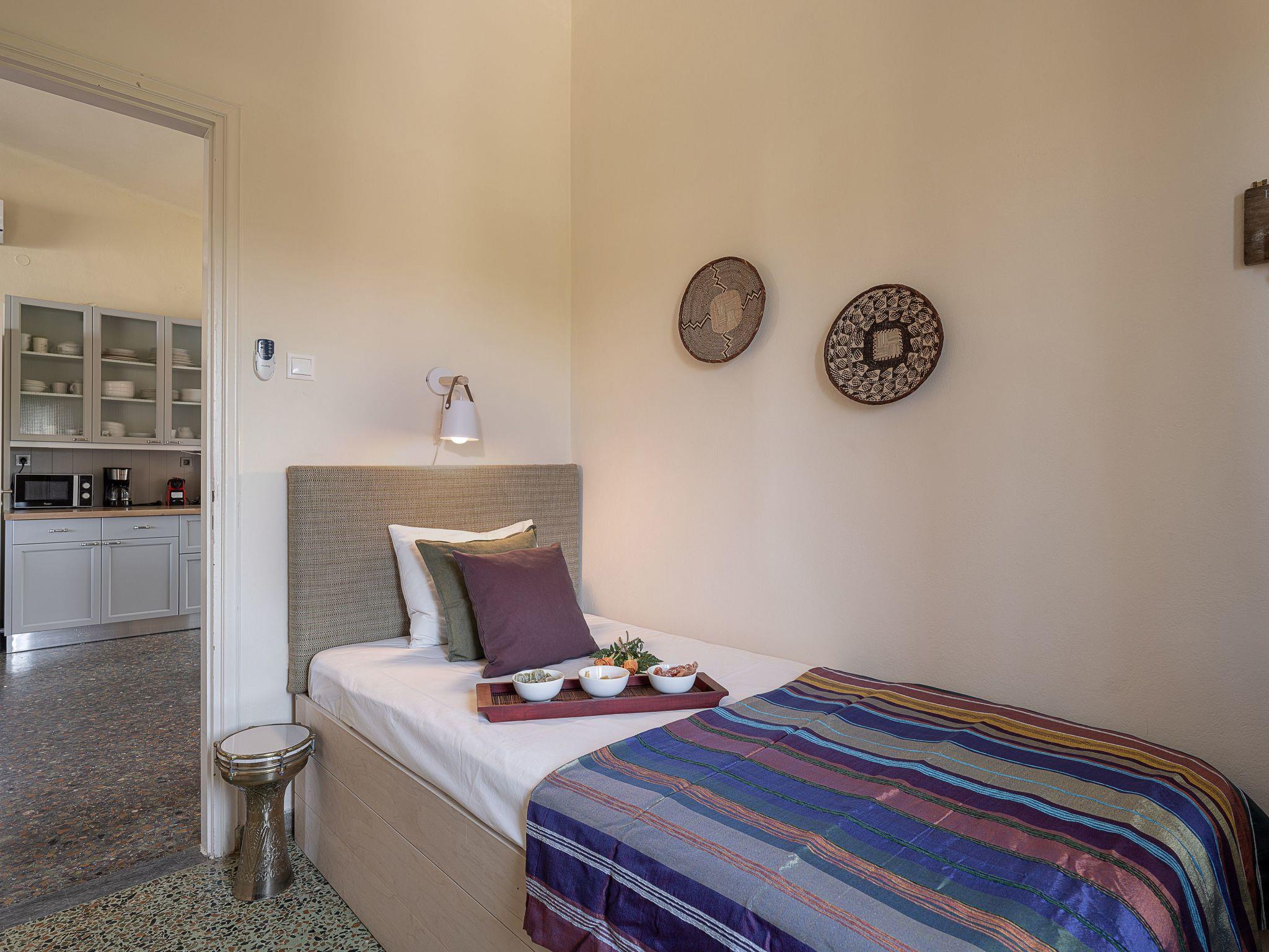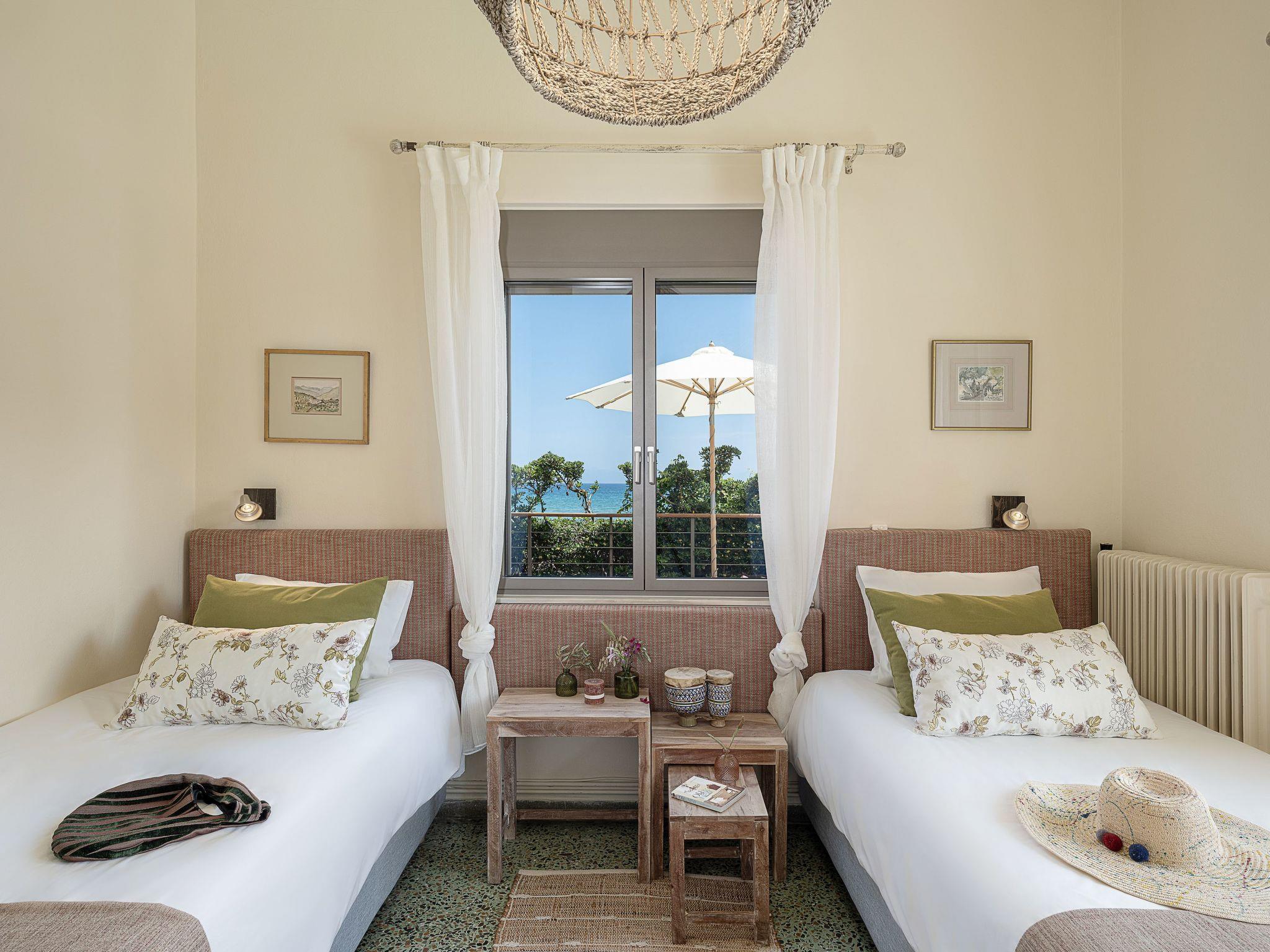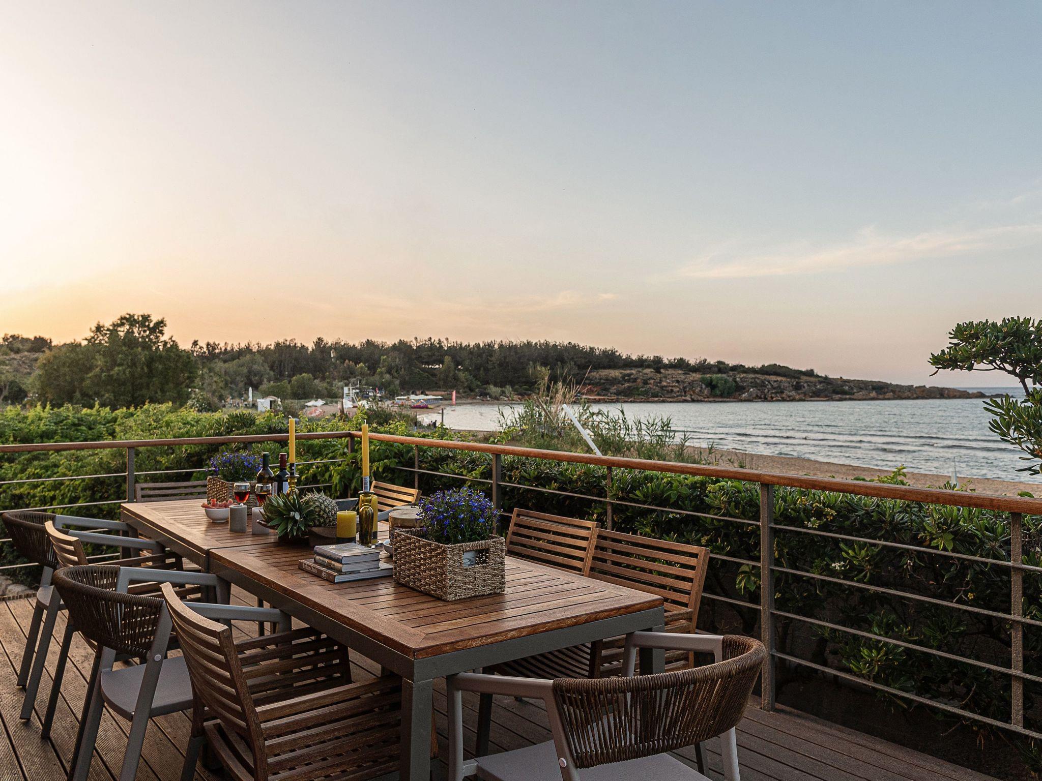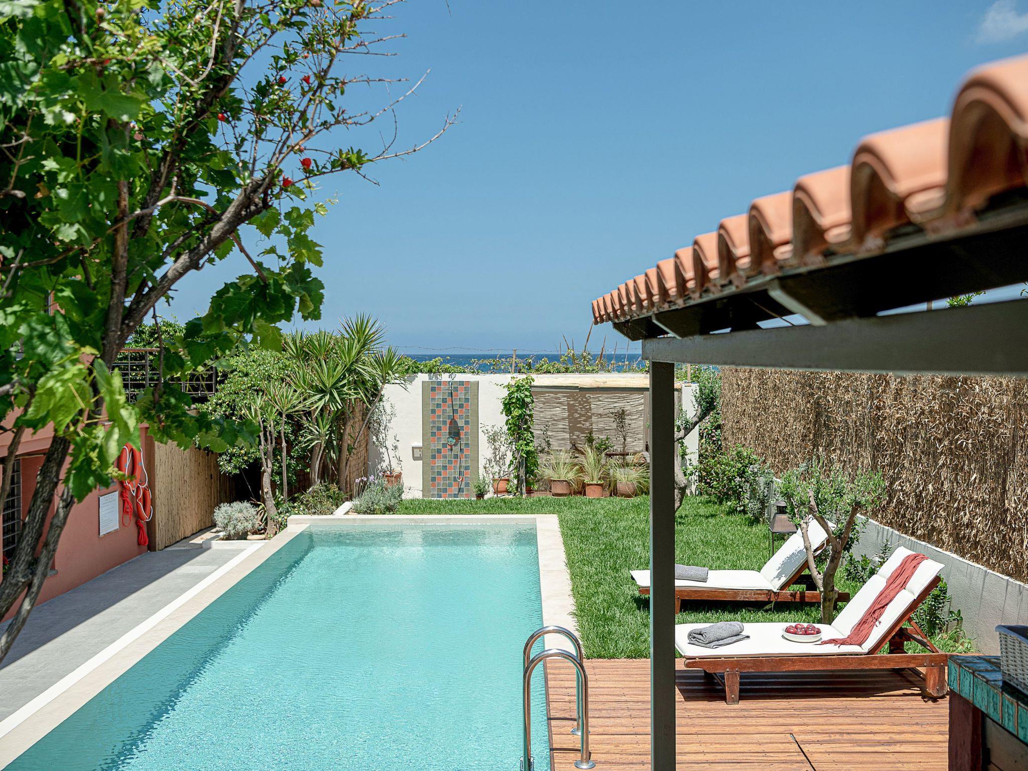 “The House by the Sea” - a stylish and relaxed family-friendly beach house near Chania in Crete, in a lovely position, situated behind the middle of Chrissi Akti Beach, only a few steps away from the sand..Designed to provide the ultimate in convenience and privacy, for a unique stay, this summer getaway is the perfect place for guests to escape the hustle and bustle of everyday life in a unique holiday ambience.From most of the spacious rooms the panoramic views across the Mediterranean sea, to the small island of Lazaretta and the town of Chania, is breathtaking. The traditional main building, is strategically located area, just in the front of the sandy beach and has been carefully renovated to preserve its character.There are two apartments with a shared courtyard and garden and rented together.The whole villa can be booked only by one guest, one family, or two friend-families or relatives, but only by one booking.Both apartments are furnished and decorated with romantic style. The prospect of a totally relaxing holiday in Crete close to nature is completed by the beach, patio and garden. Scheduled flights to Athens arrive daily from just about everywhere. You can then either fly on to Crete or take the overnight ferry. Aegean Air is generally a bit cheaper than Olympic for the domestic hop Athens-Chania, and you can book online.We can arrange for a taxi or hire car to meet you at Chania airport or Souda ferry port.Chania airport is about 30 minutes drive from Chrissi Akti Ferries:If you fly to Athens airport there is a bus to Piraeus (the port of Athens) which takes about an hour, or you can take a taxi. Make sure your flight arrives in time to get to the port.The ANEK line ferries usually leave Piraeus at 21.00 and arrive at Souda (The port for Chania) at 05.30 am the next day. The return ferry leaves Souda at 21.00 and arrives at Piraeus at 05.30.They are very comfortable and you can book a cabin.Souda is about 10 minutes' drive from Chrissi Akti.Walking from the house to Chania town:Continue along the beach of Chrissi Akti, through Aptera beach, continue along the beach of Nea Chora and arrive at the Firkas Fort in the Old TownIt is a very nice bike ride.Finding us by busBuses start at “Nea Katastimata” square, and it is about 10 minutes' ride to the house.The bus stop in Chrissi Akti is 50m from the house (Chrissi Akti station)