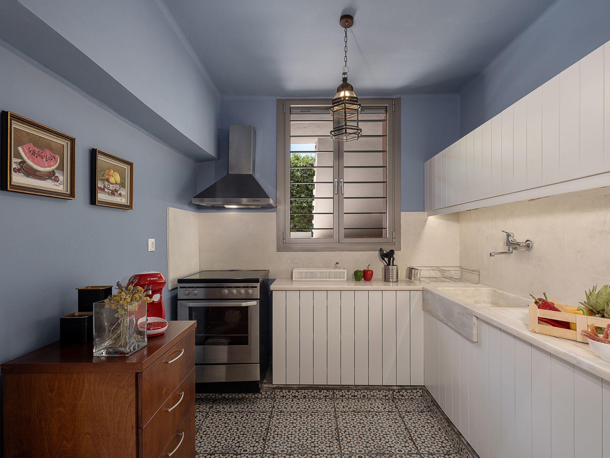 Sea view house (120 sq.m, 10 stairs up, sleeps 5 )Three bedrooms offer plenty of light and an airy atmosphere with most of the rooms boasting views of the sea and the garden. Interiors are large, light and spacious with furnishings displaying a mix of traditional Greek and modern facilities. The lovely sitting room has a large bay window seat to take advantage of the sandy beach and sea view. The entrance leads to the dining room and living room, equipped with a fireplace, which adds an antique touch to the otherwise modernized house. Thick stone walls provide an authentic backdrop whilst keeping the house cool during the warm summer months. Outside, a sun lounge area - yacht style wooden deck - overlooks the beautiful sandy beach, the ideal place to enjoy warm summer afternoons. There are two verandas with excellent view. The Sitting / Dining RoomA lovely bright spacious room with a large bay window offering stunning views out to the sea/garden/ countryside/ Chania town, with two sitting areas, fireplace and the dining area. (It also features a double sofa-bed. TV, DVD player, video and CD/radio). A classic cosy dining room with eight comfortable dining table seats. The KitchenFully equipped modern light kitchen with all appliances for a comfortable stay (refrigerator, electric oven and ceramic hob, coffee maker, toaster, juicer, dishwasher, and independent heating system for the winter.)