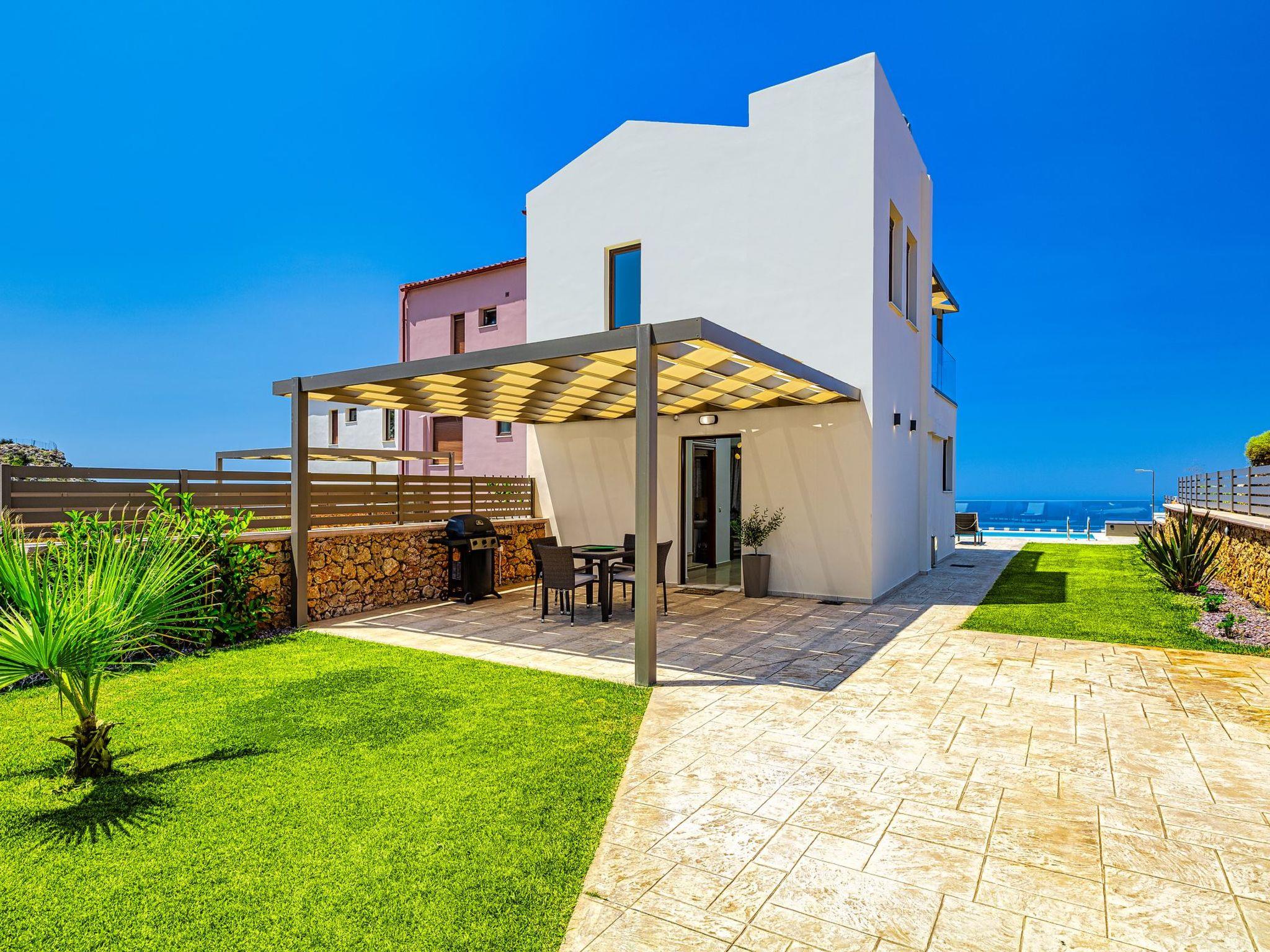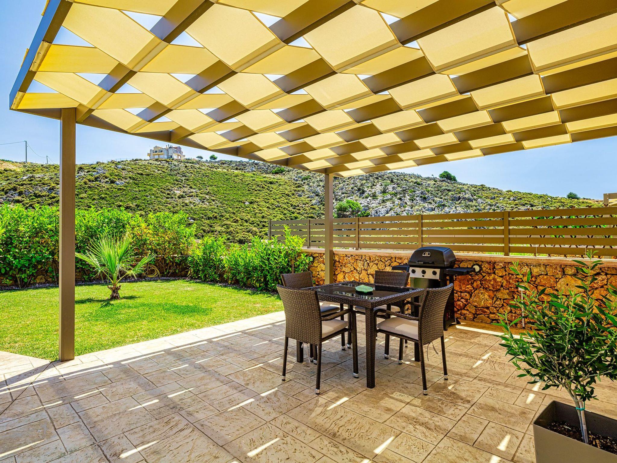 The front side of the villa features an external garage door, serving as the entrance and a secure parking space for one car. In this area, there's a pergola with an outdoor dining table for four, a gas barbecue, and a lawn.