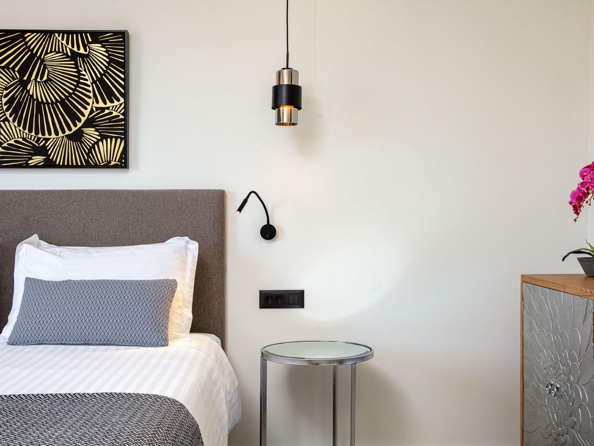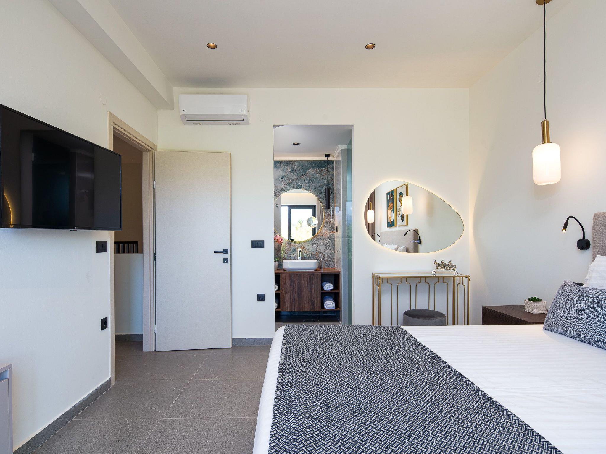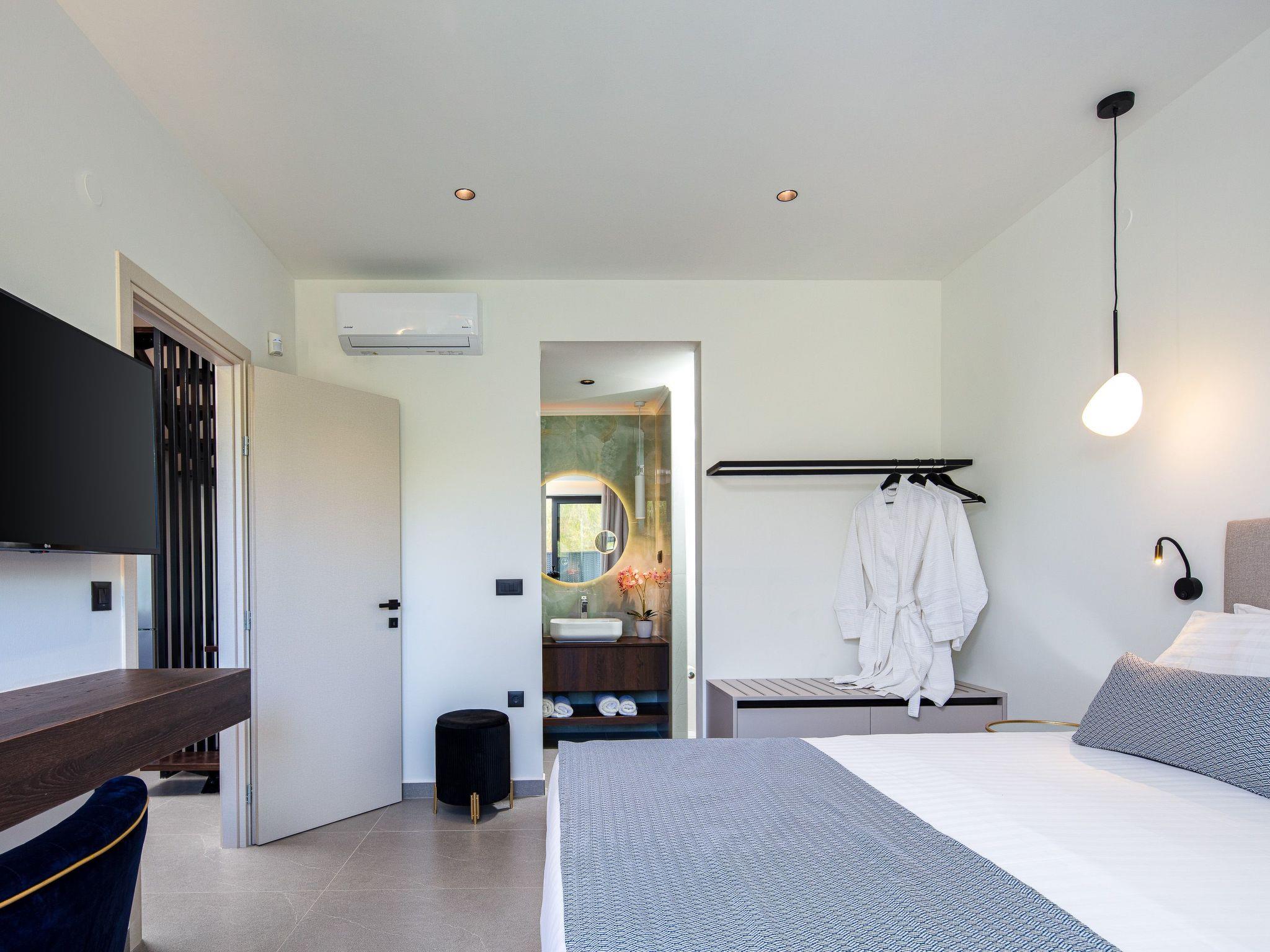 On the same level, Bedroom 1 offers a king-size bed (1.80 x 2.00m) with a high-quality Coco-Mat mattress, air conditioning, a 44’’ Smart TV, an ensuite bathroom with a walk-in shower, and direct access to the pool.