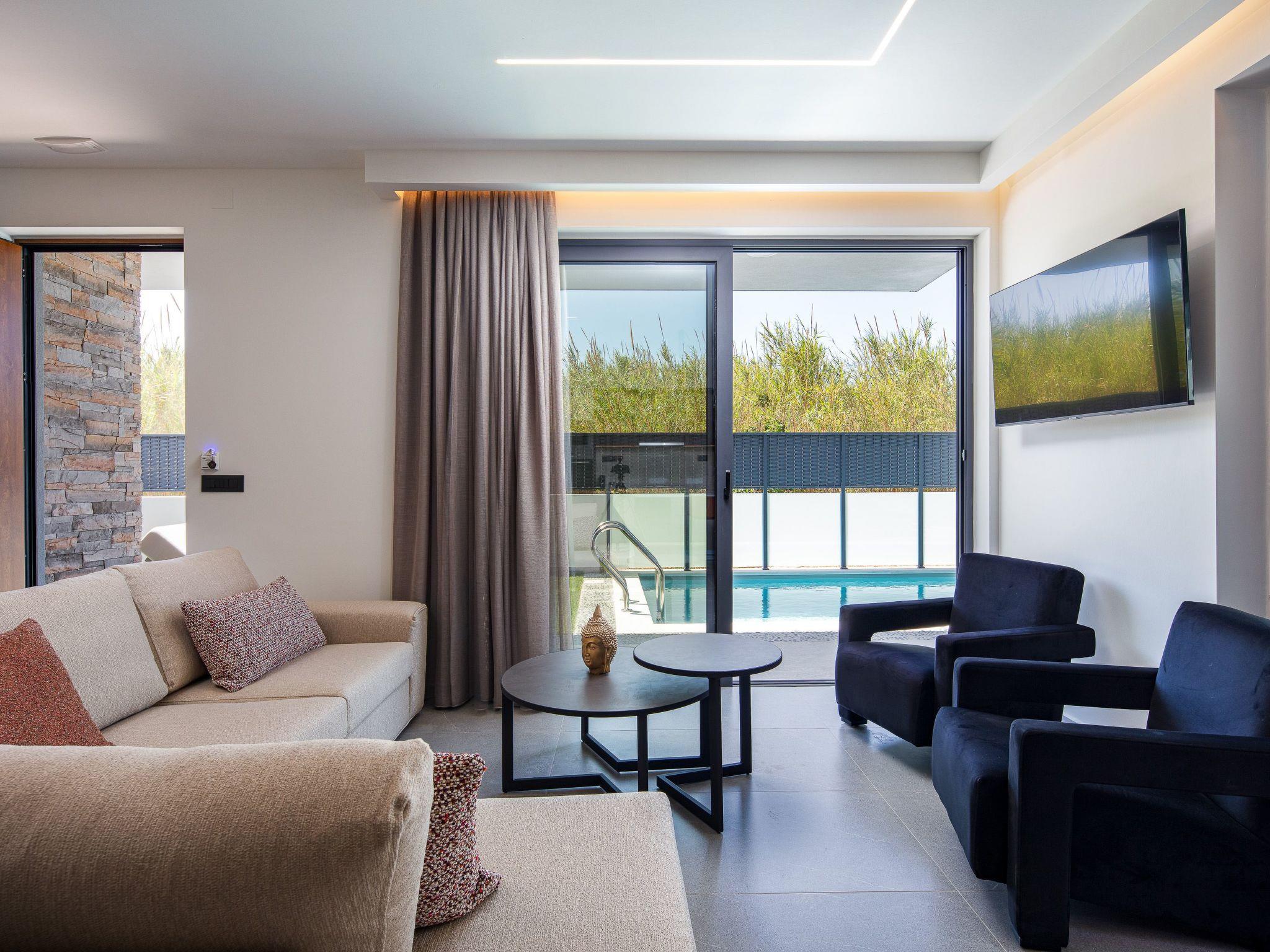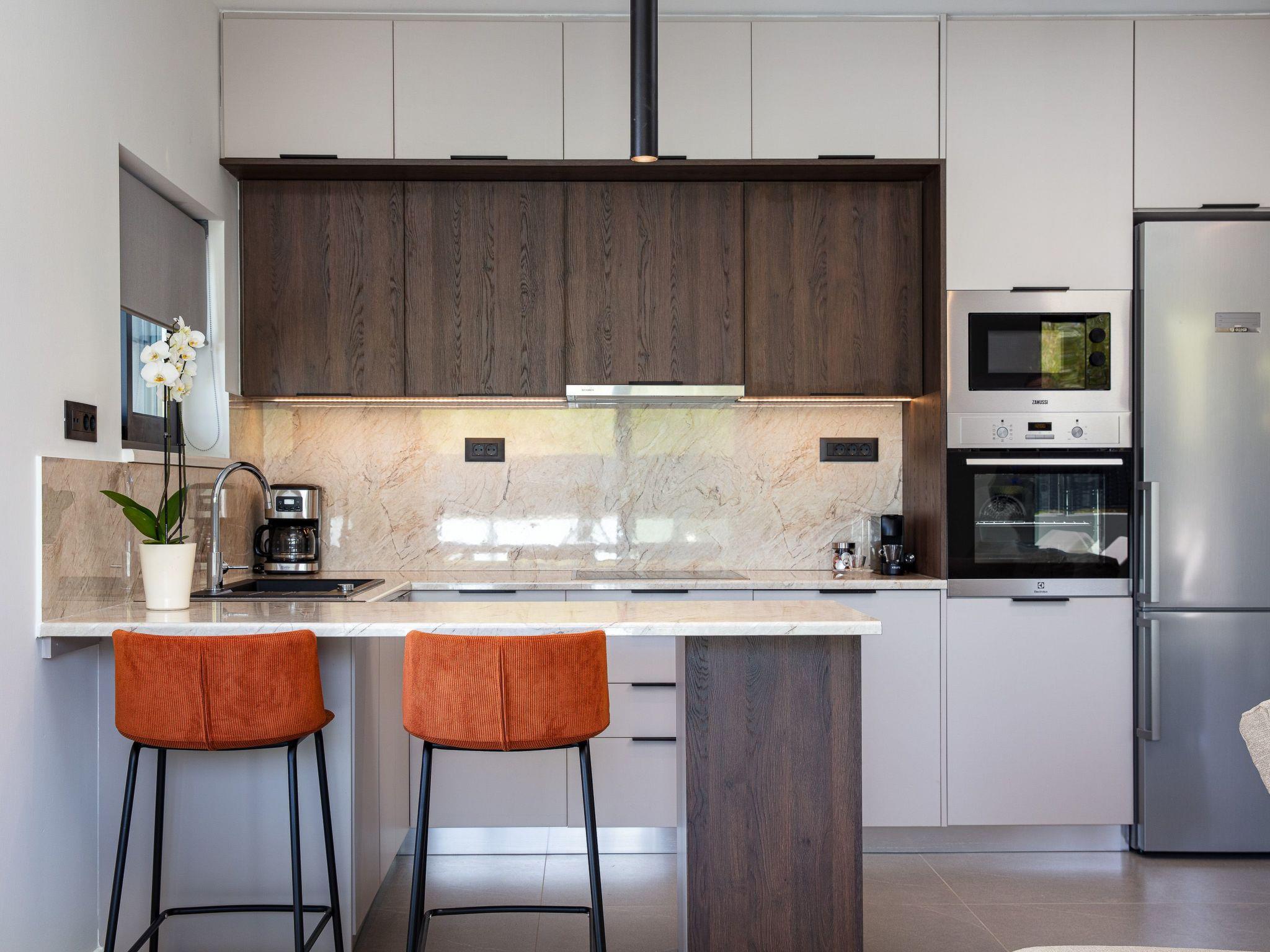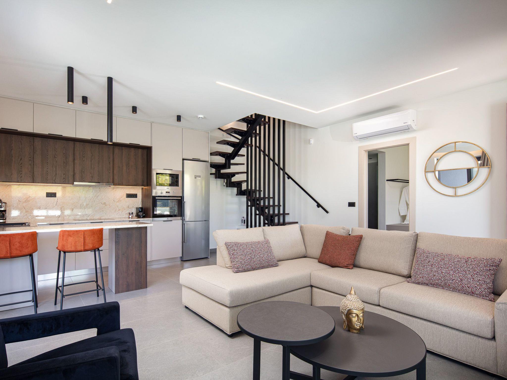 The ground level features a bright open-plan living area with minimalist design and warm neutral tones. The space includes a comfortable sofa, a 50’’ Smart satellite TV, and a Bluetooth speaker, making it ideal for relaxed gatherings. Large glass doors offer seamless access to the pool area, creating a fluid indoor-outdoor living experience. The adjacent fully equipped kitchen includes all modern appliances and a kitchen island with 2 bar stools for casual dining.