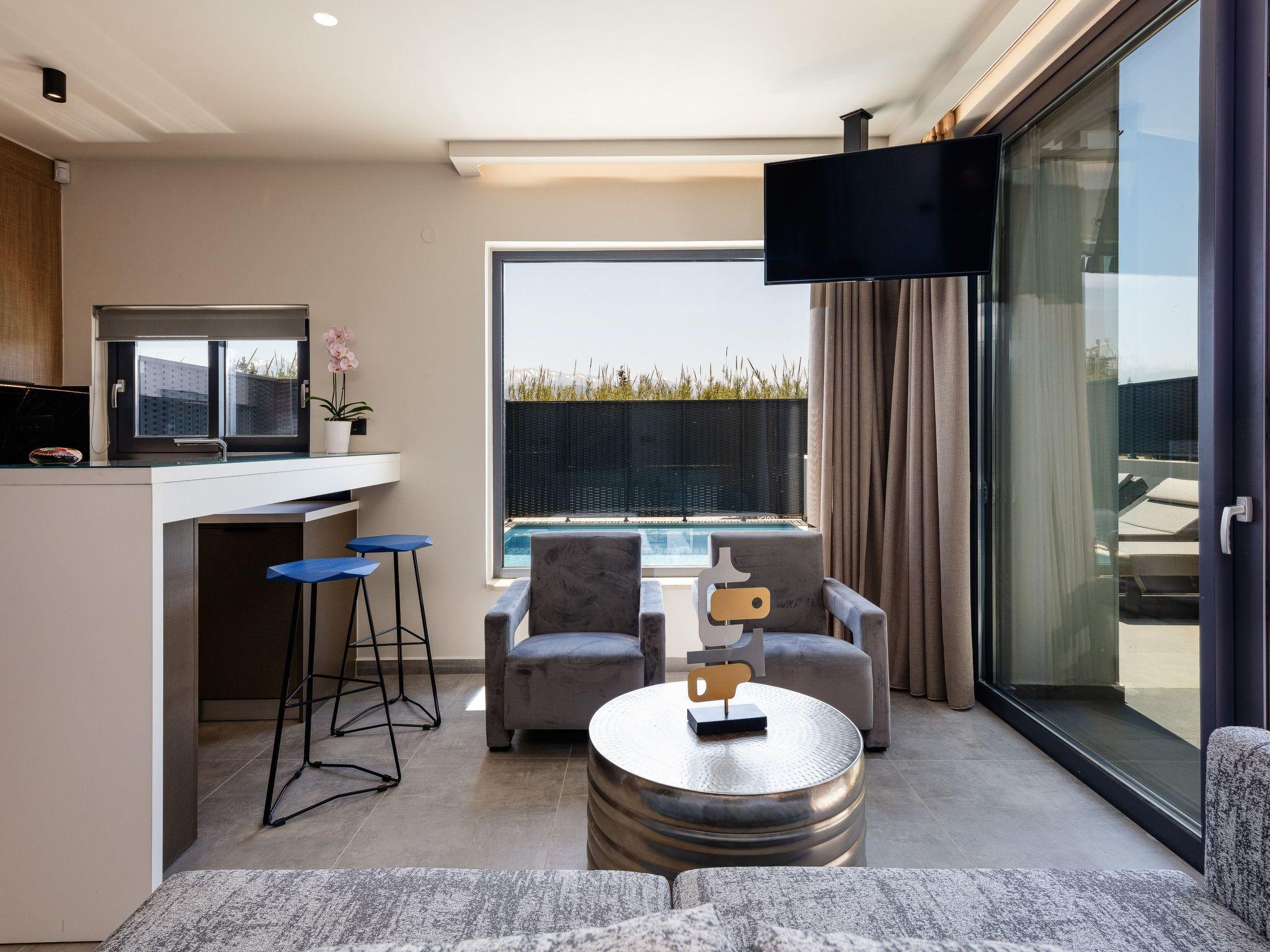 Tucked away in the vibrant heart of Chania’s touristic district, VillAgioi Villa III is a chic and modern two-level villa designed for effortless holiday living. Ideal for families or small groups, this 80 sqm retreat blends contemporary comfort with a resort-style atmosphere—just 450 meters from the beach, cafés, tavernas, and the lush Agii Apostoli municipal park. With its stylish interiors, private pool, and fully equipped outdoor kitchen, VillAgioi Villa III promises a car-free, relaxing holiday experience.