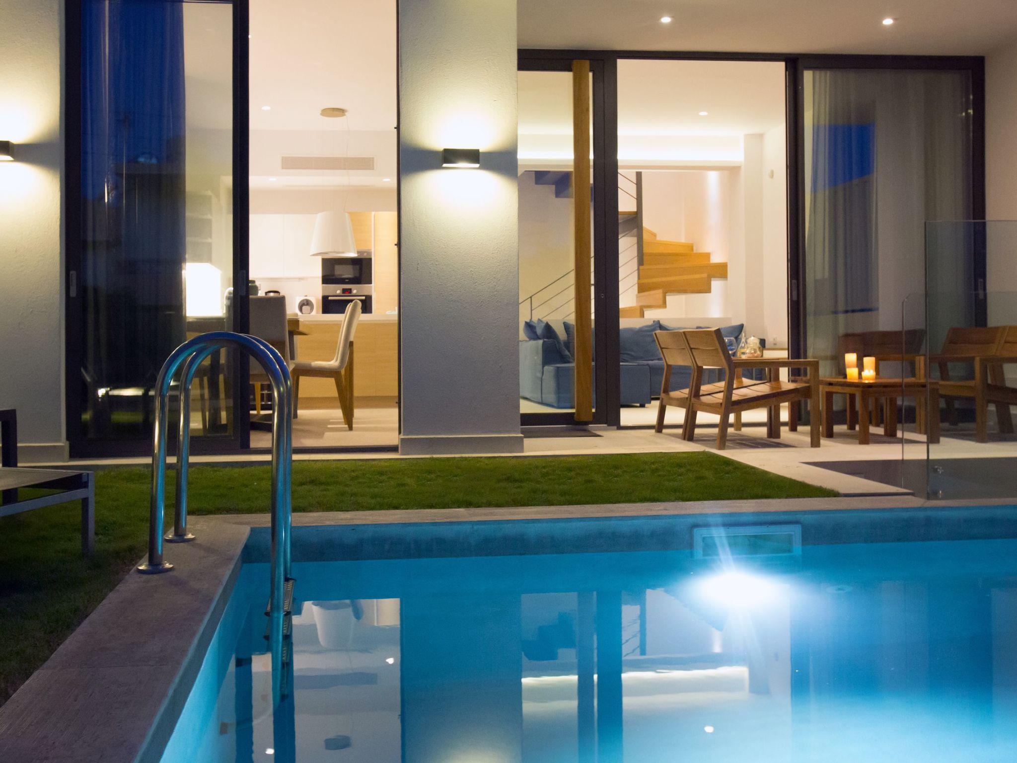 Stylish newly built villas ‘’S & K’’ are 2 villas next to each other, 200m from the only sandy beach ‘Kalamaki’ that is so close to Chania town. Modern architecture, beautiful furniture and high standard quality materials have been put in this villa for you to enjoy. You owe it to yourself after a tiring year to have some private and relaxing time with your friends or your family. Plan your perfect vacation in this villa, only 6 km from the Venetian port of Chania, a city well known for its narrow shopping streets and waterfront restaurants. The villa is for 8 people but can accommodate up to 10 and it has 200 square meters of living space.Outside of the villa you can find a small private pool with sun loungers, umbrellasand sea views. It has four bedrooms with satellite TV which 3 of them are with en suite/bathrooms with shower.At ground level there is a living room and a dining area. Next to it there is one bedroom and another at the upper floor with a hydro massage and a private balcony. On the same floor there is a twin bedroom with private balcony and there is a master bedroom at the lower floor of the villa. The kitchen is fully equipped with anything you might need for your meal preparation, there is a laundry room and the younger members of your company will have fun at the media room and playroom with free WIFI available in the villa. If you have a car, you can lock it up at the garage with one car space and direct entry access to the lower floor of the villa.