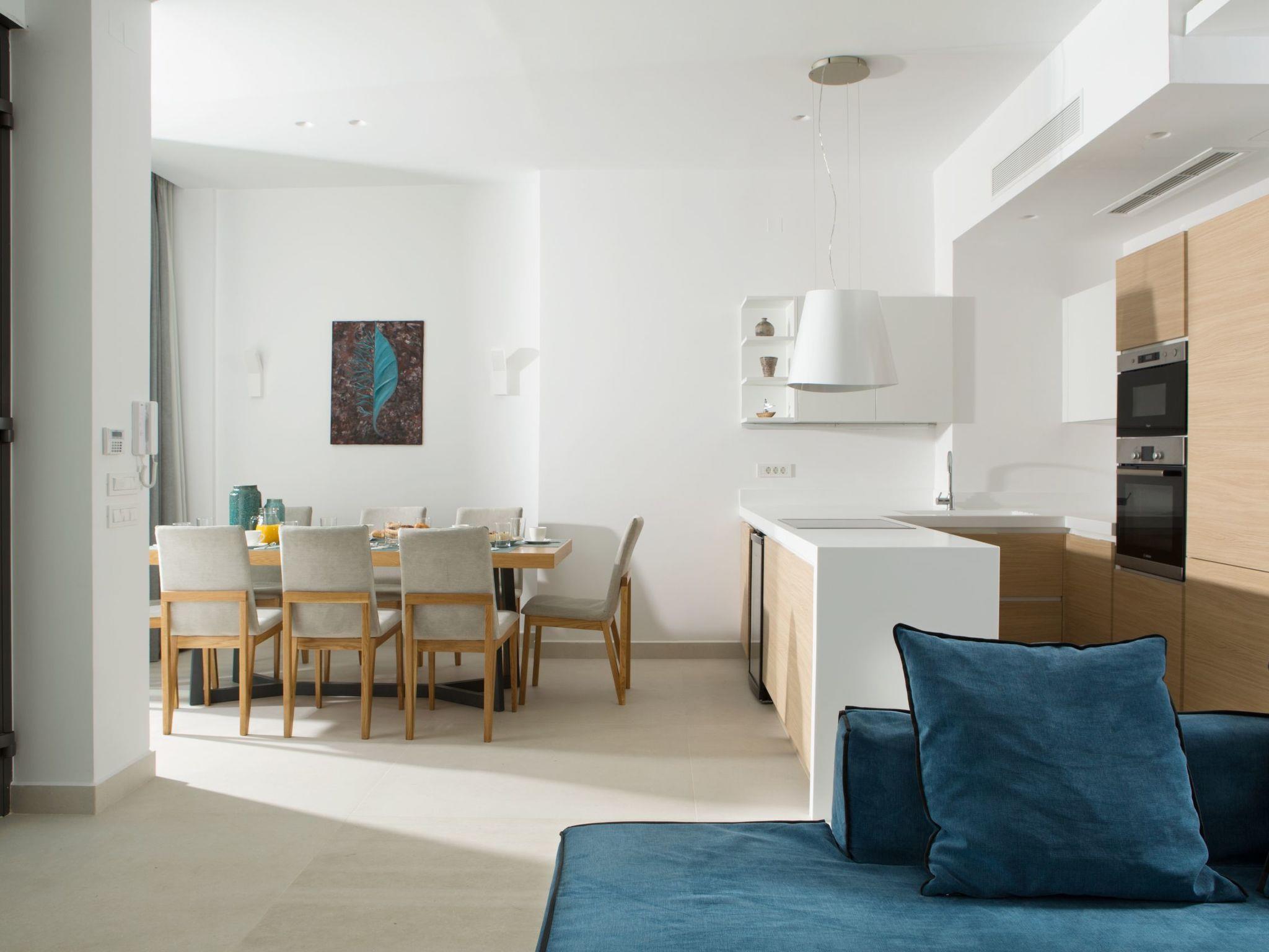 Living room with large windows (5m high) with SMART TV, boarding games, high quality furniture, a dining table with comfortable chairs, a fully equipped high standard kitchen with microwave, washing machine, filter coffee, espresso machine etc.