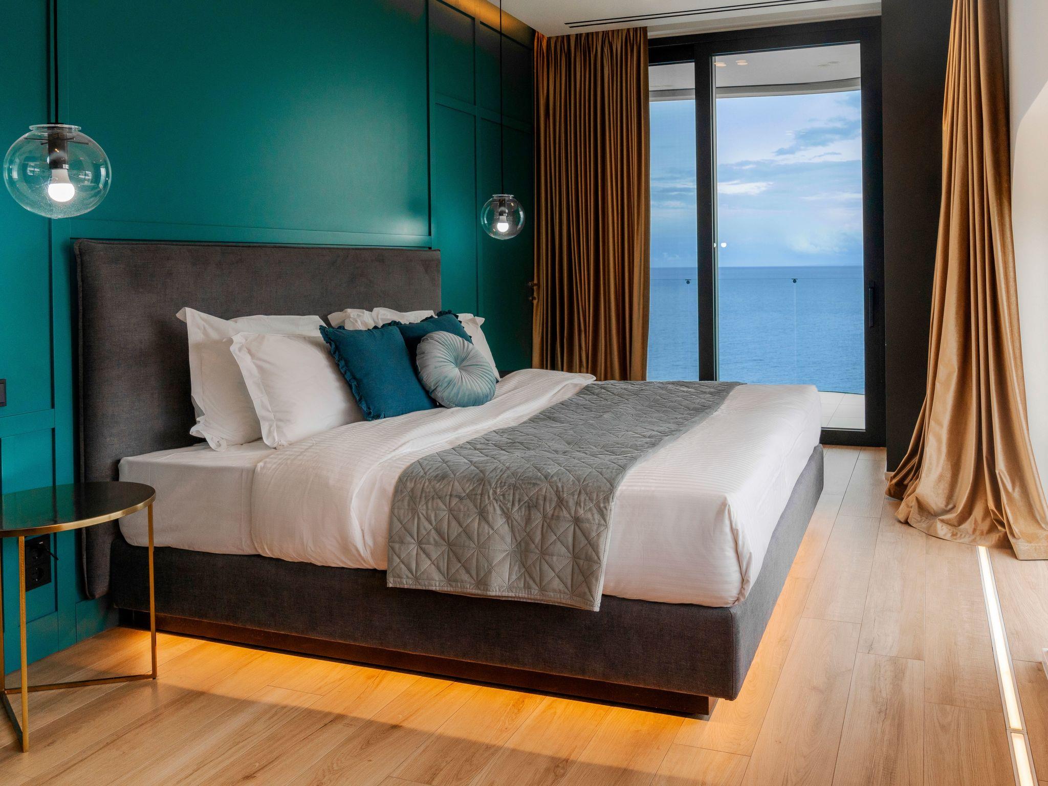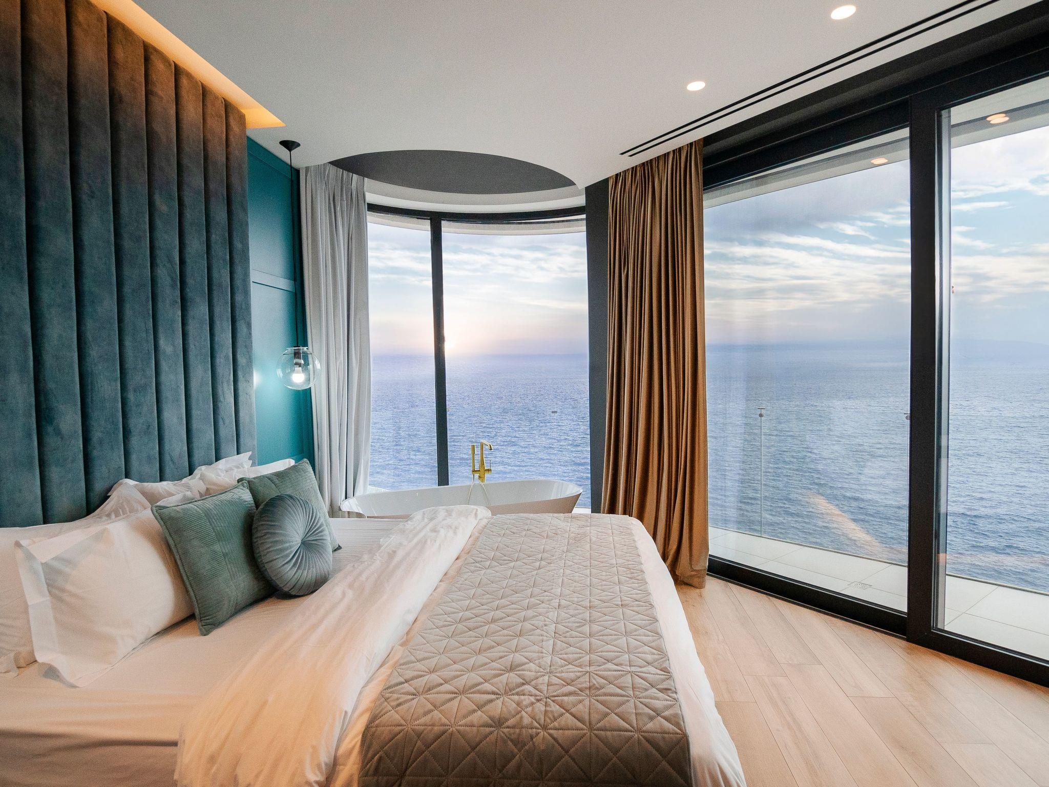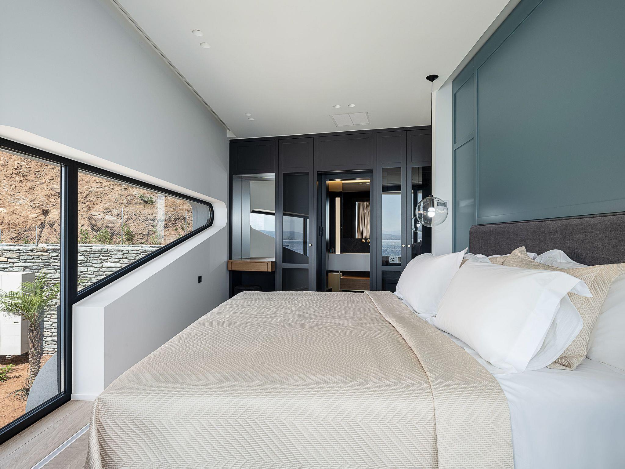 Within the interior, this lavish abode is thoughtfully furnished to ensure the utmost comfort and convenience. A generous living room anchors the ground floor, featuring a cozy fireplace, plush sofa, and a TV, all complemented by a large dining table. The kitchen is fully equipped to cater to all culinary needs. The villa hosts six well-appointed bedrooms, each designed to provide an oasis of tranquility. Two master bedrooms offer king-size beds, private bathrooms with luxurious bathtubs, and spectacular sea views from expansive balconies. Additional bedrooms are meticulously arranged, including one with a unique underground setup boasting a private kitchen.