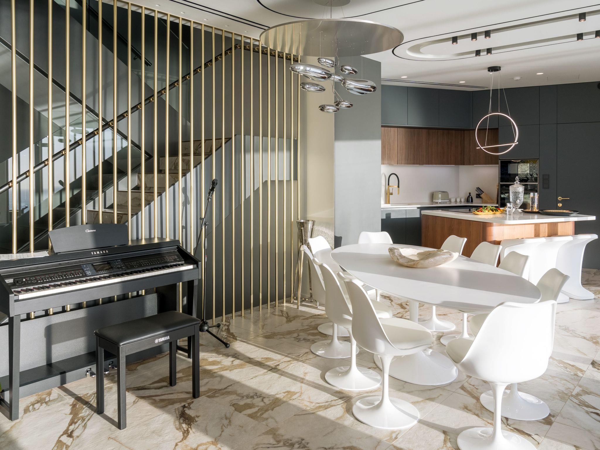 Transitioning to the exterior, the villa seamlessly integrates indoor and outdoor living through massive sliding windows that connect the living space with a captivating pool area. This transformative design not only invites natural light but also creates a sprawling space ideal for social gatherings. The pool area serves as a prime spot to relish the panoramic views of the bay, especially alluring during sunrise or as the night city lights flicker across the water.