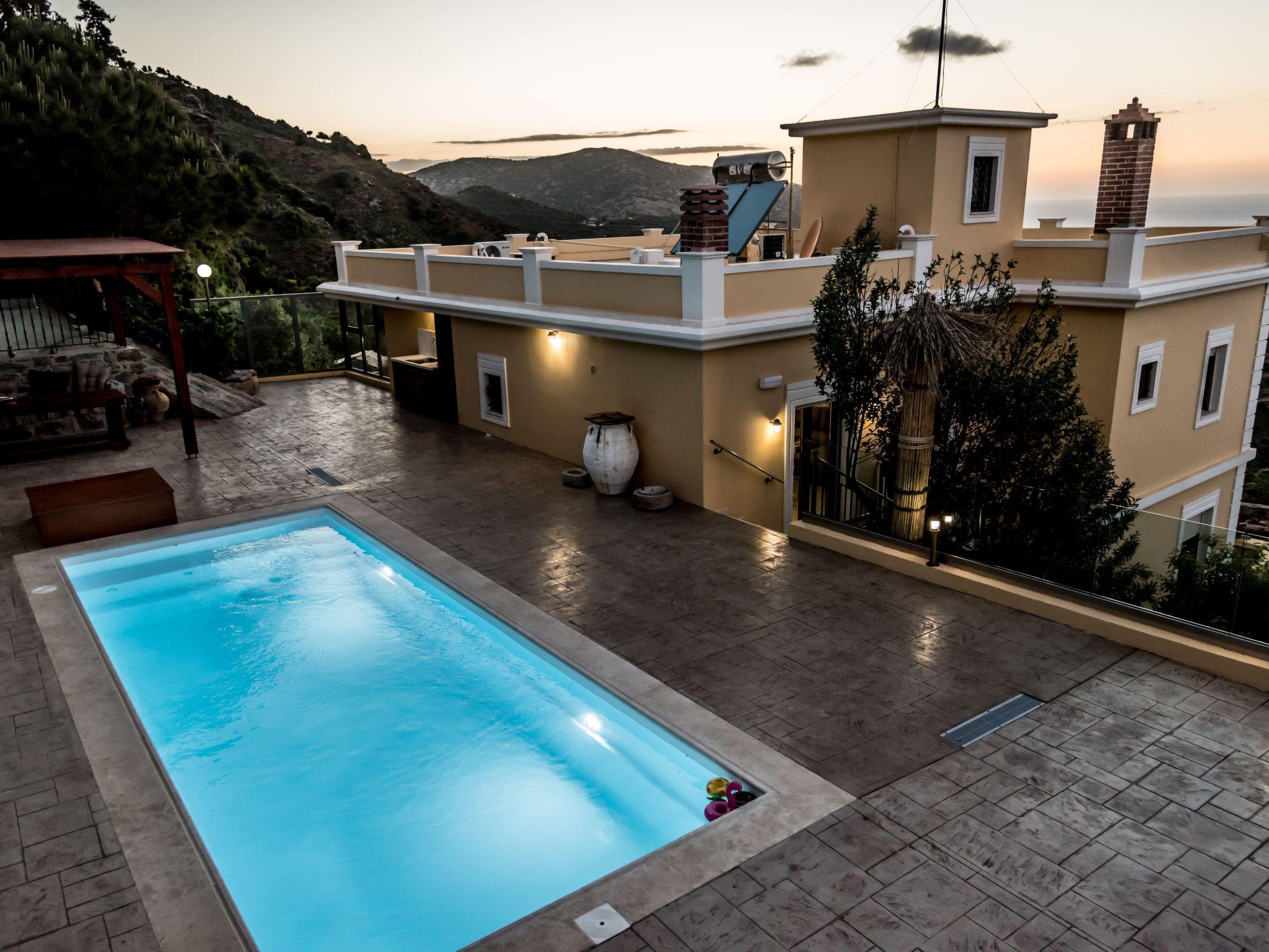 Set on the mountain side with a magnificent view of the village of Agia Pellagia (also known as Ancient Apollonia, as used to be the location of a temple dedicated to God Apollo) together with the sea makes of an idyllic vista on both sea and mountain. Road is rural and mountainous with turns and ups , perfect for hikers and nature lovers alike , be sure to have a good car though. The villa is at the end of the road with no other properties around, ensuring your recluse and an ideal escape from crowded cities and noise. Sunsets and sunrises are a spectacle to behold, and when the weather is just right, a multitude of hues awaits you in the setting sky.