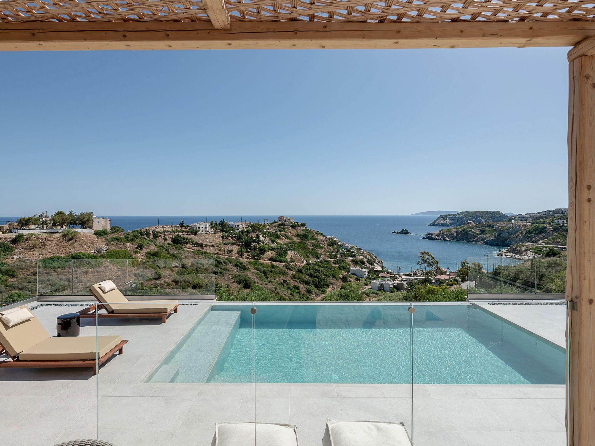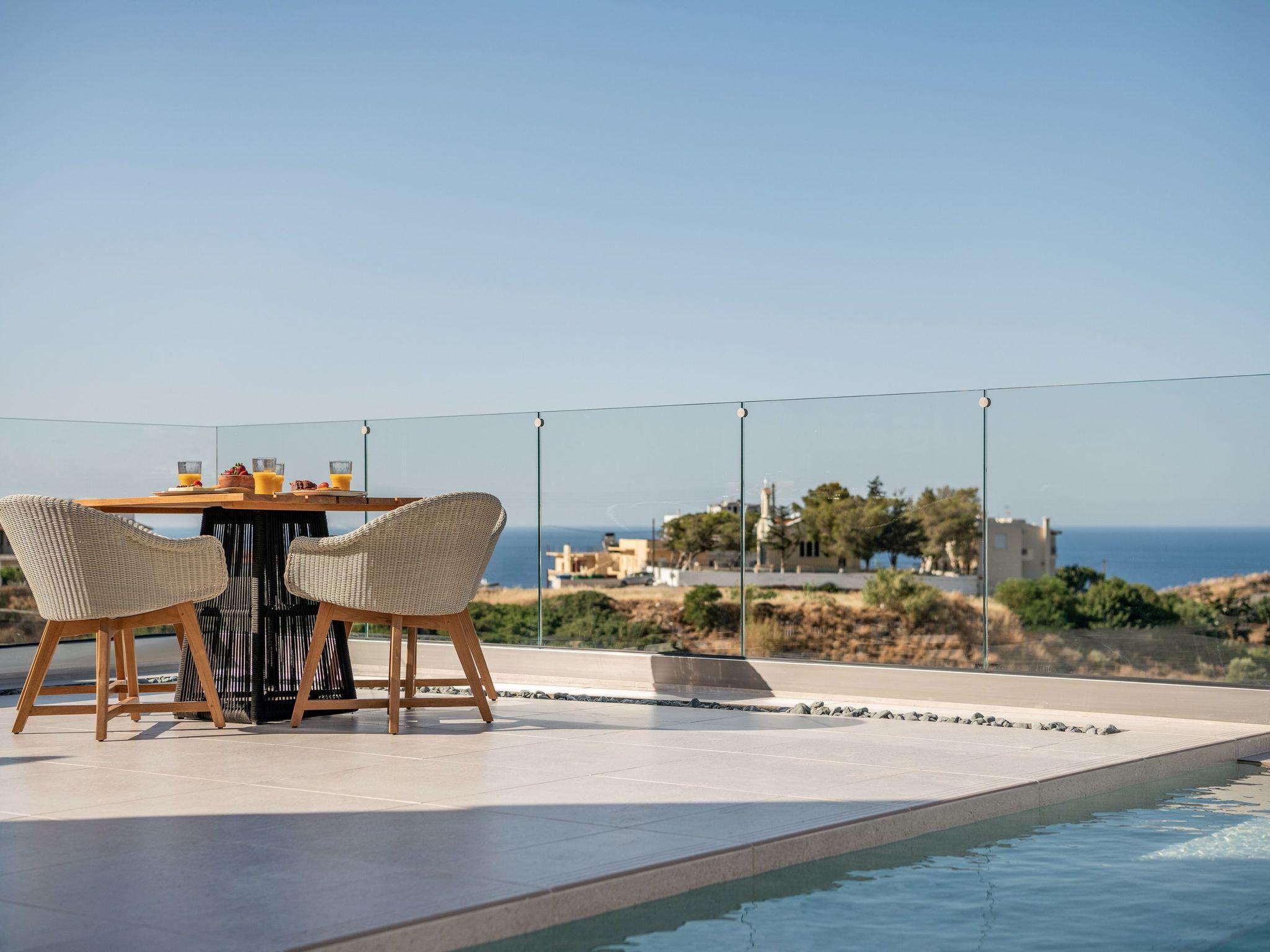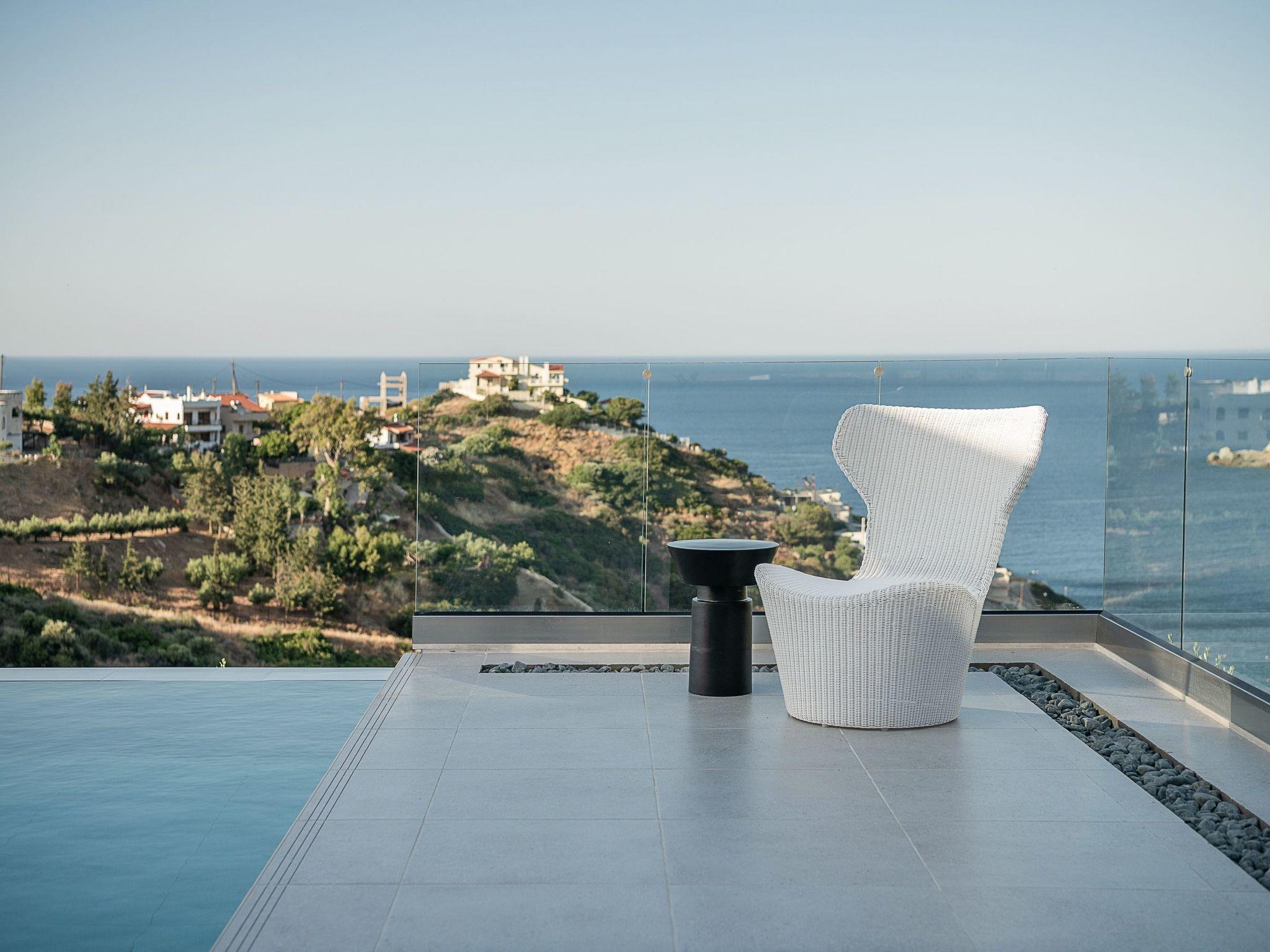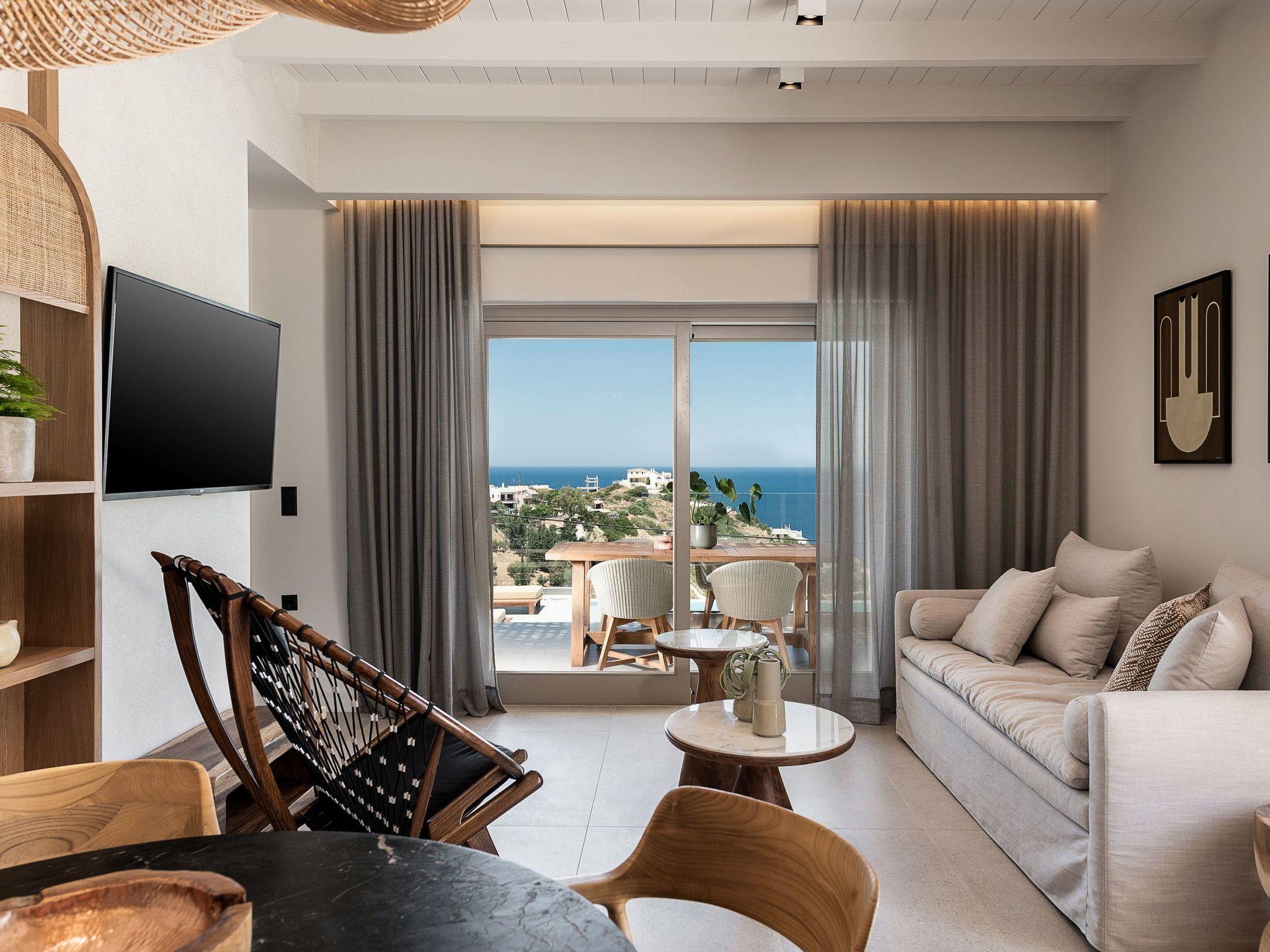 Kokomo Villas are located on a hill overlooking the bay of Lygaria in the greater area of Agia Pelagia. It can be reached from Heraklion/Heraklion Airport in about 25 minutes. It is easily accessible from the Highway and ideal as a base for exploring places of interest. Although close to various magnificent beaches, restaurants and supermarkets, it is also perfect for relaxing in privacy.The villa is characterized by high aesthetics and stunning panoramic views of the Cretan Sea. The earthy tones of the spaces merge into the deep blue of the sea and sky, offering an unforgettable sense of harmony and gentleness. Every aspect, material and element has been carefully selected to wrap you in a state of calmness and satisfaction. All you need to do is enjoy.Villa Gaia hosts 2 bedrooms, both with king size beds and ensuite bathrooms with showers. The front bedroom offers panoramic sea view and direct access to the front veranda. The back bedroom offers direct access to the beautiful backyard. The living-room with a gorgeous view of the sea is connected to a fully equipped open kitchen and dining room and opens out to the veranda. The front outdoor area is exceptionally spacious and the view is a delight to the eyes. It offers a private swimming pool with sunbeds, an outdoor shower, lounge poufs, barbeque (gas) and dining area.Furthermore, Kokomo Villas has solar panels installed to provide some of the energy needed in the property through them. IMPORTANT NOTICE: This property is not suitable for children from 2 to 7 years old, since there is an infinity pool and some not covered areas