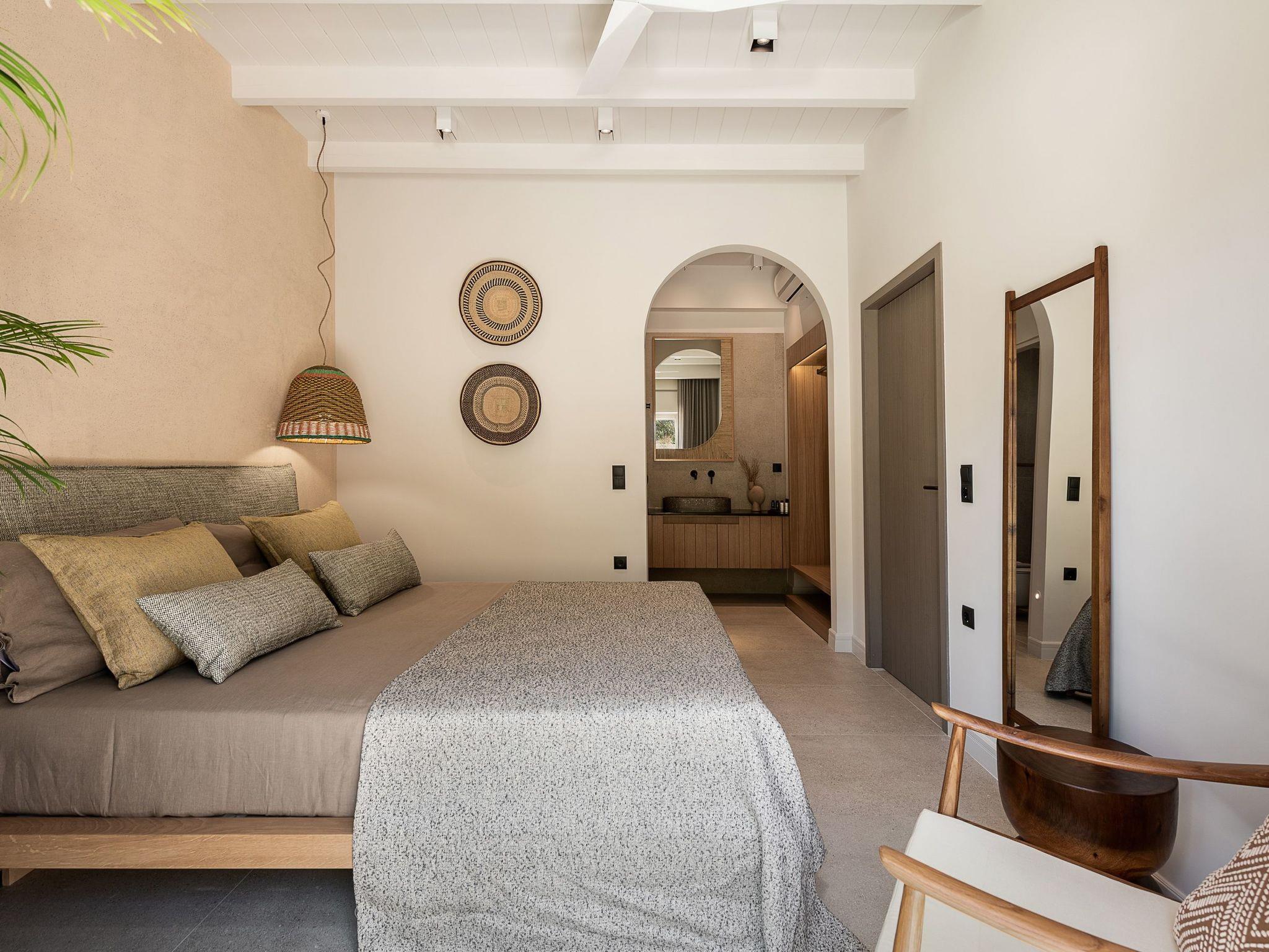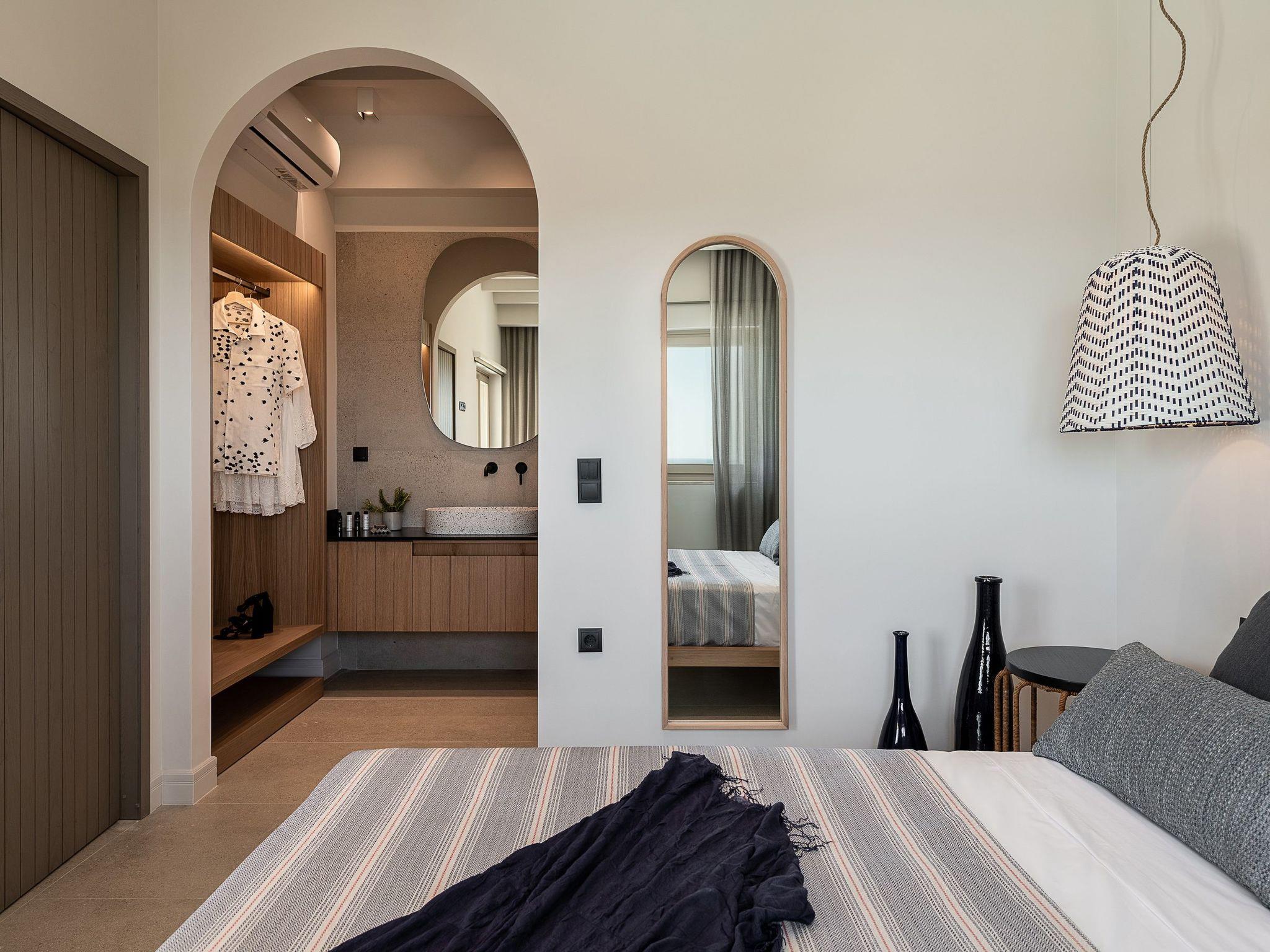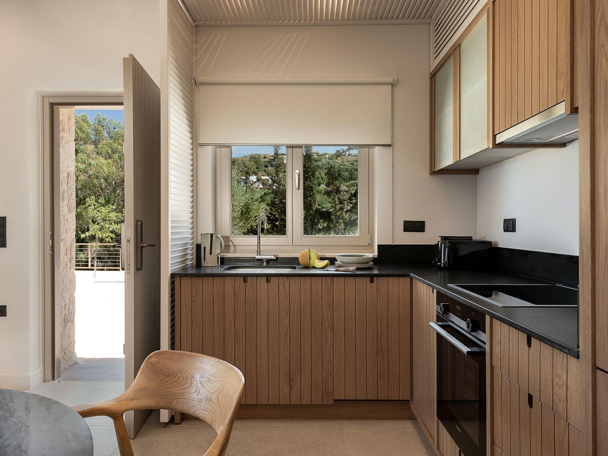 Kokomo Villas are located on a hill overlooking the bay of Lygaria in the greater area of Agia Pelagia. It can be reached from Heraklion/Heraklion Airport in about 25 minutes. It is easily accessible from the Highway and ideal as a base for exploring places of interest. Although close to various magnificent beaches, restaurants and supermarkets, it is also perfect for relaxing in privacy.The villa is characterized by high aesthetics and stunning panoramic views of the Cretan Sea. The earthy tones of the spaces merge into the deep blue of the sea and sky, offering an unforgettable sense of harmony and gentleness. Every aspect, material and element has been carefully selected to wrap you in a state of calmness and satisfaction. All you need to do is enjoy.Villa Gaia hosts 2 bedrooms, both with king size beds and ensuite bathrooms with showers. The front bedroom offers panoramic sea view and direct access to the front veranda. The back bedroom offers direct access to the beautiful backyard. The living-room with a gorgeous view of the sea is connected to a fully equipped open kitchen and dining room and opens out to the veranda. The front outdoor area is exceptionally spacious and the view is a delight to the eyes. It offers a private swimming pool with sunbeds, an outdoor shower, lounge poufs, barbeque (gas) and dining area.Furthermore, Kokomo Villas has solar panels installed to provide some of the energy needed in the property through them. IMPORTANT NOTICE: This property is not suitable for children from 2 to 7 years old, since there is an infinity pool and some not covered areas