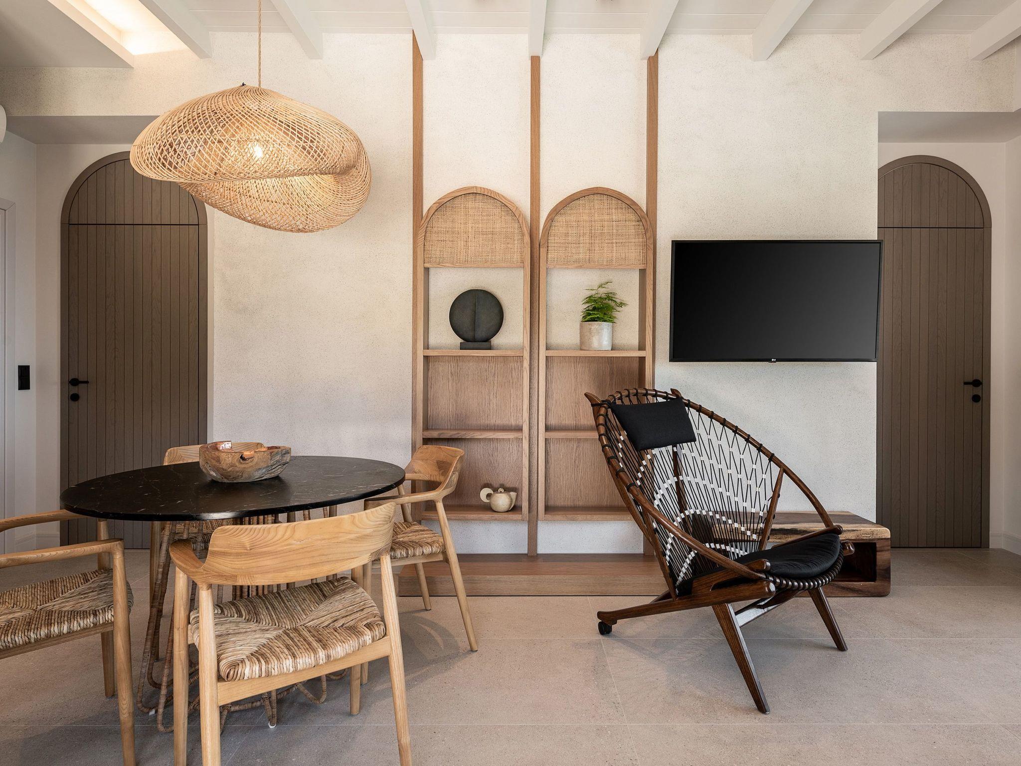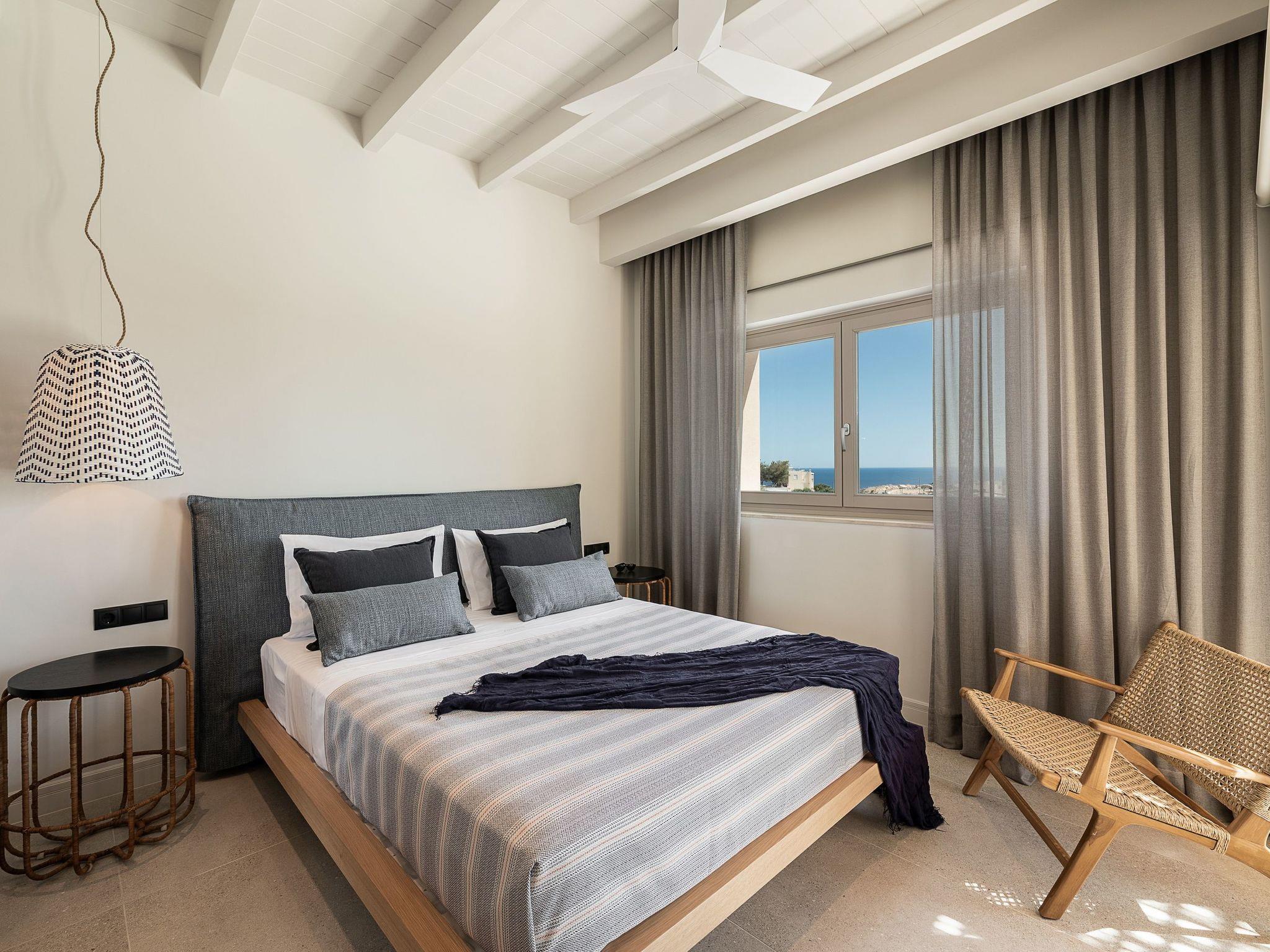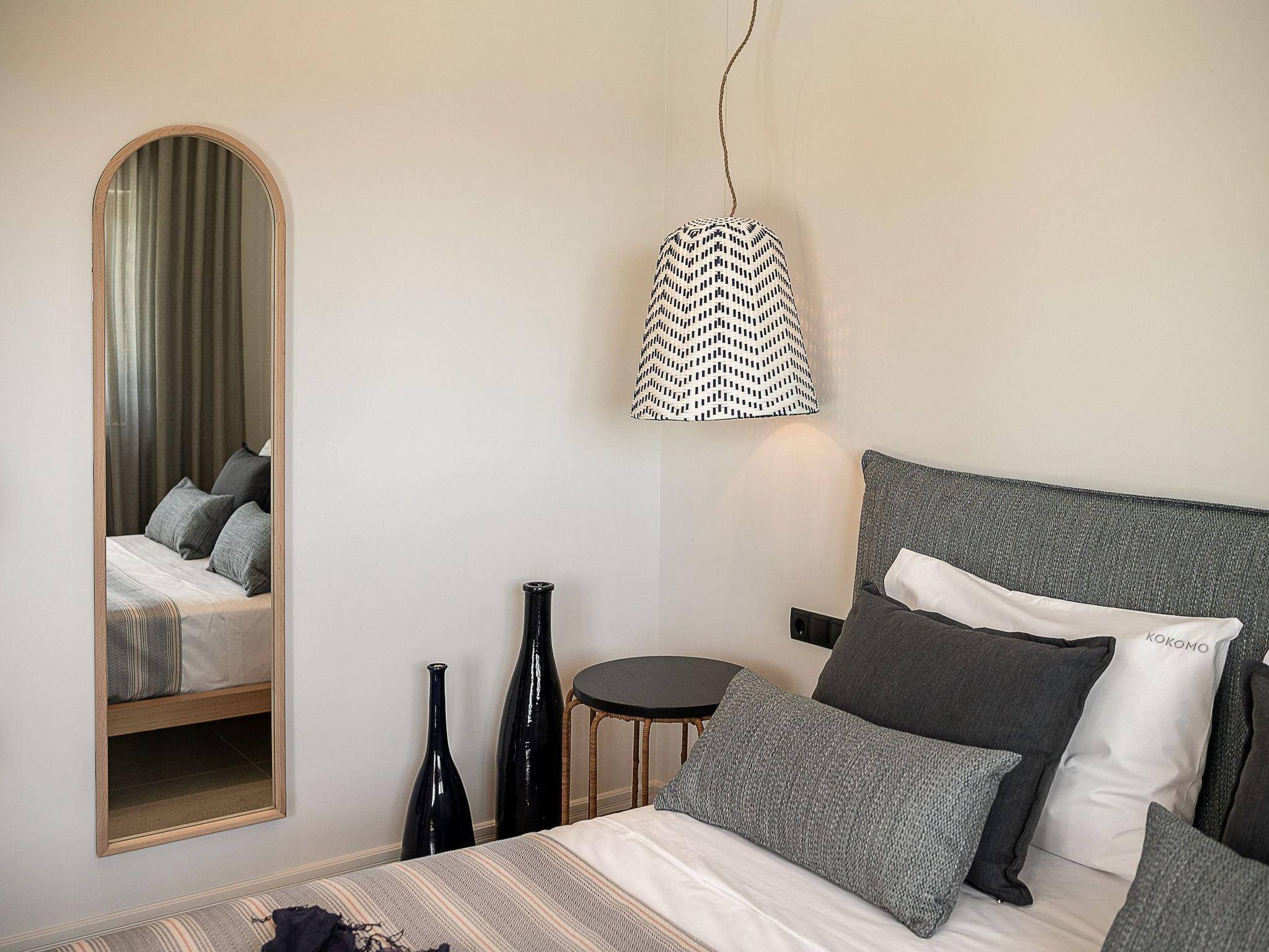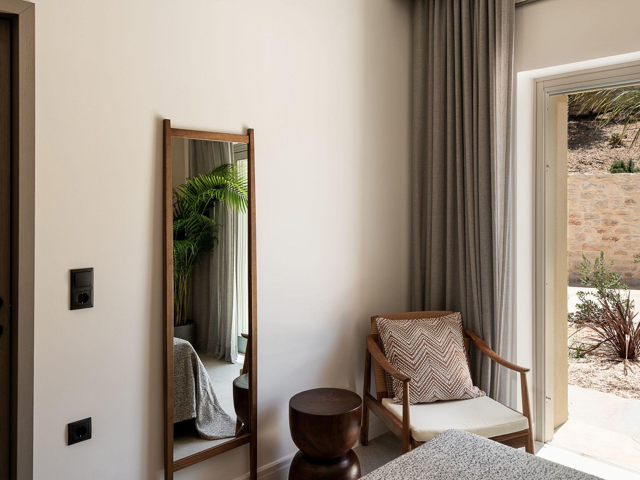 Kokomo Villas are located on a hill overlooking the bay of Lygaria in the greater area of Agia Pelagia. It can be reached from Heraklion/Heraklion Airport in about 25 minutes. It is easily accessible from the Highway and ideal as a base for exploring places of interest. Although close to various magnificent beaches, restaurants and supermarkets, it is also perfect for relaxing in privacy.The villa is characterized by high aesthetics and stunning panoramic views of the Cretan Sea. The earthy tones of the spaces merge into the deep blue of the sea and sky, offering an unforgettable sense of harmony and gentleness. Every aspect, material and element has been carefully selected to wrap you in a state of calmness and satisfaction. All you need to do is enjoy.Villa Gaia hosts 2 bedrooms, both with king size beds and ensuite bathrooms with showers. The front bedroom offers panoramic sea view and direct access to the front veranda. The back bedroom offers direct access to the beautiful backyard. The living-room with a gorgeous view of the sea is connected to a fully equipped open kitchen and dining room and opens out to the veranda. The front outdoor area is exceptionally spacious and the view is a delight to the eyes. It offers a private swimming pool with sunbeds, an outdoor shower, lounge poufs, barbeque (gas) and dining area.Furthermore, Kokomo Villas has solar panels installed to provide some of the energy needed in the property through them. IMPORTANT NOTICE: This property is not suitable for children from 2 to 7 years old, since there is an infinity pool and some not covered areas