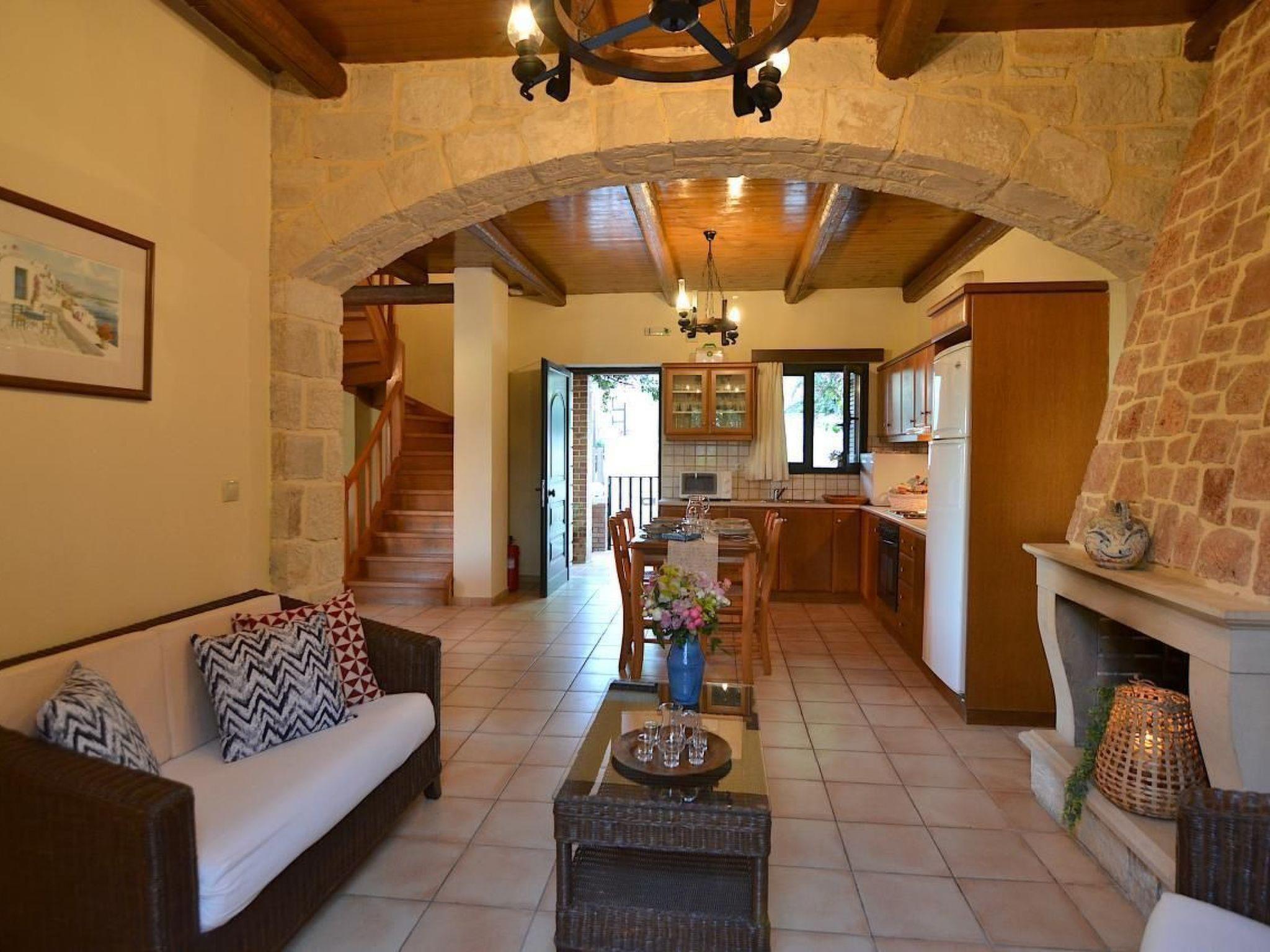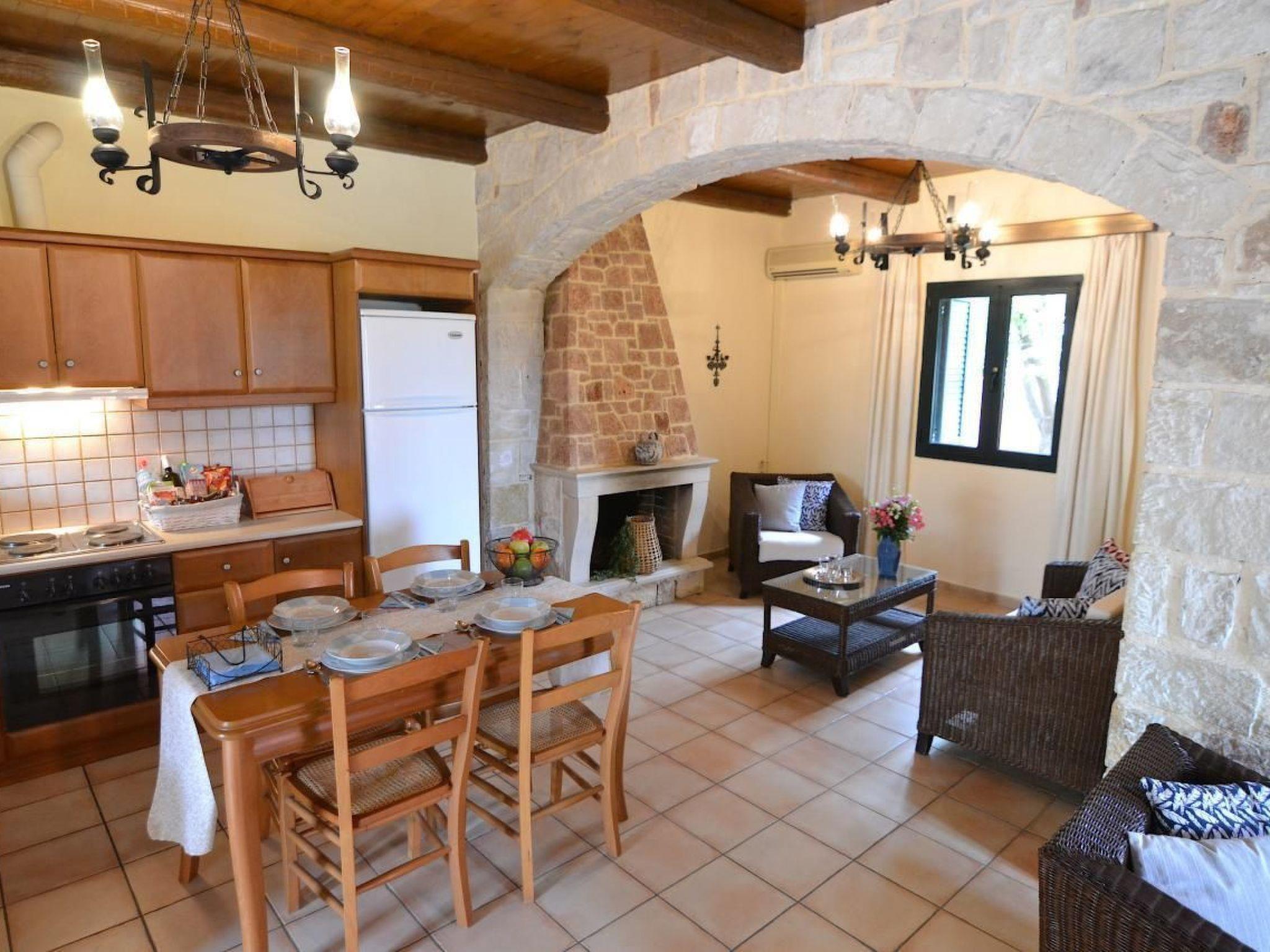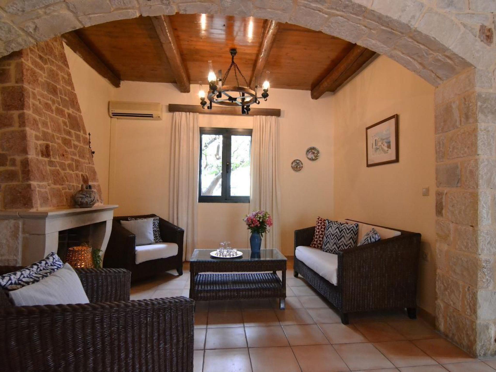The kitchen is connected to the living room as to the hall and divided by a stone arch, typical feature of the cretan architecture, featuring a/c and fireplace for the colder days or as decoration for a chill out night at the bamboo couches.