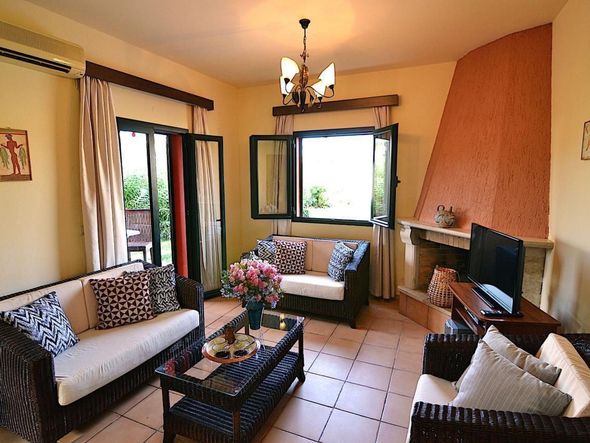 The kitchen is connected to the living room, featuring a/c and fireplace along with satellite television, DVD player, CD player and radio and finally books in English. The Living rooms is connected to the outside veranda facing the pool and the two downstairs toilet and a twin bedroom.
