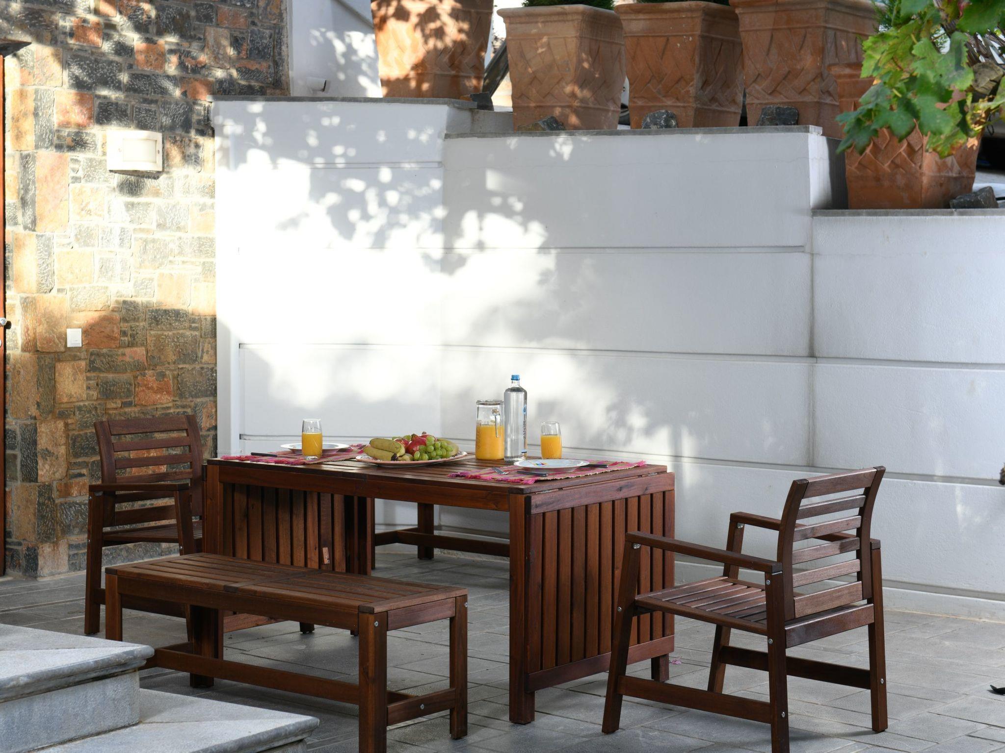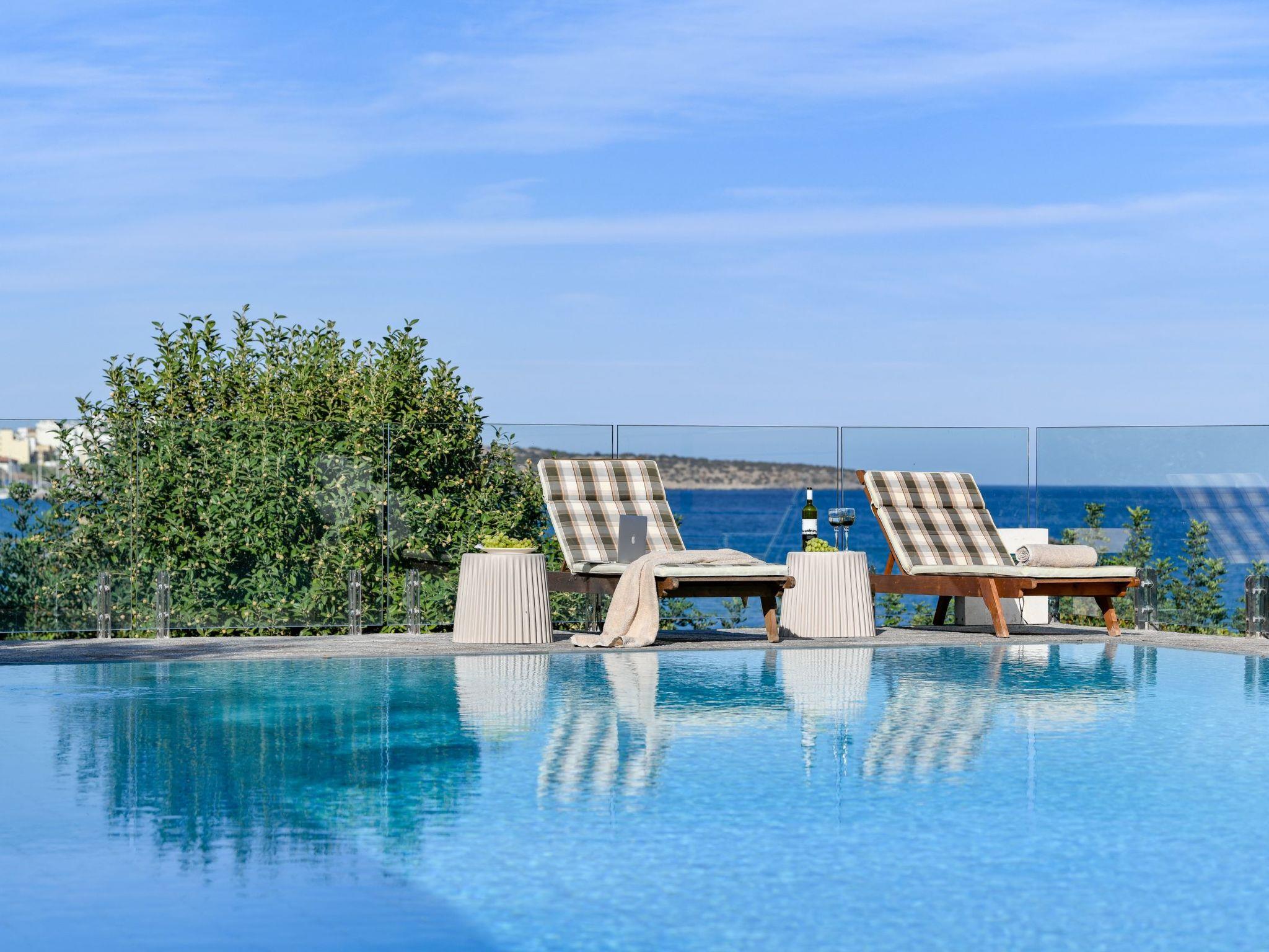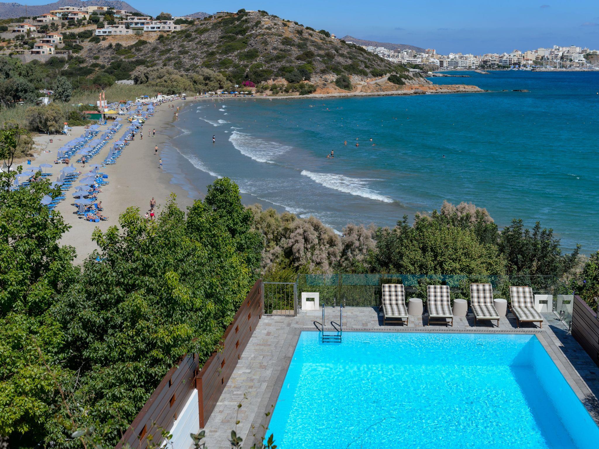 In front of the main house extends the swimming pool (with a direct view of the beach of Almyros and the city of Agios Nikolaos) with an outdoor shower, chaise-lounges, outdoor furniture and dining area .