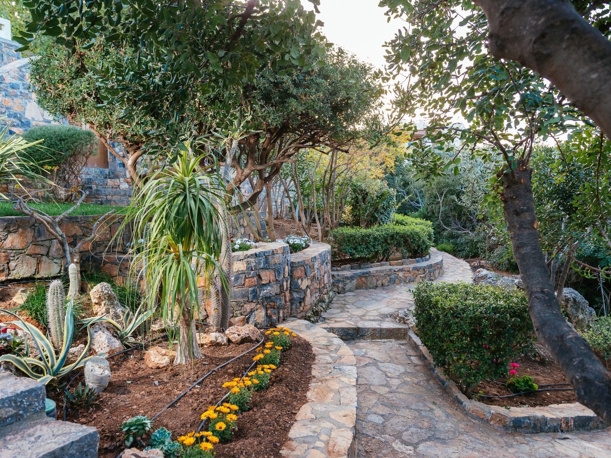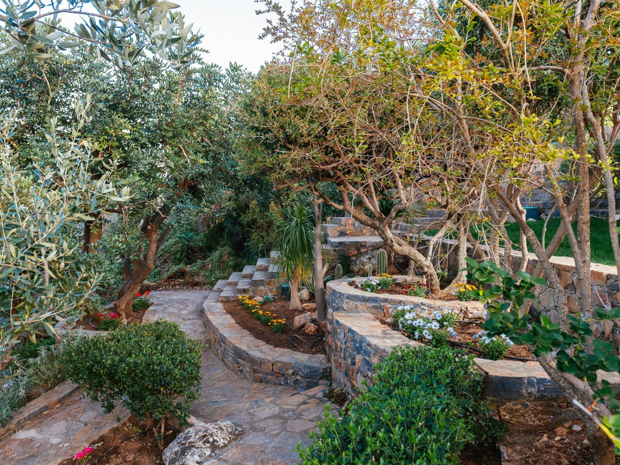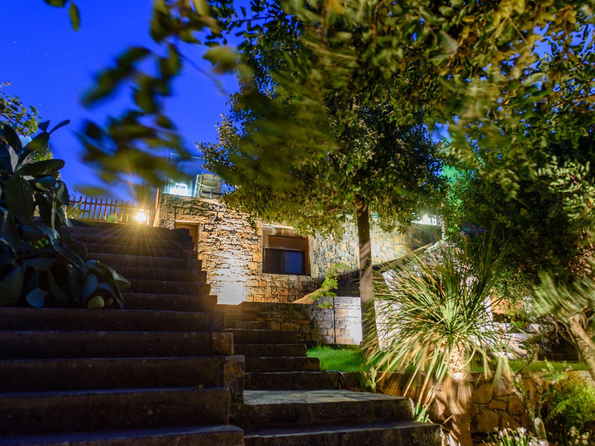In front of the main house extends the swimming pool (with a direct view of the beach of Almyros and the city of Agios Nikolaos) with an outdoor shower, chaise-lounges, outdoor furniture and dining area .