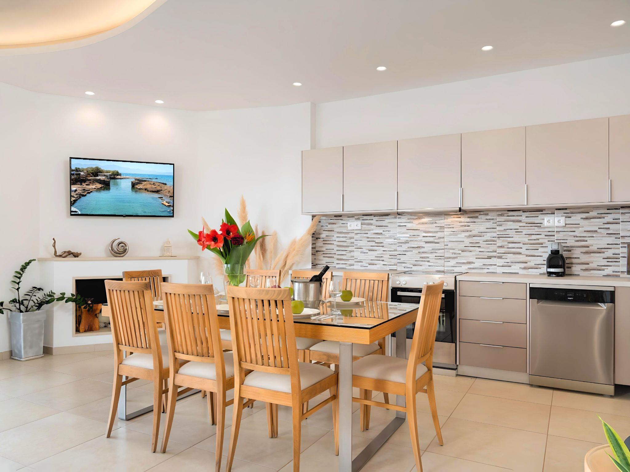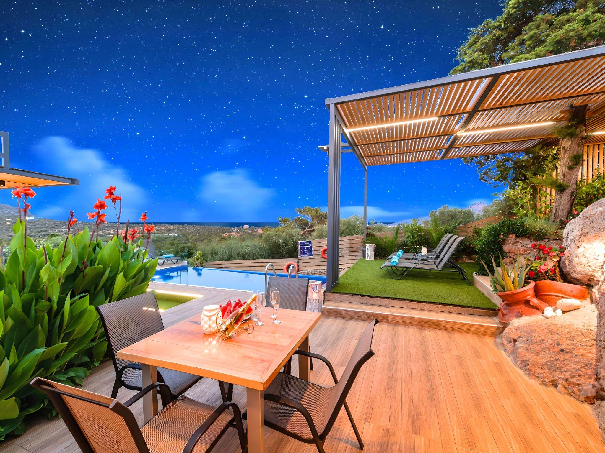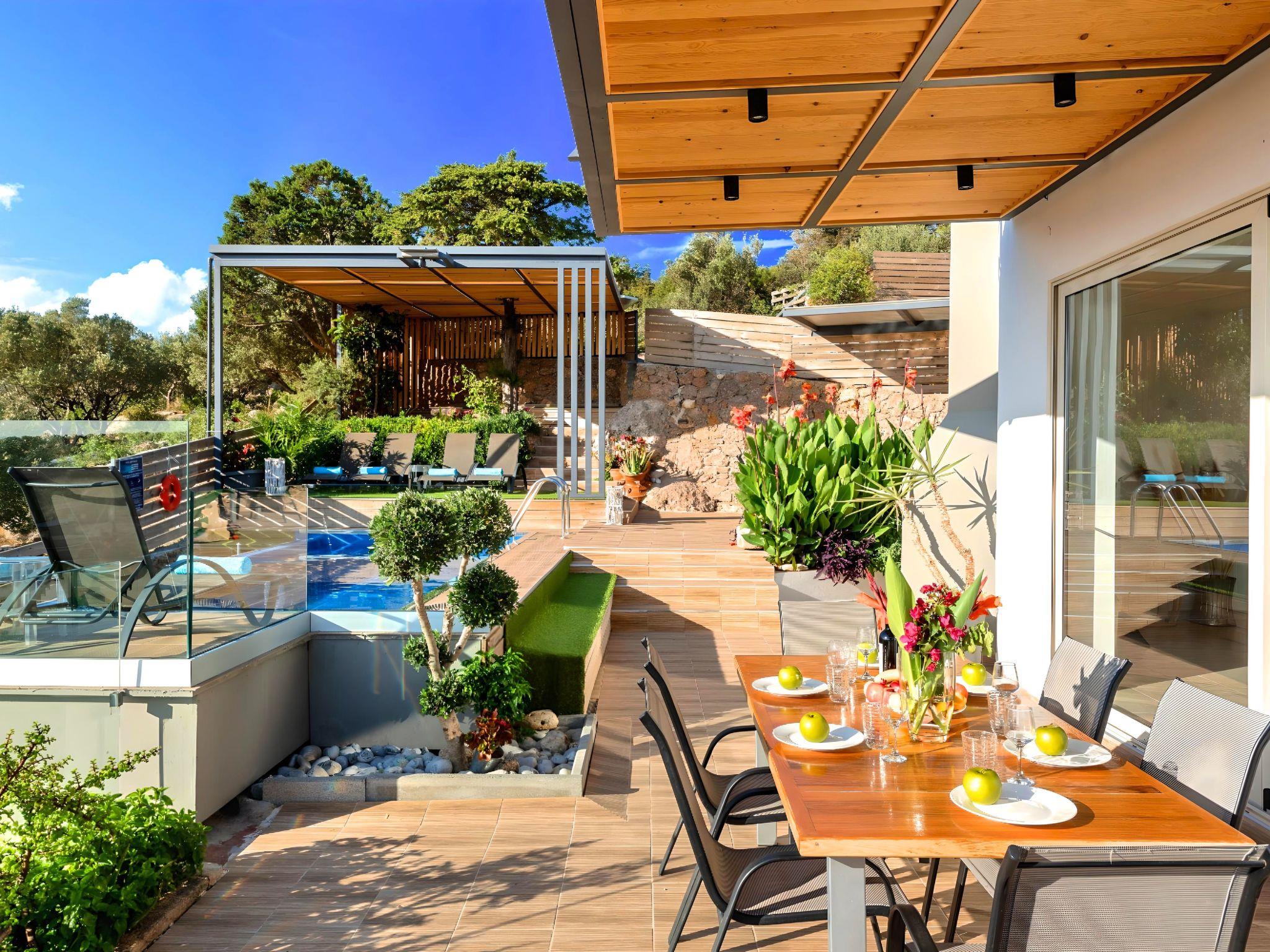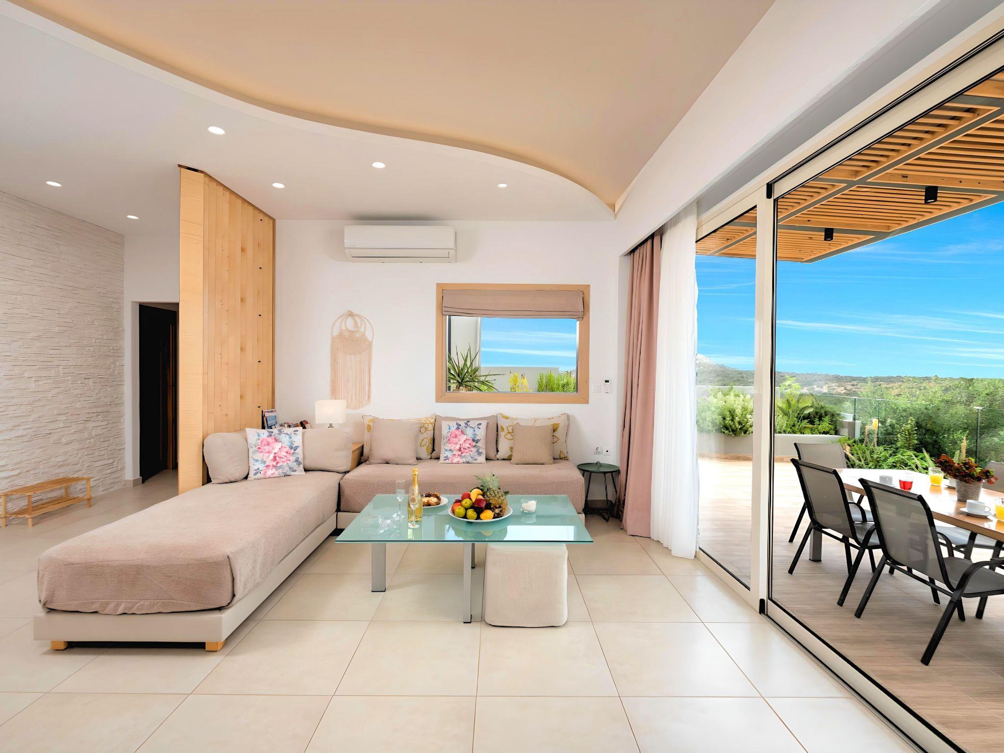 Simple and unadorned, Canes Villa architecture takes full advantage of Cretan Nature by incorporating a variety of decorative elements that make references to serenity and rest.The colour white dominates all spaces, a choice that further highlights the bright Cretan light and creates a sense of peacefulness, while the brown stone details blend harmoniously with the entire structure and capture the discreet nature of island architecture.Just 6,5km from Agios Nikolaos Town among green fields and olive groves, set in the north east part of Crete.Canes Villa is the ultimate refuge with wonderful Sea views and a private heated pool just few minutes’ drive from the most famous beaches of the area, Amoudara and Voulisma.Canes Villa can accommodate up to 13 guests (eleven guests at the villas bedrooms, plus two more guests at the sofa beds of the living room).The outdoor pool is heated and can reach 6 to 8 degrees more that the 24 h average air temperature with maximum value of 29°