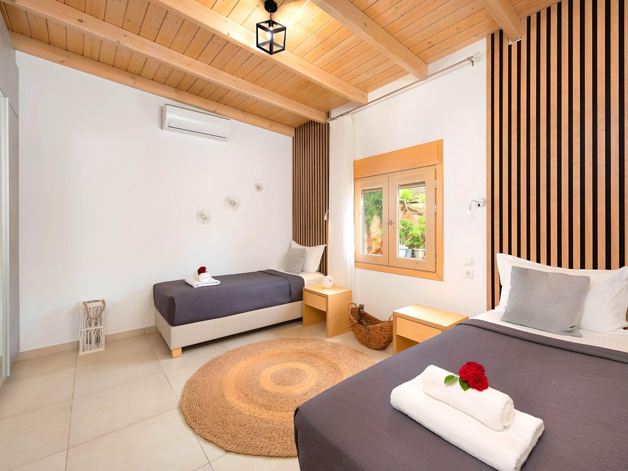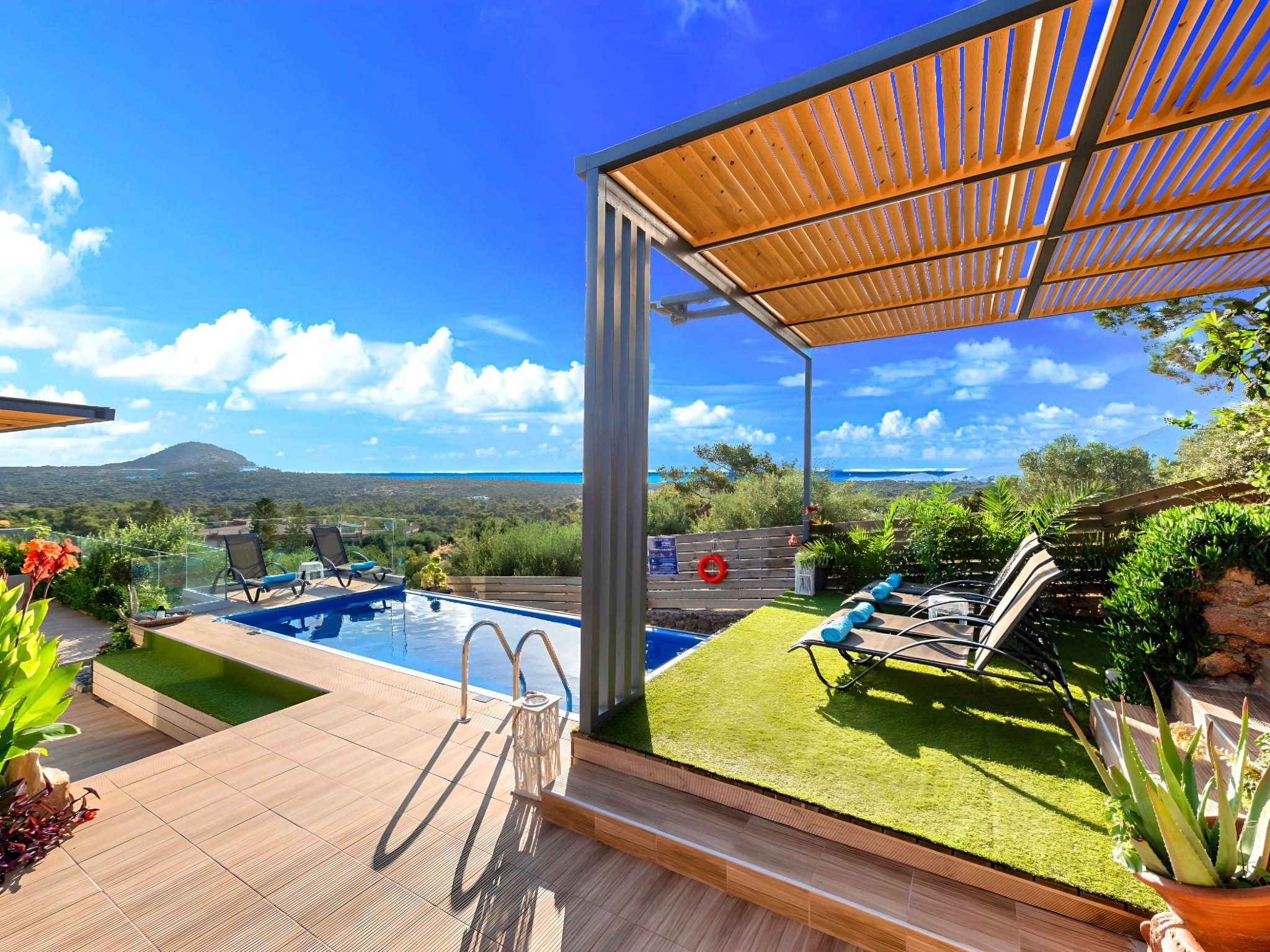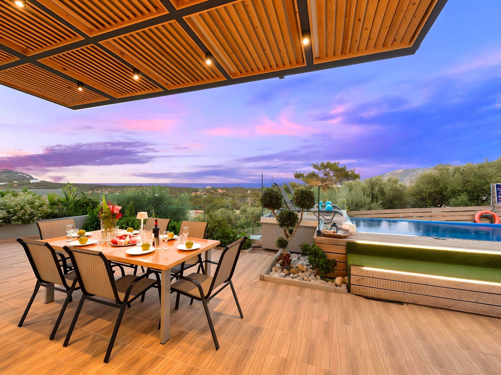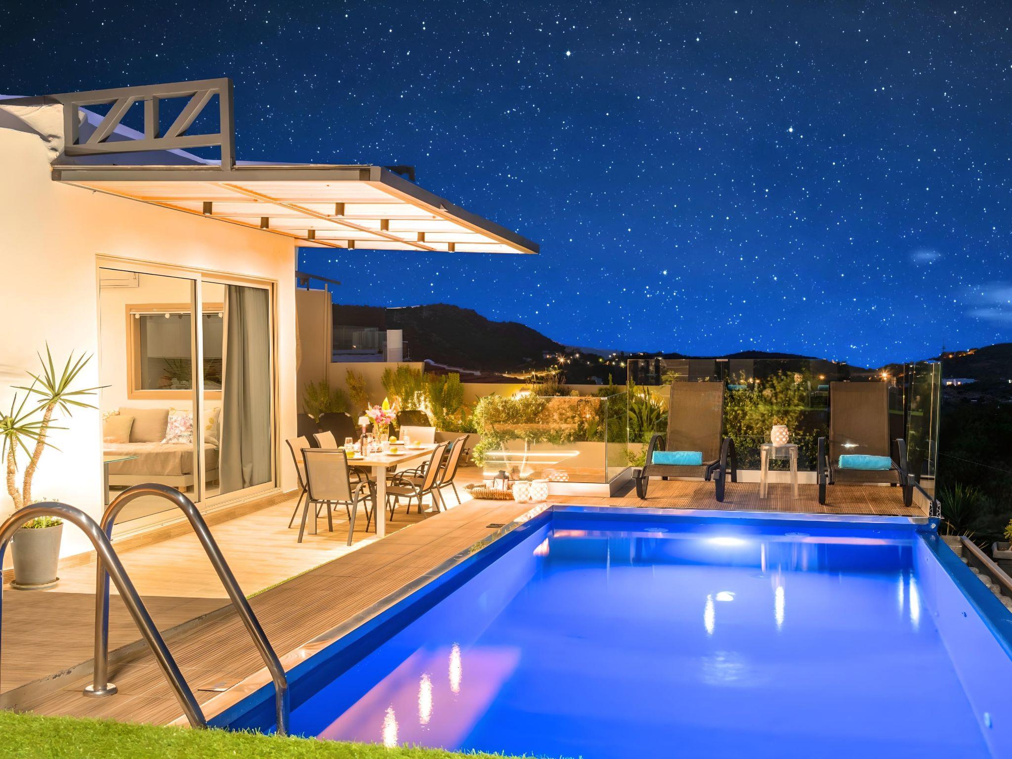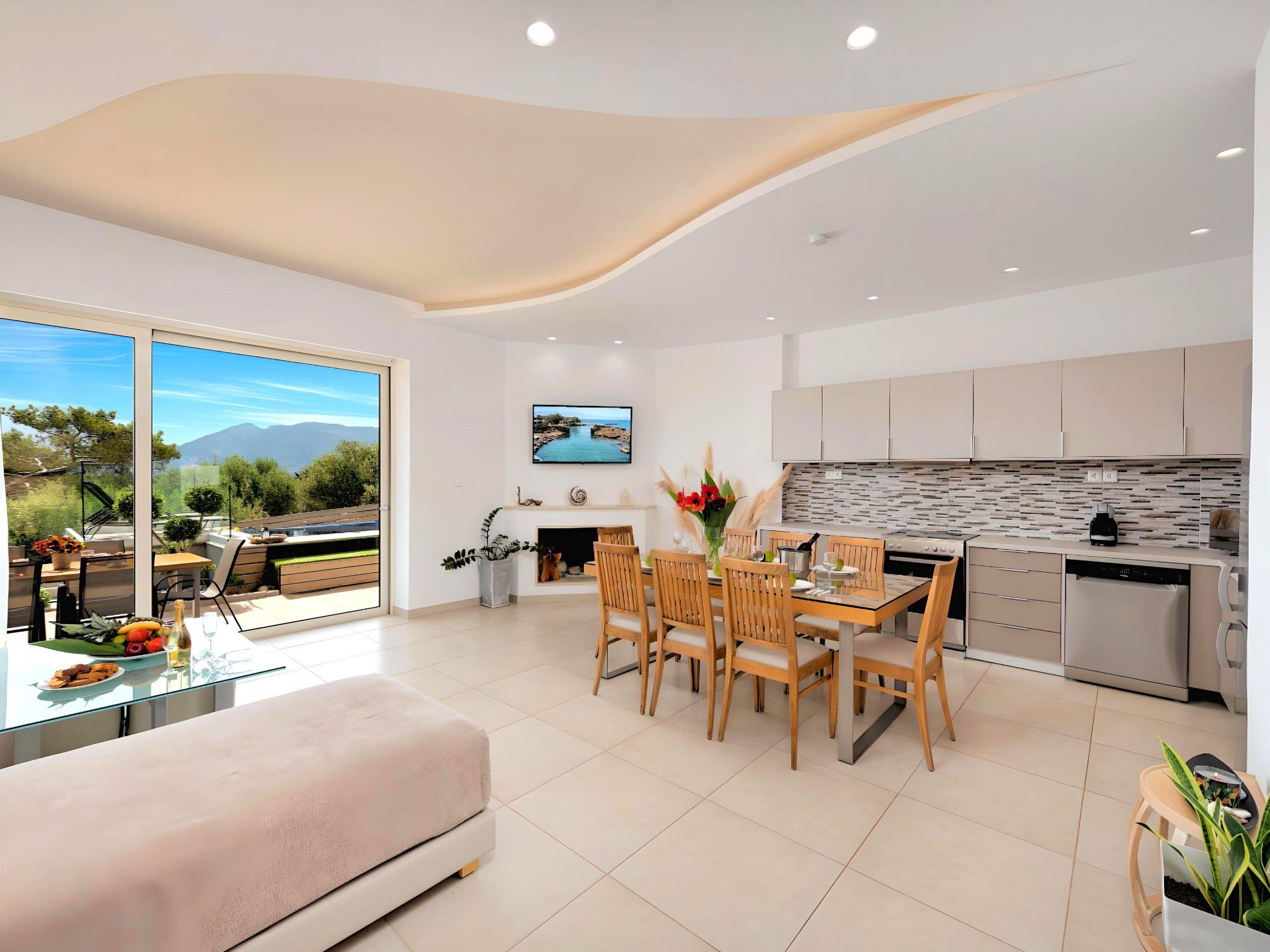 Simple and unadorned, Canes Villa architecture takes full advantage of Cretan Nature by incorporating a variety of decorative elements that make references to serenity and rest.The colour white dominates all spaces, a choice that further highlights the bright Cretan light and creates a sense of peacefulness, while the brown stone details blend harmoniously with the entire structure and capture the discreet nature of island architecture.Just 6,5km from Agios Nikolaos Town among green fields and olive groves, set in the north east part of Crete.Canes Villa is the ultimate refuge with wonderful Sea views and a private heated pool just few minutes’ drive from the most famous beaches of the area, Amoudara and Voulisma.Canes Villa can accommodate up to 13 guests (eleven guests at the villas bedrooms, plus two more guests at the sofa beds of the living room).The outdoor pool is heated and can reach 6 to 8 degrees more that the 24 h average air temperature with maximum value of 29°