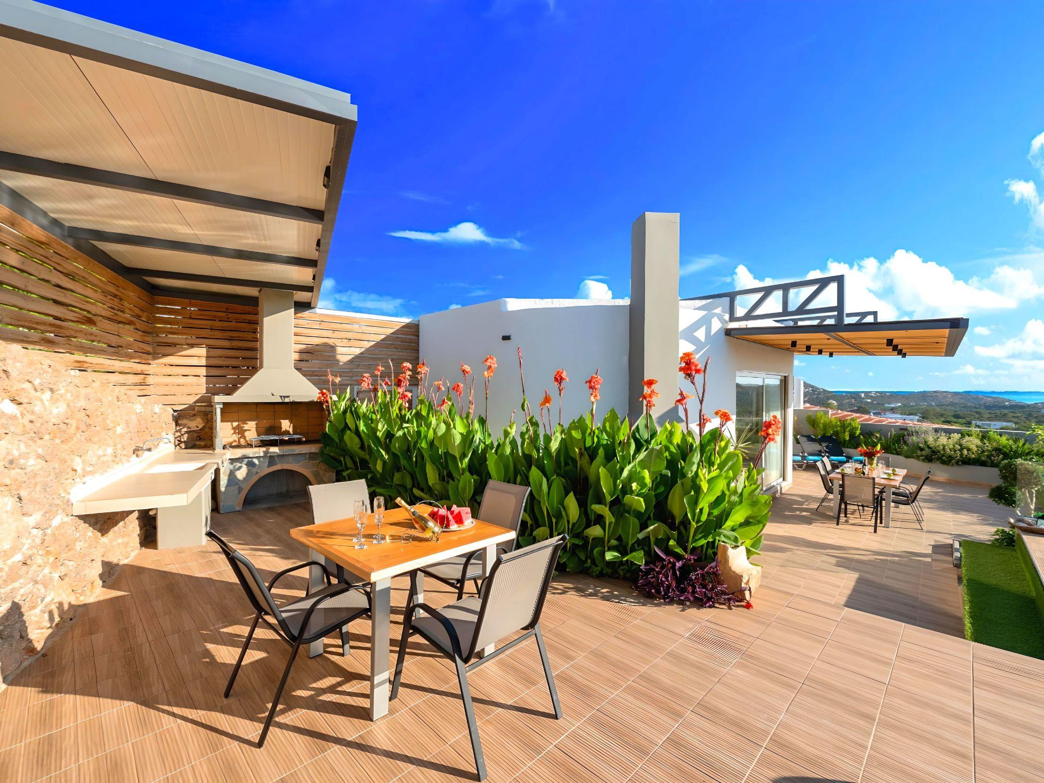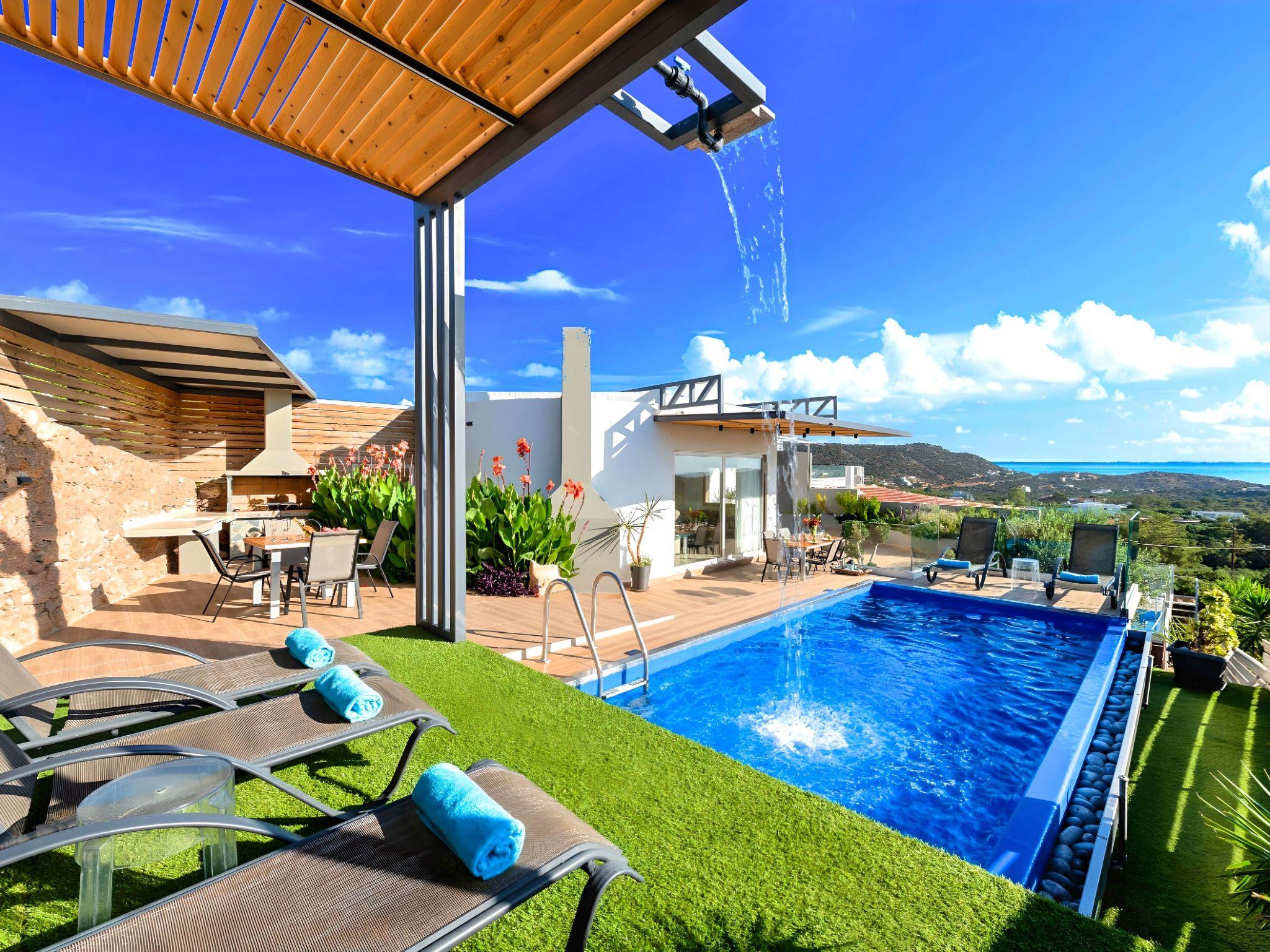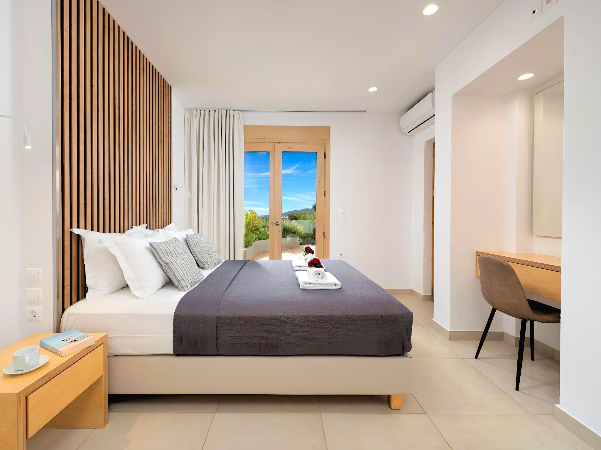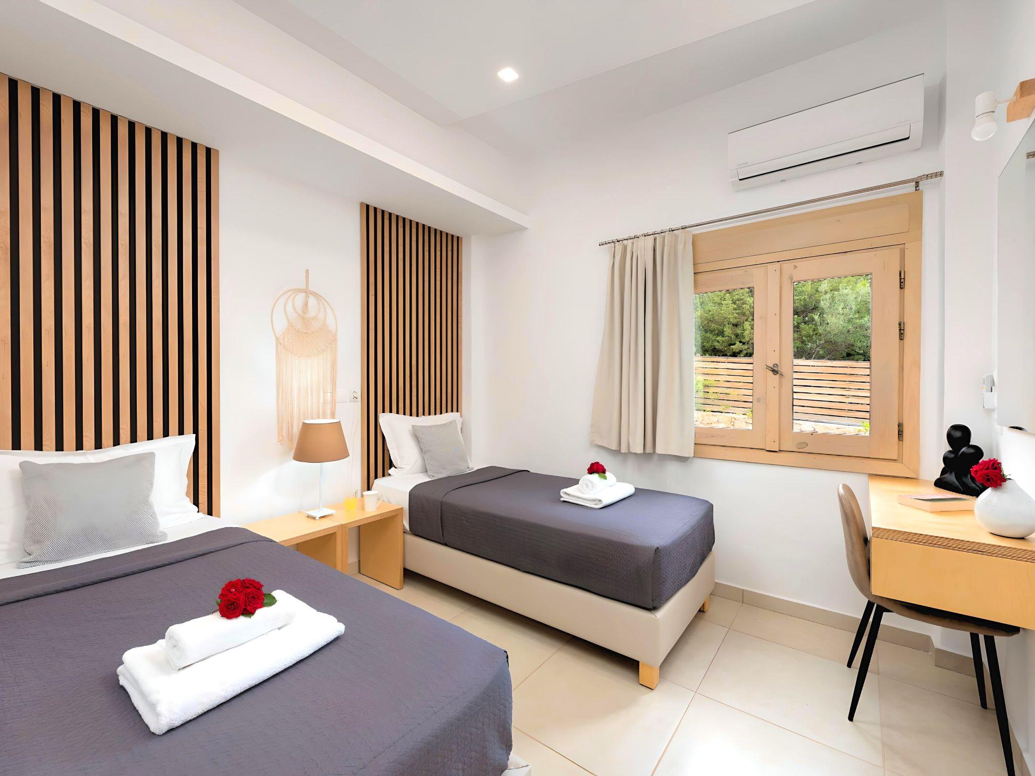 Simple and unadorned, Canes Villa architecture takes full advantage of Cretan Nature by incorporating a variety of decorative elements that make references to serenity and rest.The colour white dominates all spaces, a choice that further highlights the bright Cretan light and creates a sense of peacefulness, while the brown stone details blend harmoniously with the entire structure and capture the discreet nature of island architecture.Just 6,5km from Agios Nikolaos Town among green fields and olive groves, set in the north east part of Crete.Canes Villa is the ultimate refuge with wonderful Sea views and a private heated pool just few minutes’ drive from the most famous beaches of the area, Amoudara and Voulisma.Canes Villa can accommodate up to 13 guests (eleven guests at the villas bedrooms, plus two more guests at the sofa beds of the living room).The outdoor pool is heated and can reach 6 to 8 degrees more that the 24 h average air temperature with maximum value of 29°