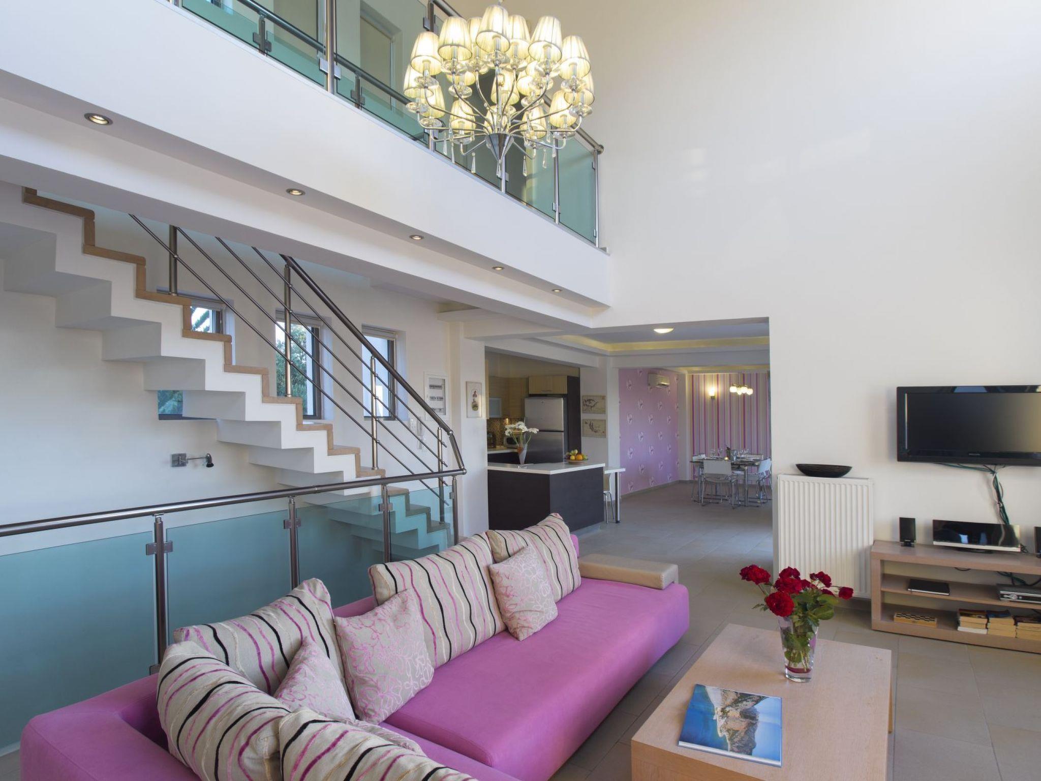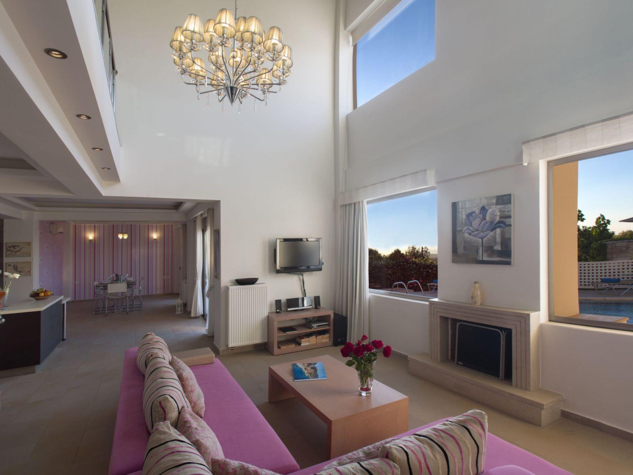 When entering Villa Antonios, you can see the living room, the kitchen and the dining area. There is also a twin bedroom with its shower/WC. At the lower ground floor you will find a twin bedroom, a billiard playroom and a shower/WC. On the first floor there is the master bedroom that includes a large bathroom with HydroJet massage, and there is also a single bedroom. Bathrobes, beach towels, toiletries and slippers are provided. The villa is fully air-conditioned and equipped with free Wi-Fi, TV & Home-Cinema. The living room has a fireplace and the kitchen comes with a washing machine, electric oven, microwave, fridge / freezer and toaster.