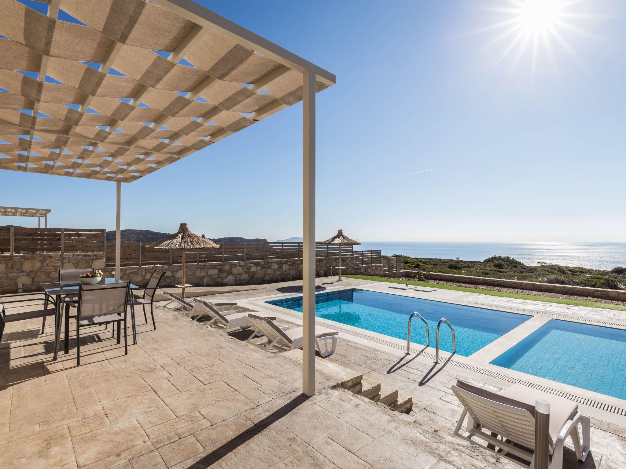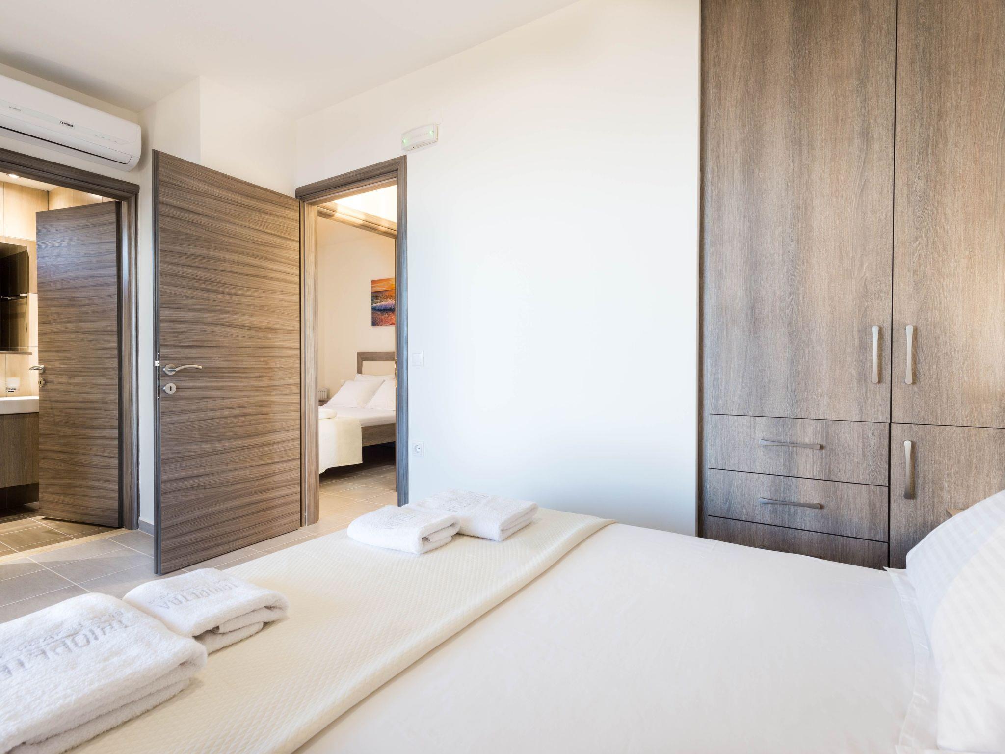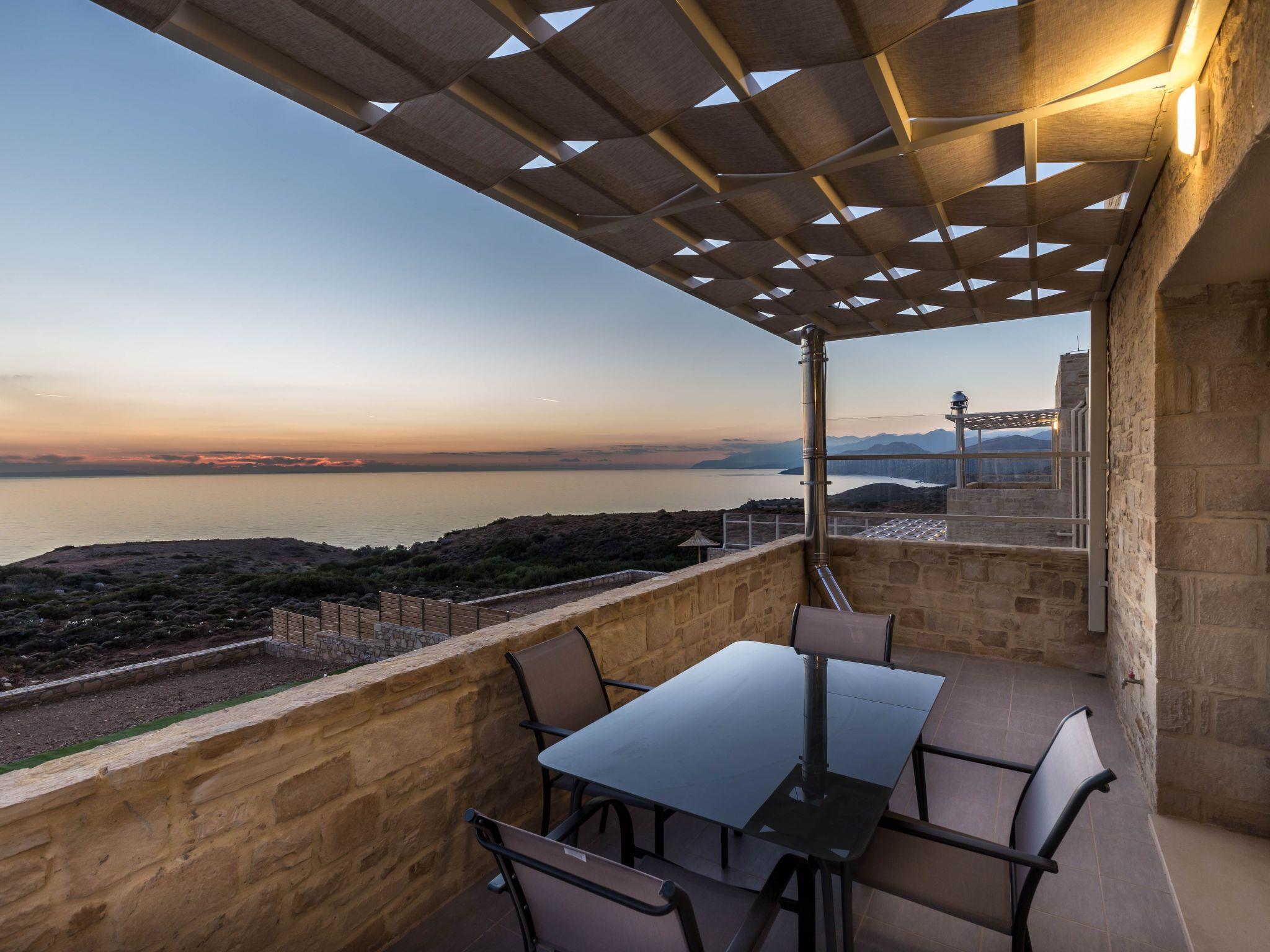 The villa is at the heart of this complex. It is a two-story house with an internal staircase (maisonette), offering unforgettable accommodation for 8 people. On the ground floor is a bedroom with twin beds, and a fully equipped kitchen with a dining area, living room, and WC. The double glazed door gives access to the veranda and swimming pool area. On the 1st level, two comfortable bedrooms with a double bed, WC, and verandas with endless views. The rooms are fully furnished and decorated with exceptional and stylish designs with an emphasis on luxury and functionality. Amenities such as fast VDSL WI-FI internet, air conditioning, heating, and full HD Satellite smart TV will make your accommodation feel more like home. Every bedroom has a double bed and two bedside tables, a dressing table, and wardrobes. The kitchenware is fully equipped with all modern appliances such as a coffee maker (Nespresso machine is also included), kettle, toaster, juicer, mini chopper, mixer, dishwasher, refrigerator with freezer, washer/dryer and oven with ceramic hob. The large dining tables with comfortable chairs are perfect for a family or convivial dinner. The stylish living area offers a lounge, dining area, fireplace, TV, micro stereo system, WI-FI internet access, and telephone. There is also a corner sofa bed and coffee table. Steamers, vacuum cleaners, and strollers are also available. In all bathrooms, there is a feel-good shower with a glass cabin, a hair dryer, a full set of toiletries, and storage spaces to store away your belongings. Stone-built Villa Triopetra BlueHorizon Lefkopetra with adults & kids private pool, close to all the famous beaches in South Rethymnon