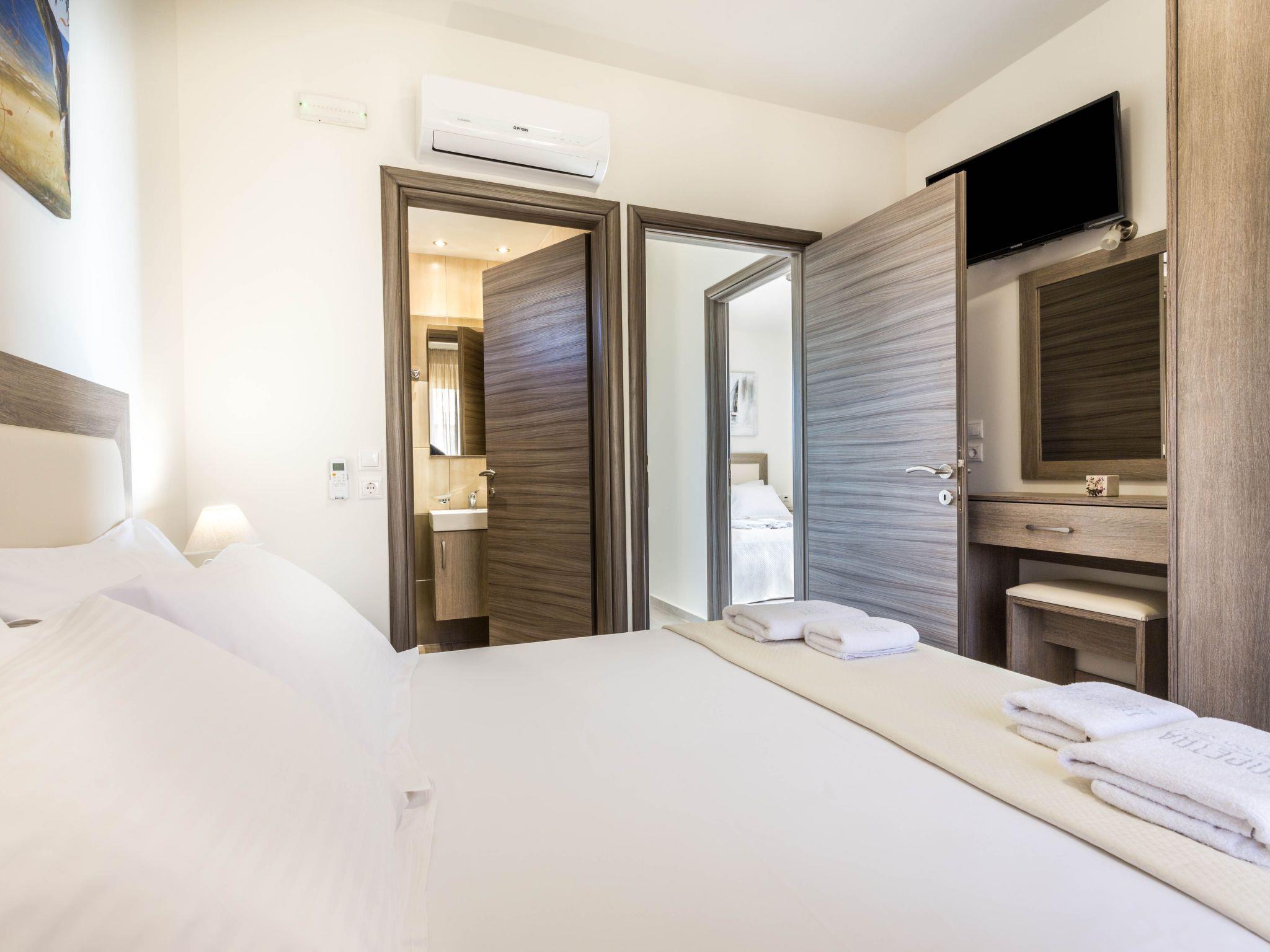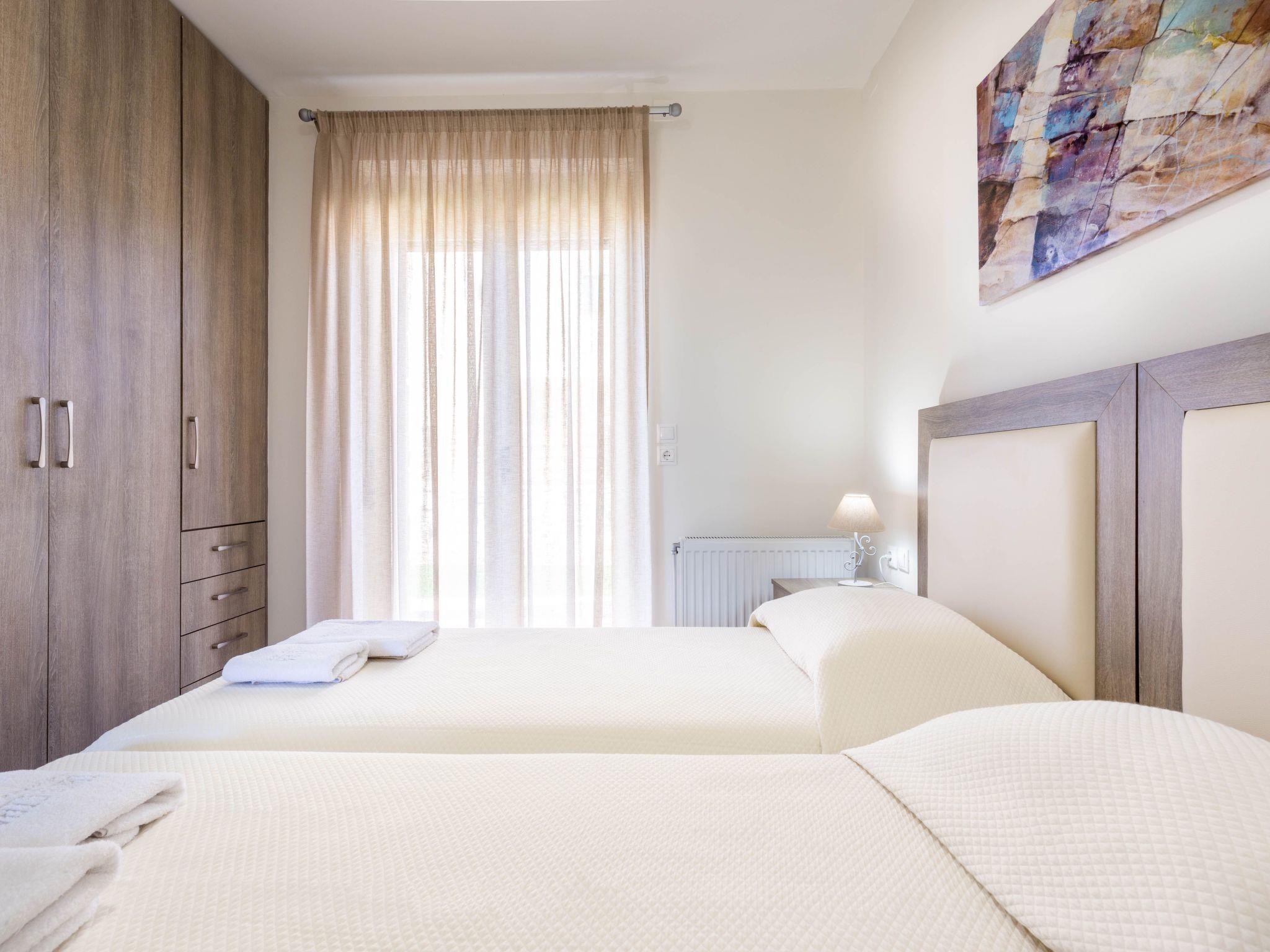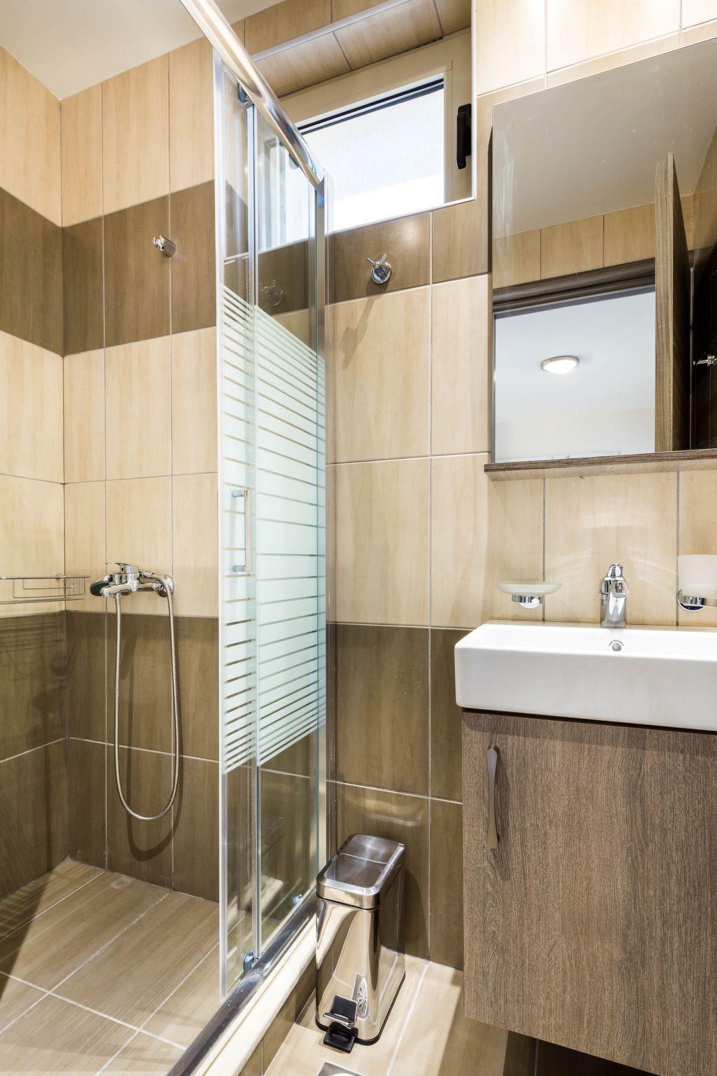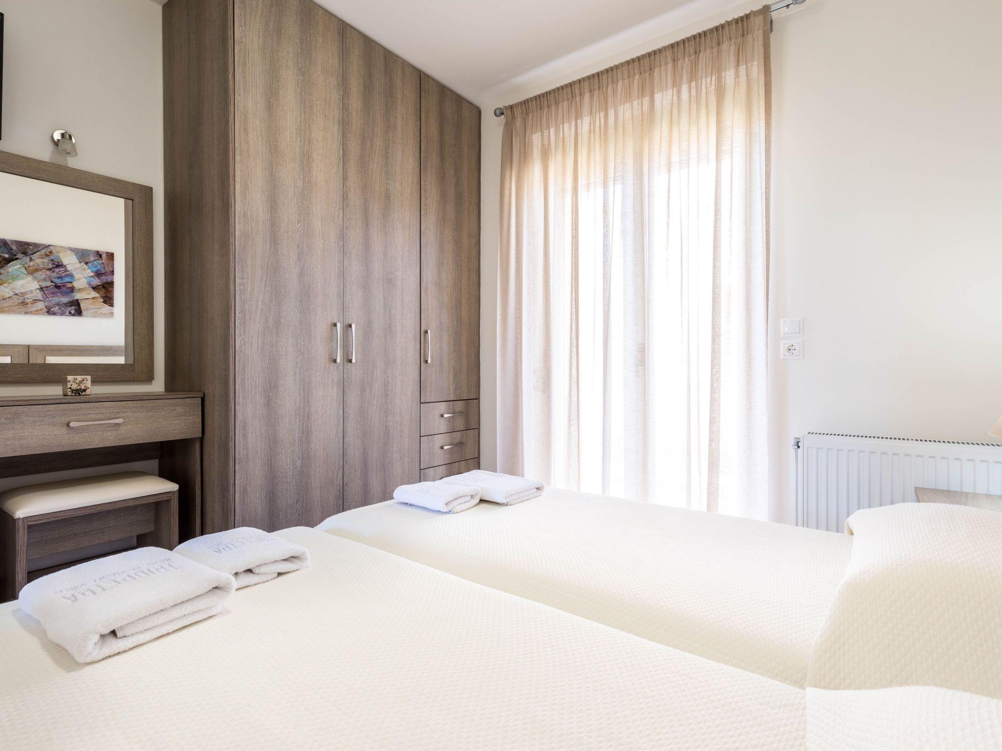 Floors LayoutGround floor: Ground floor: One bedroom with two single beds, Living room: sofa-bed + single bed sliding under sofa, kitchen with dining area, 1 communal wc- shower with closed glass cabinFirst floor:Two bedrooms with a double bed each, 2 ensuite bathrooms (an interior in each bedroom - shower with closed glass cabin, each)