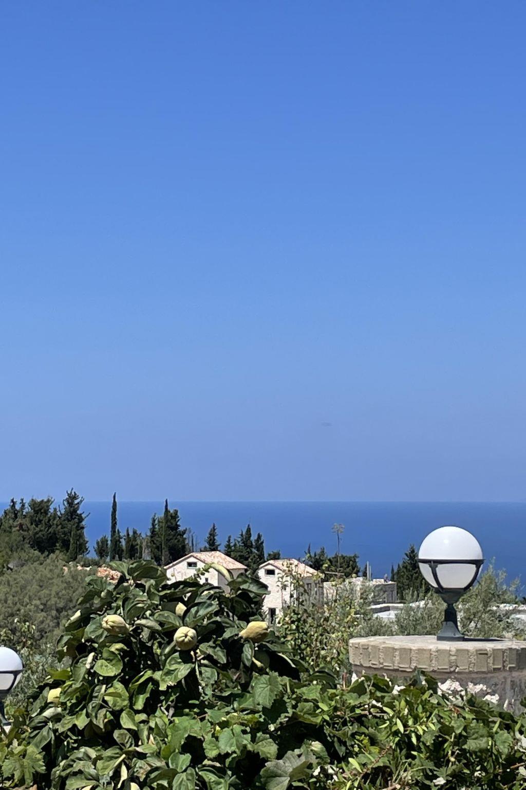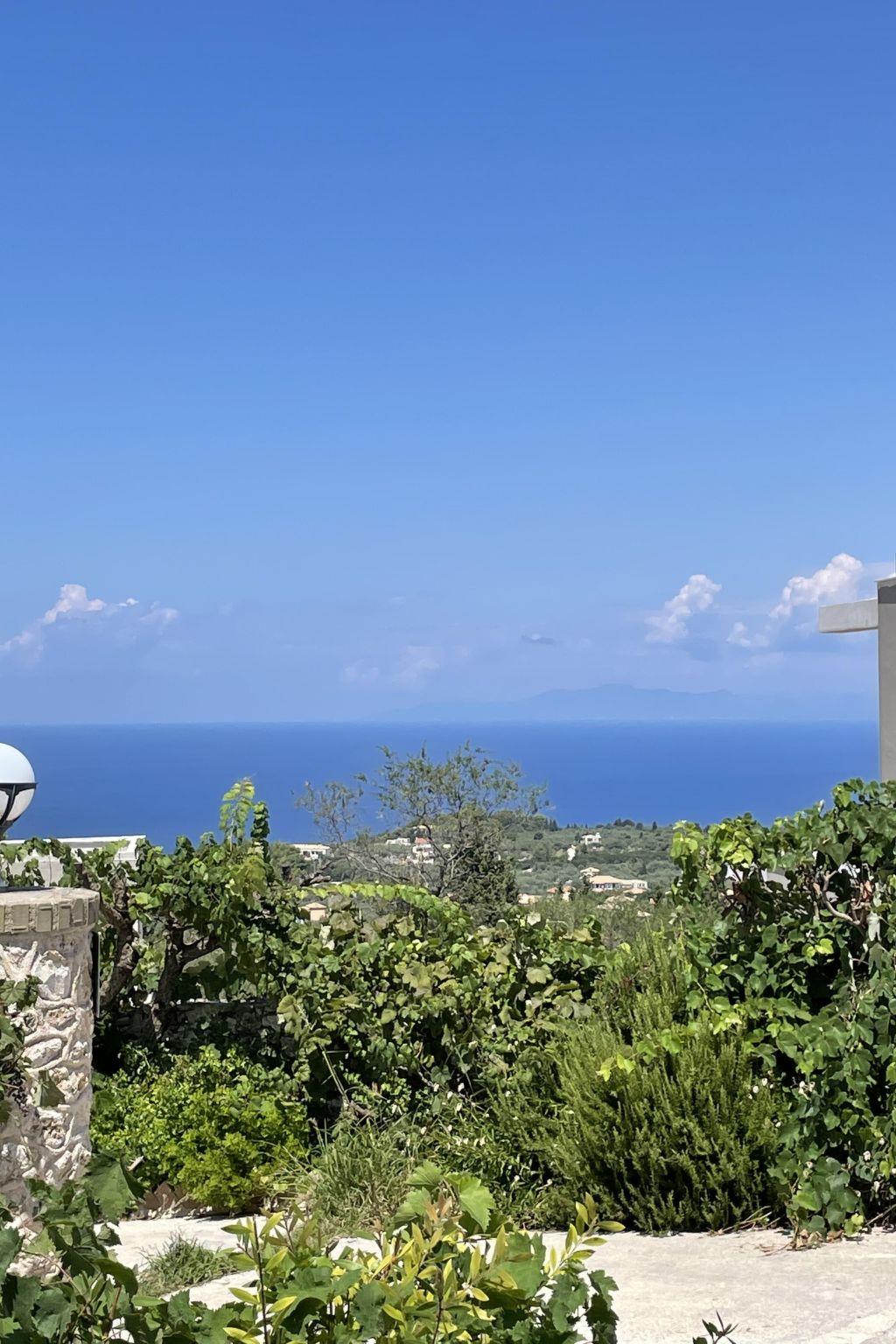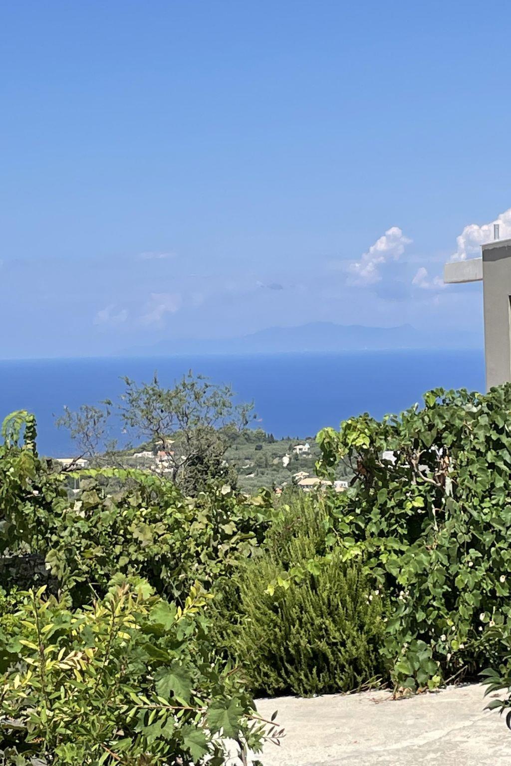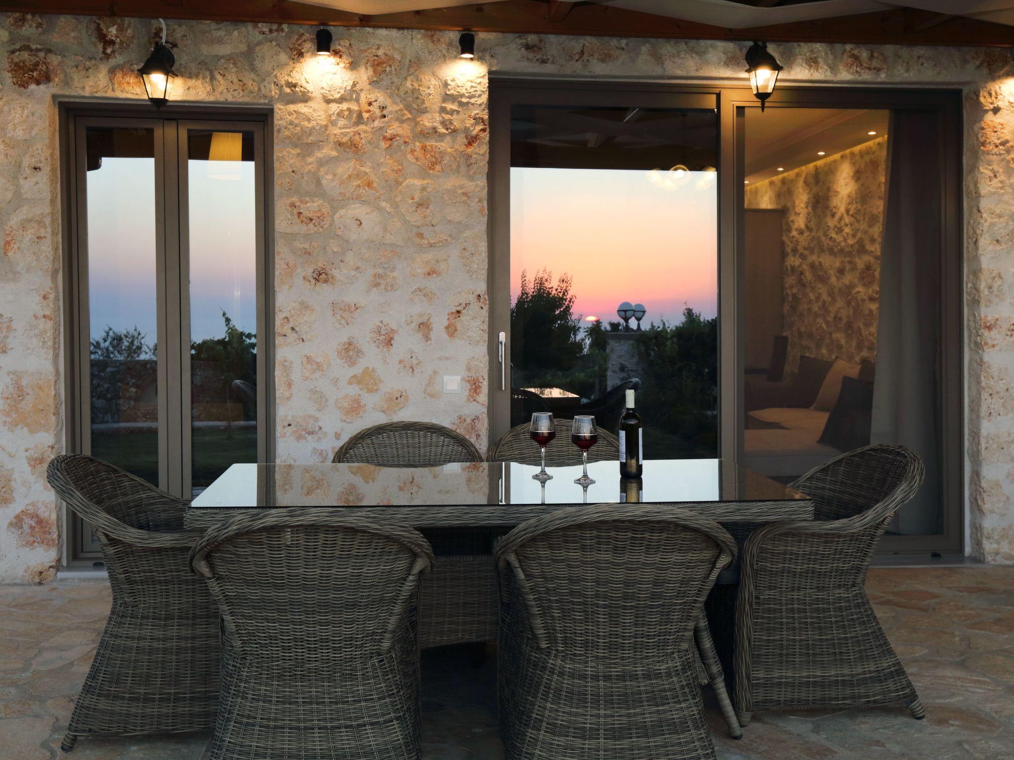 The outdoor area is perfect for relaxing moments, featuring a private swimming pool, comfortable seating area, BBQ, and a stunning view of the Ionian Sea and the sunset.