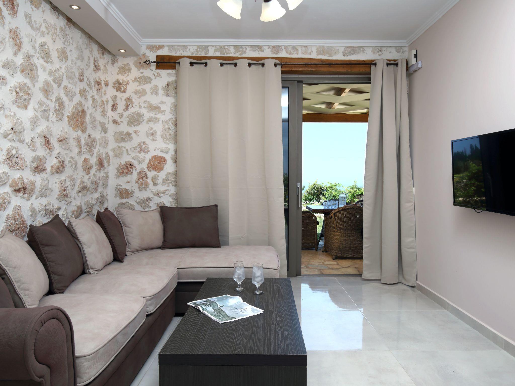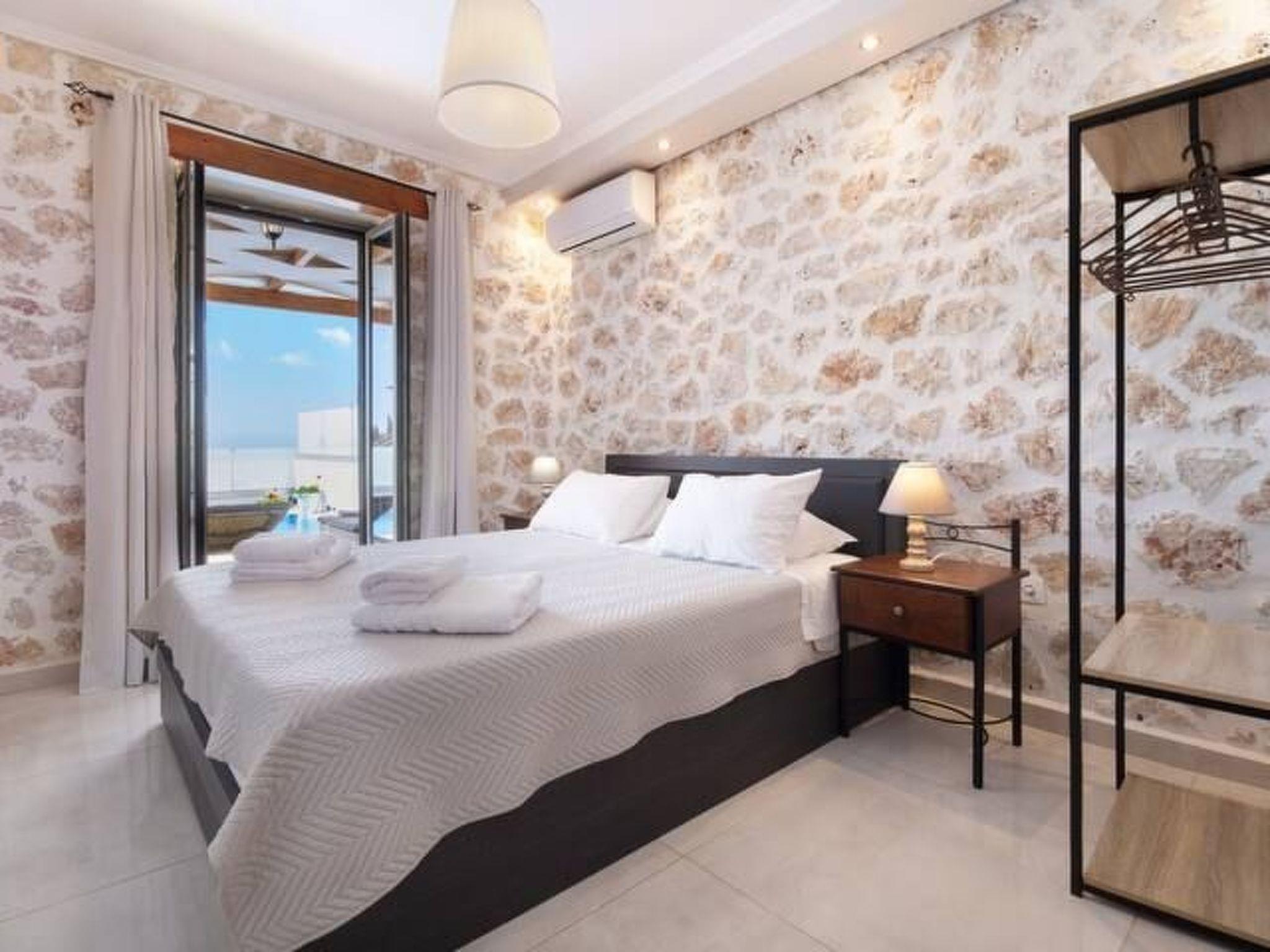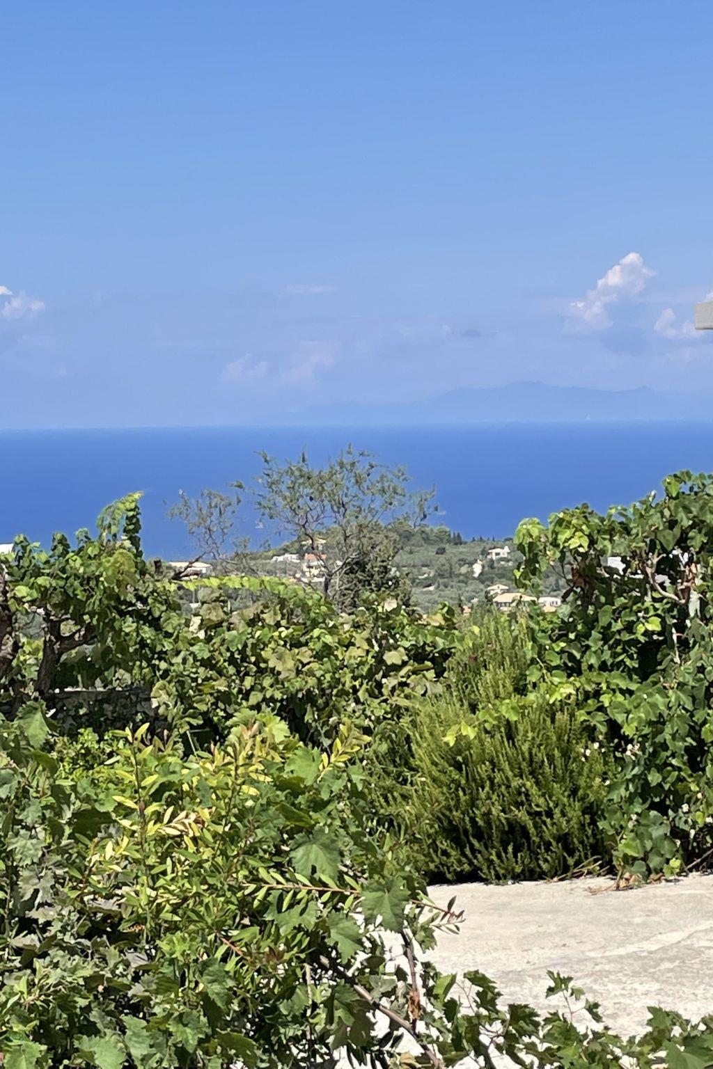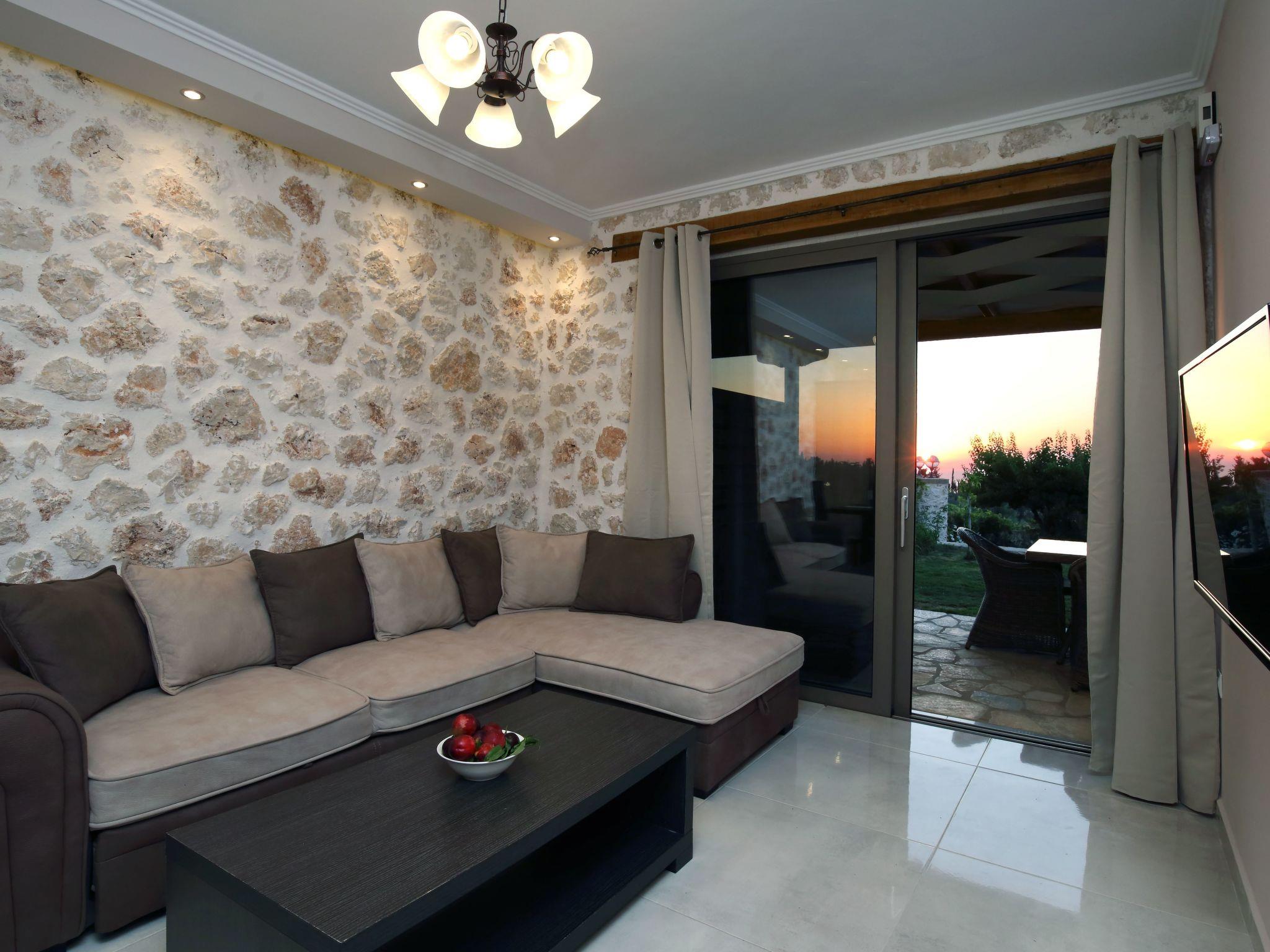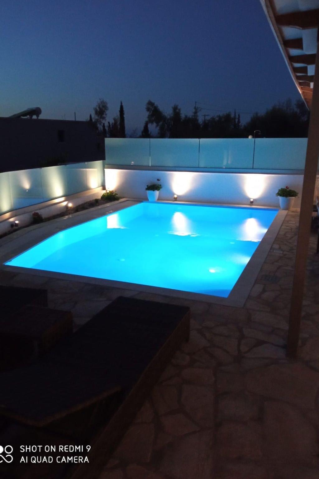 The outdoor area is perfect for relaxing moments, featuring a private swimming pool, comfortable seating area, BBQ, and a stunning view of the Ionian Sea and the sunset.