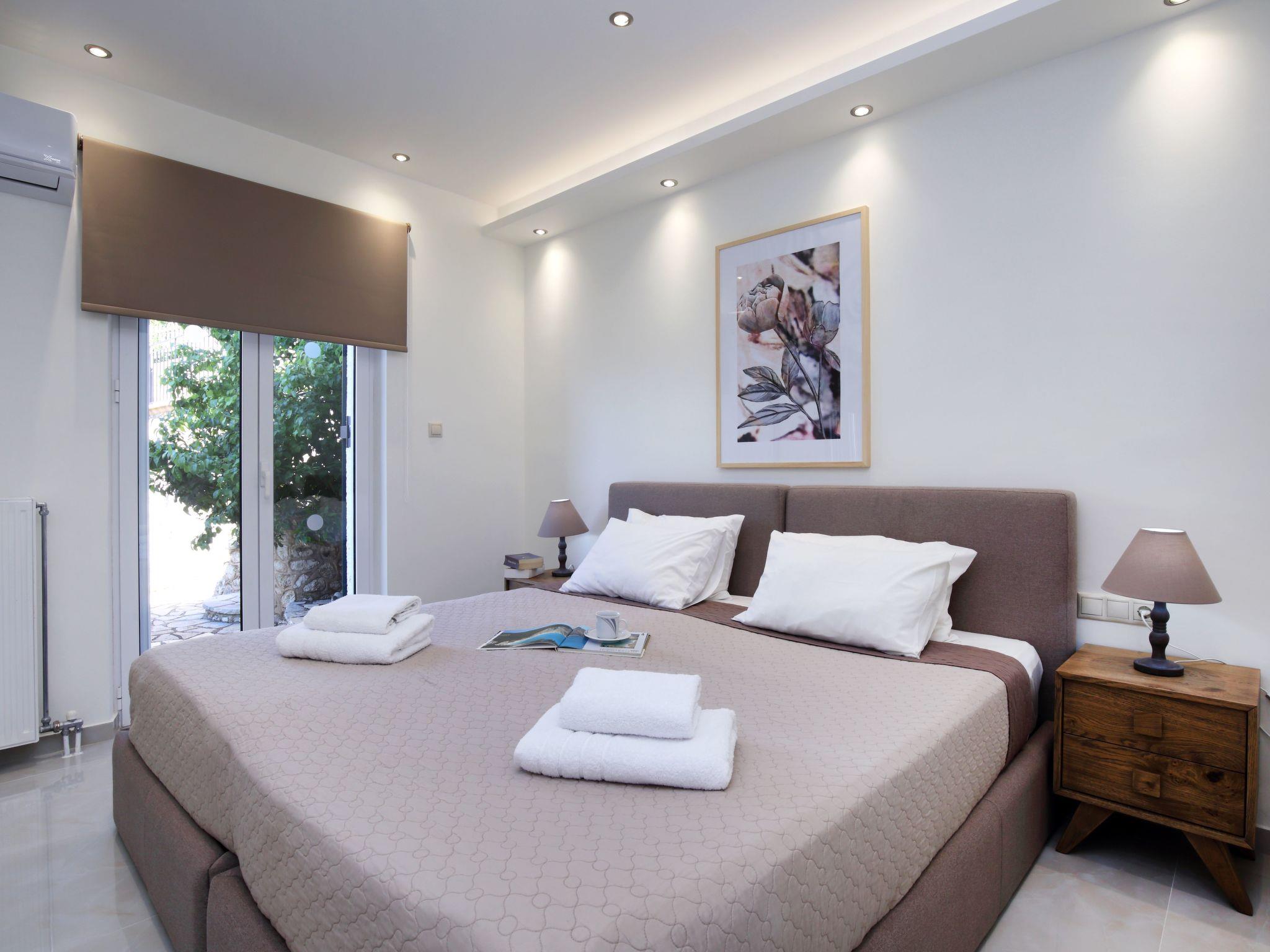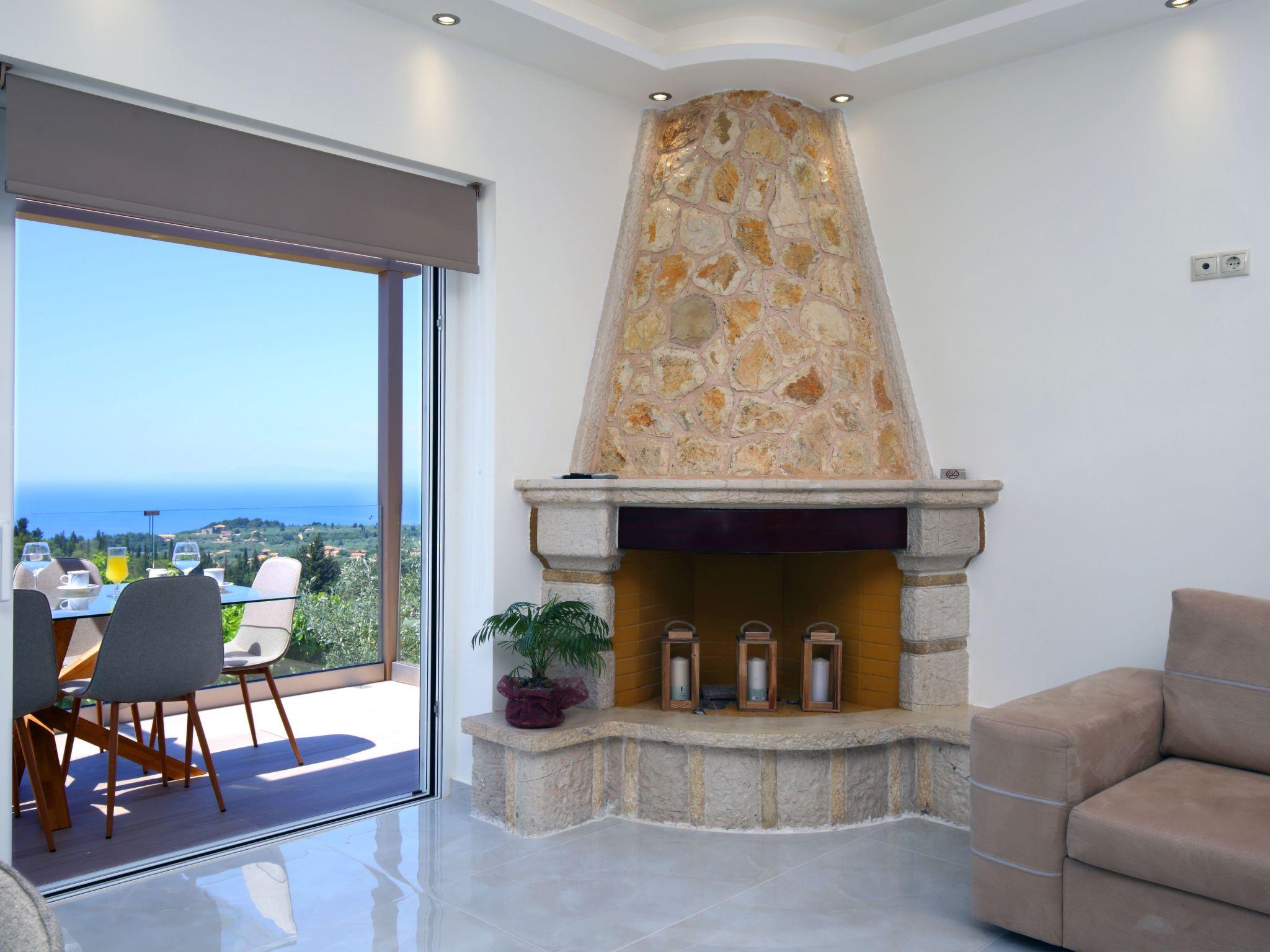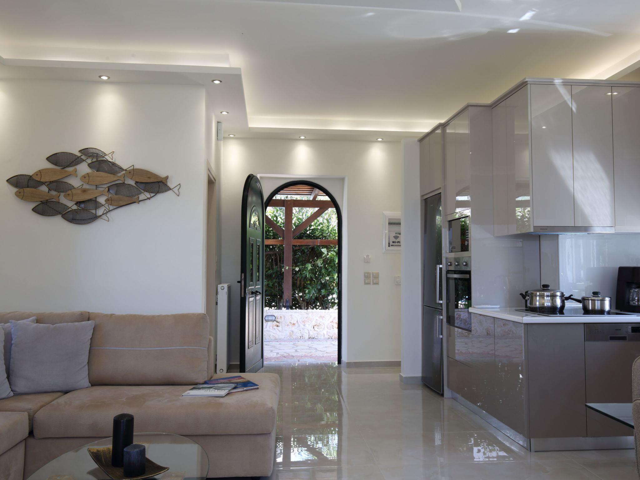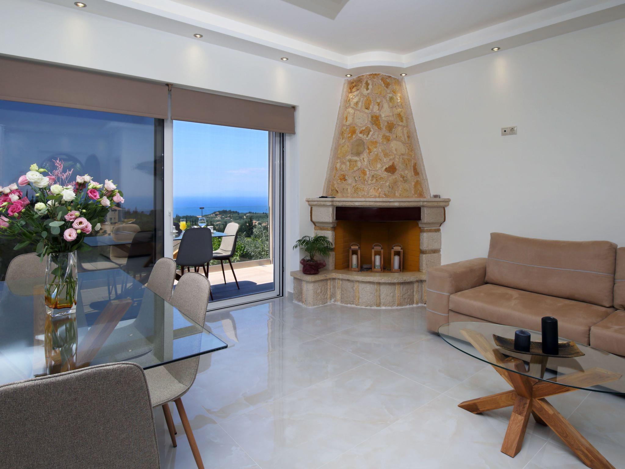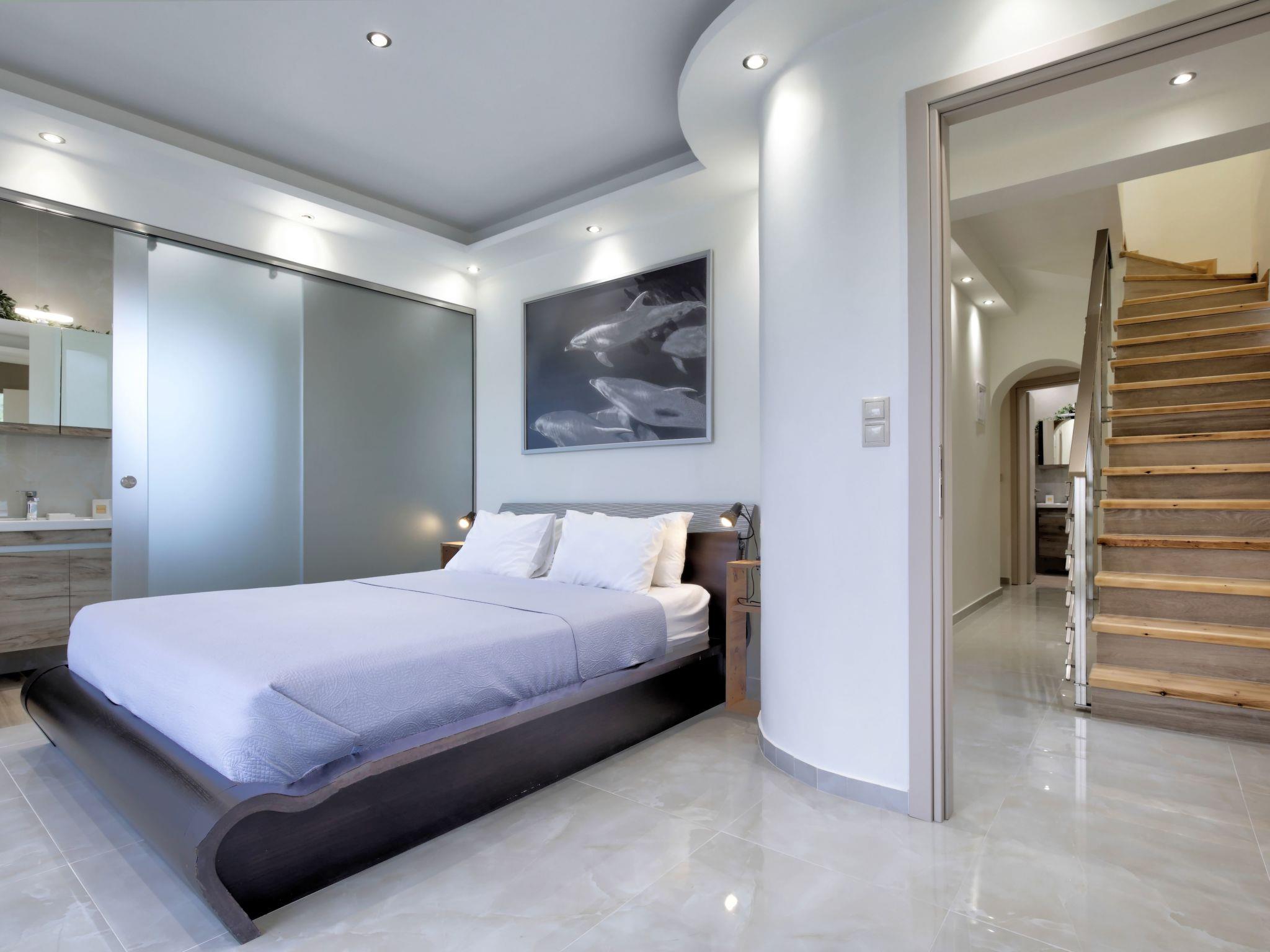 Inside, Villa Thanasis unfolds in a warmly inviting interior, where every detail has been carefully curated for your comfort. The heart of the villa features a spacious living room with a stunning stone-built fireplace, creating a cozy ambiance for relaxation and social gatherings. Adjacent to the living room, the open plan kitchen comes fully equipped with everything needed for culinary explorations. An additional convenience is provided by a bathroom with a shower on this level, ensuring all your needs are met with grace and style.