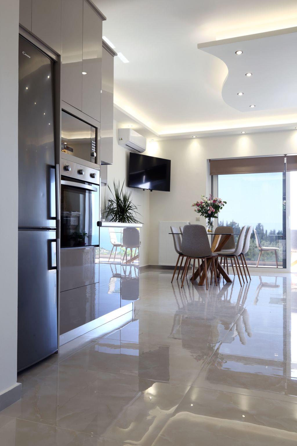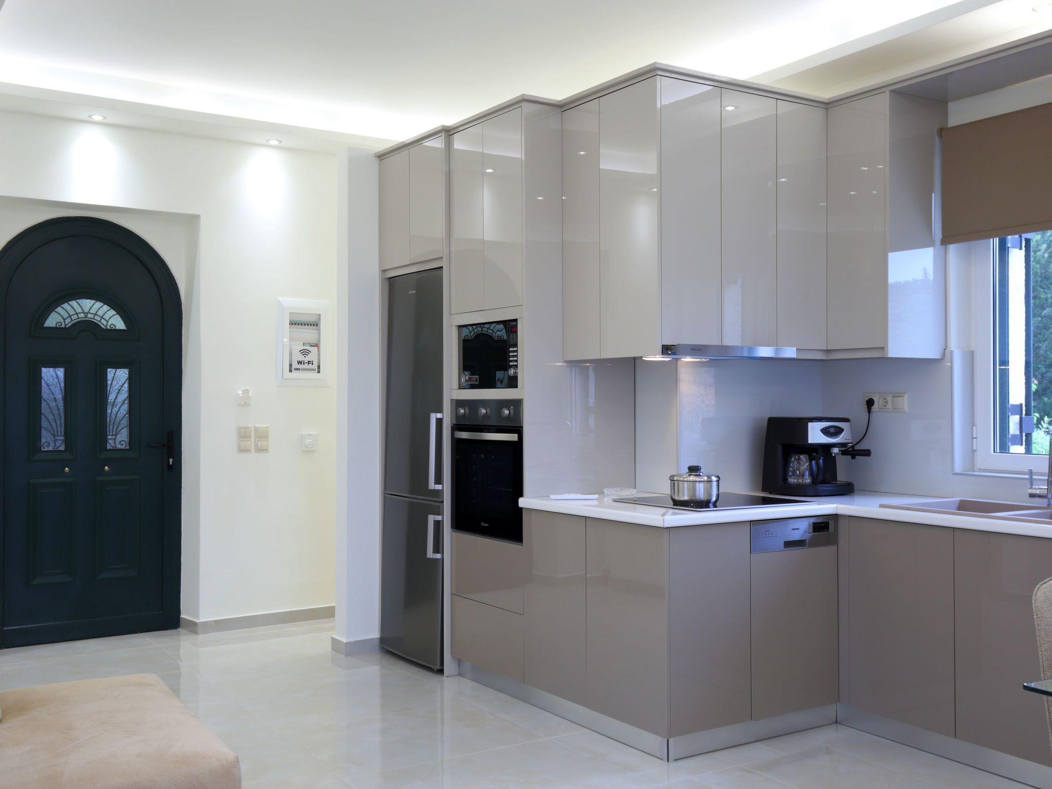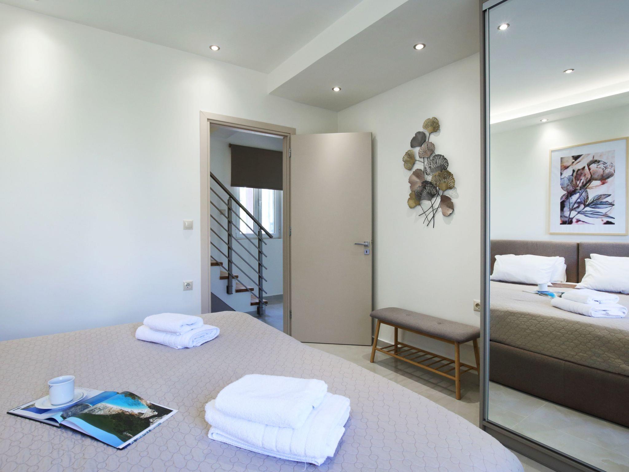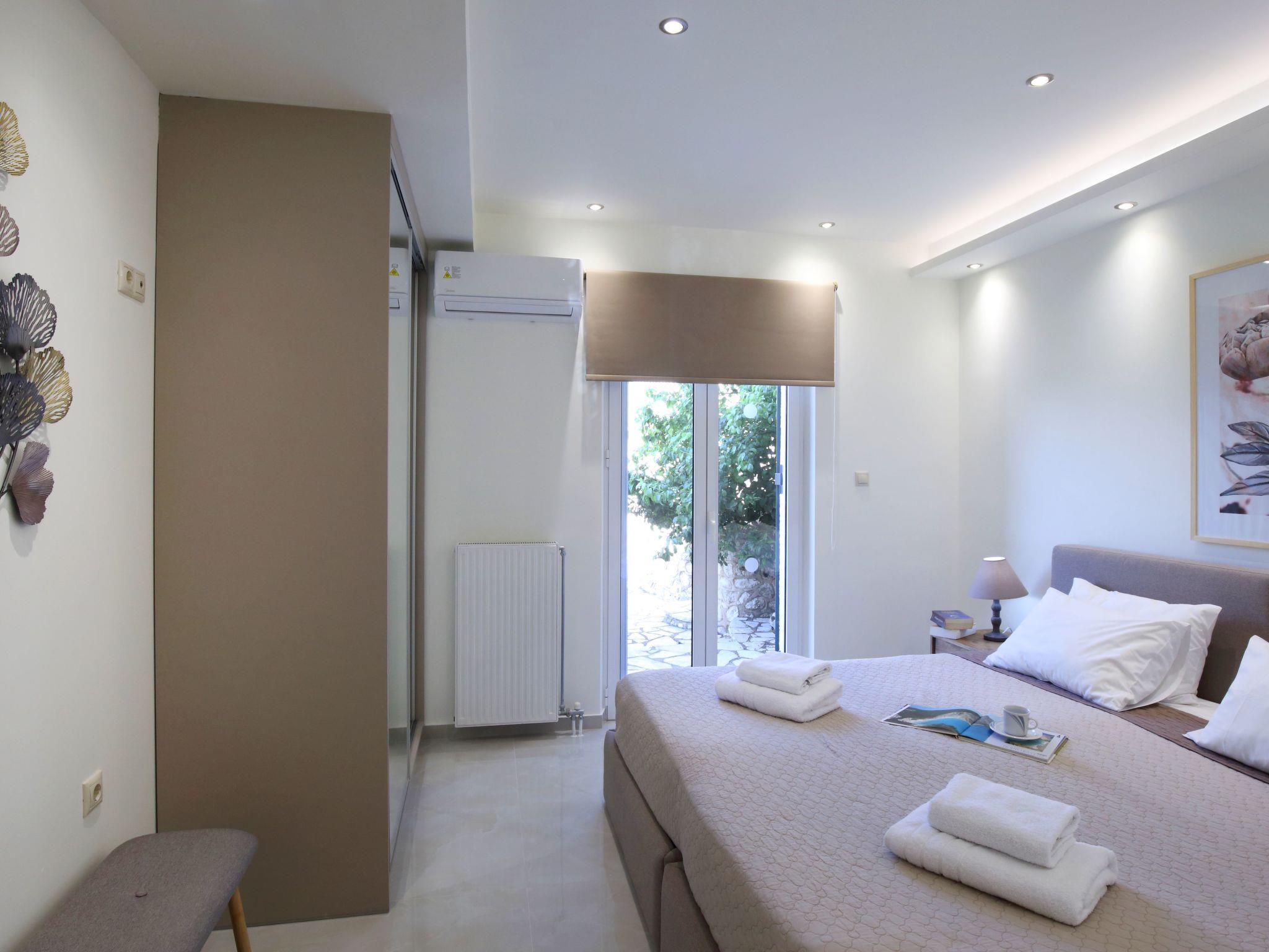 Inside, Villa Thanasis unfolds in a warmly inviting interior, where every detail has been carefully curated for your comfort. The heart of the villa features a spacious living room with a stunning stone-built fireplace, creating a cozy ambiance for relaxation and social gatherings. Adjacent to the living room, the open plan kitchen comes fully equipped with everything needed for culinary explorations. An additional convenience is provided by a bathroom with a shower on this level, ensuring all your needs are met with grace and style.