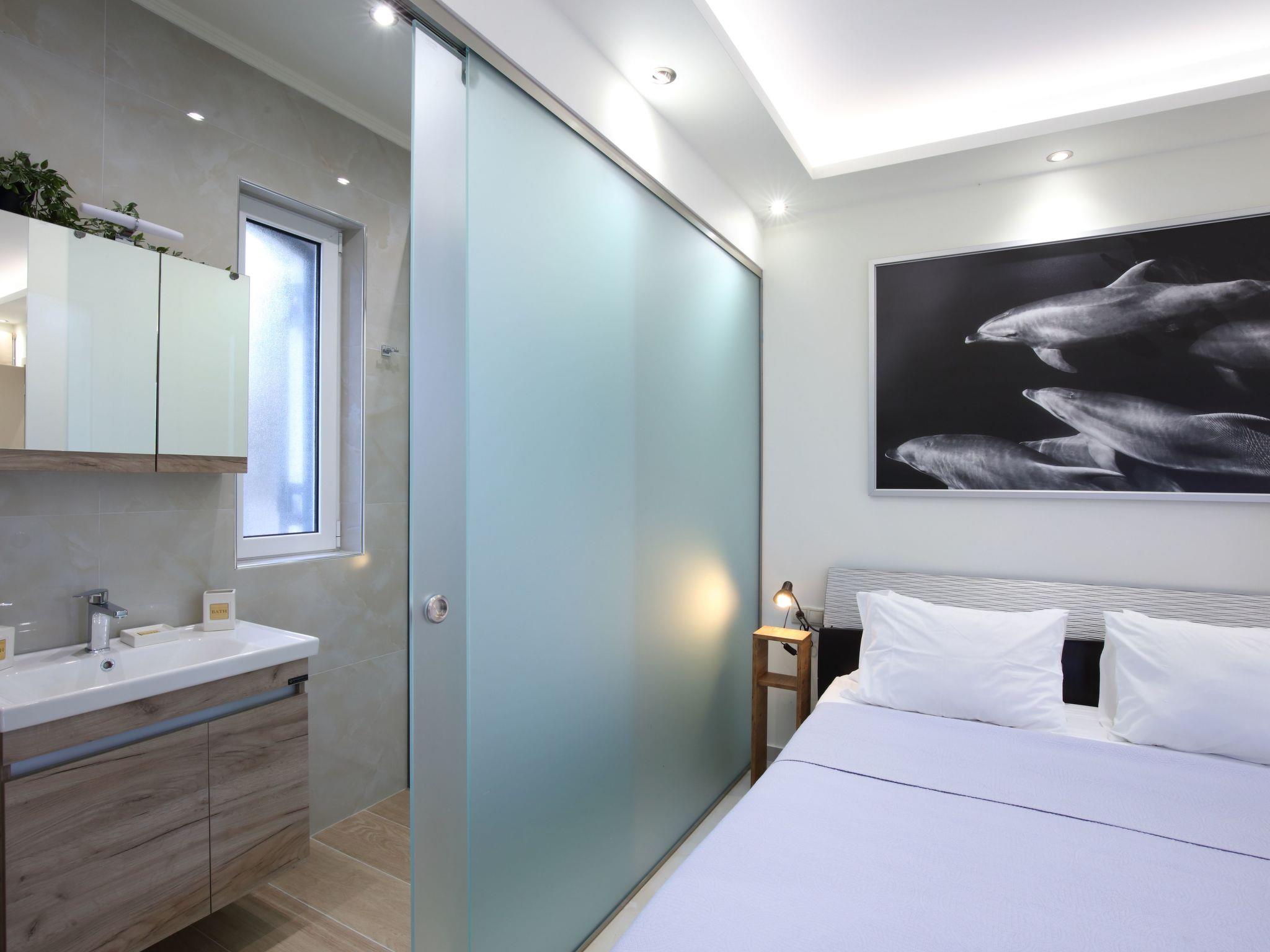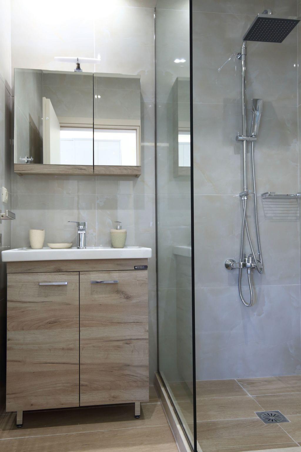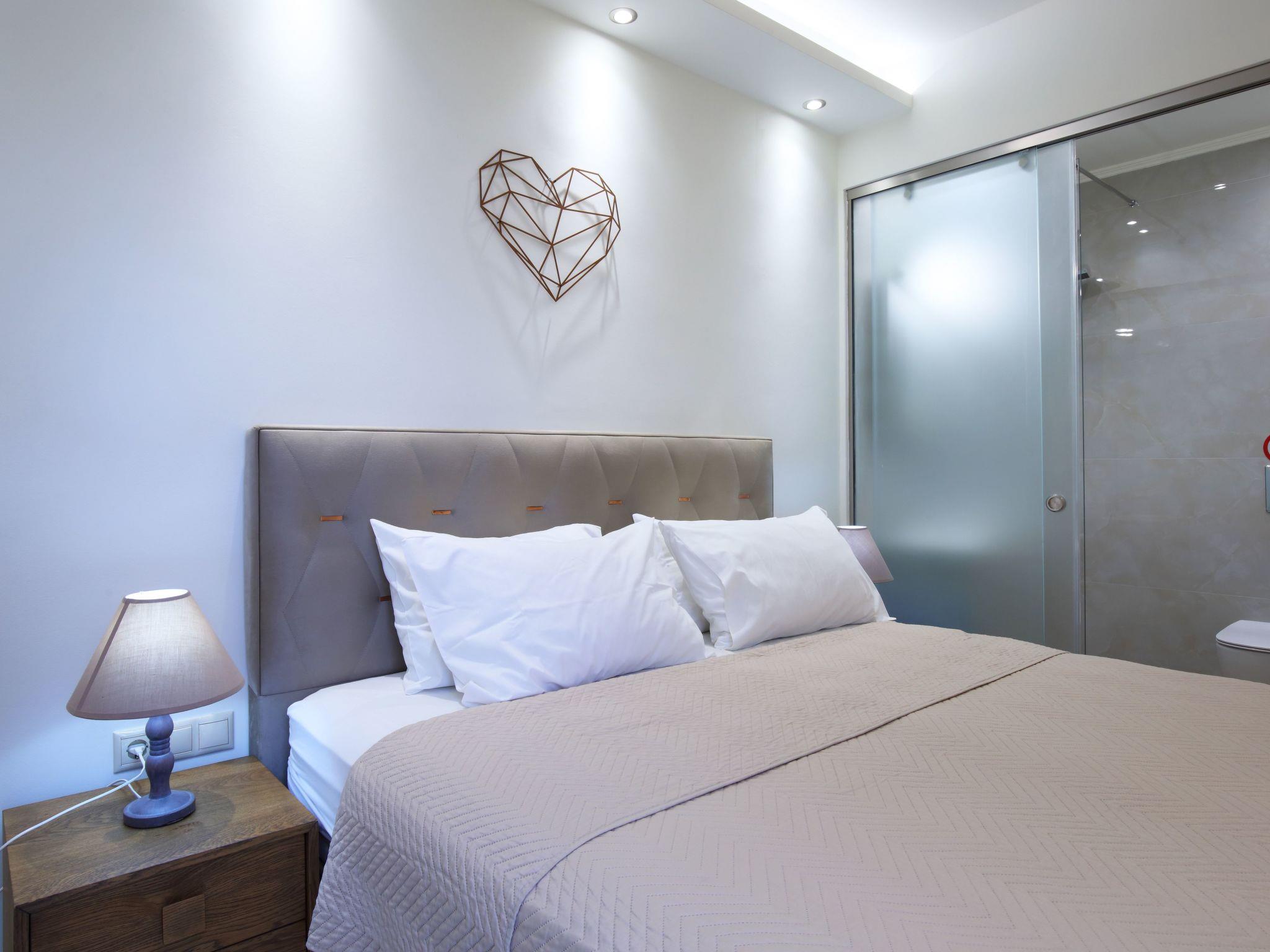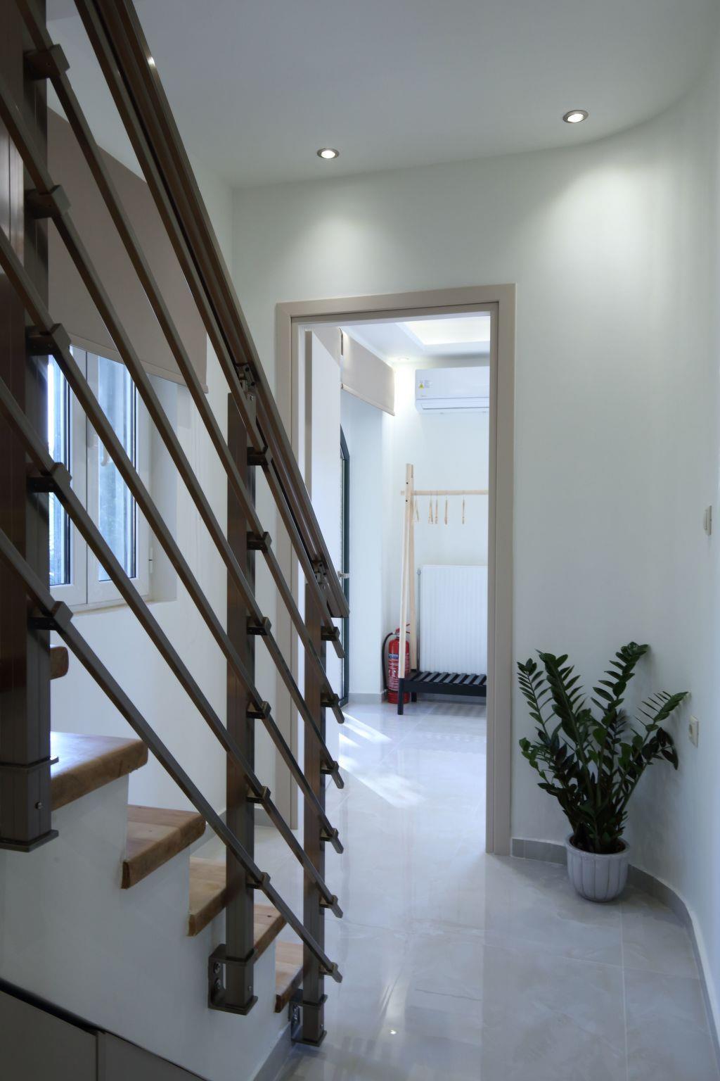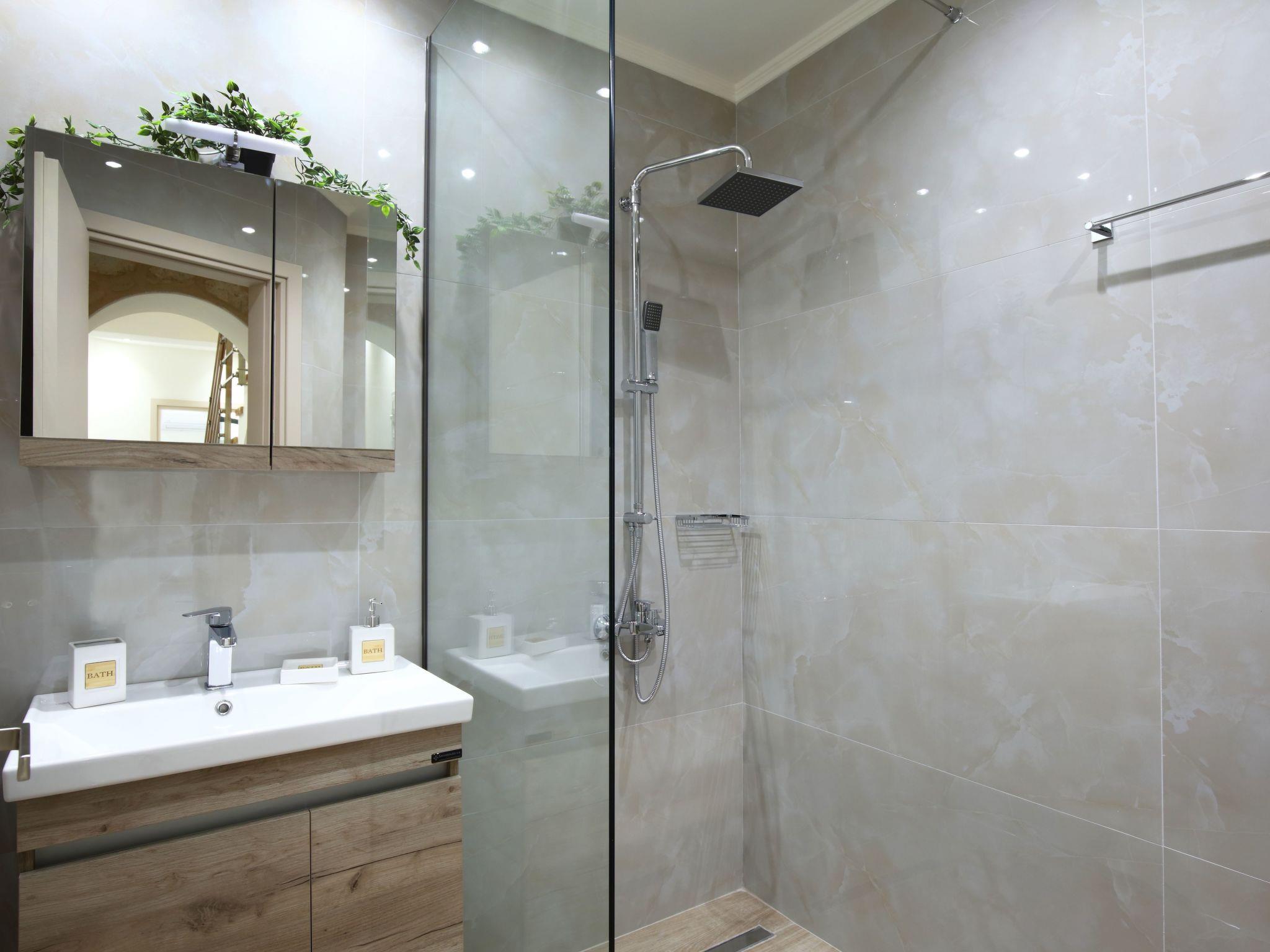 Inside, Villa Thanasis unfolds in a warmly inviting interior, where every detail has been carefully curated for your comfort. The heart of the villa features a spacious living room with a stunning stone-built fireplace, creating a cozy ambiance for relaxation and social gatherings. Adjacent to the living room, the open plan kitchen comes fully equipped with everything needed for culinary explorations. An additional convenience is provided by a bathroom with a shower on this level, ensuring all your needs are met with grace and style.