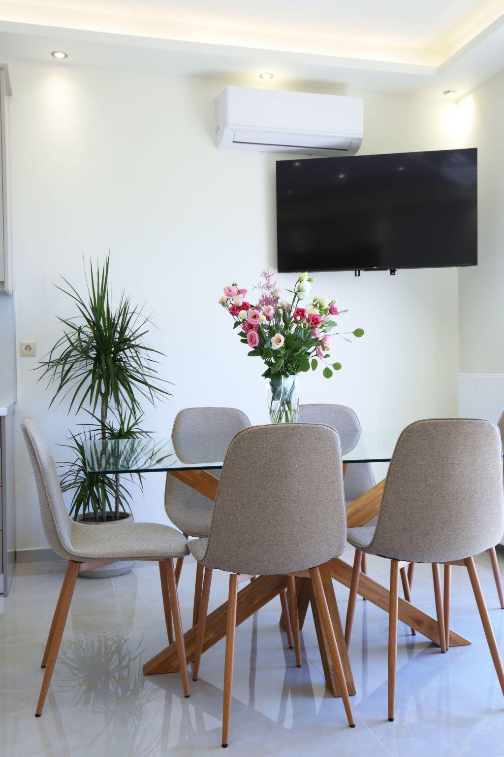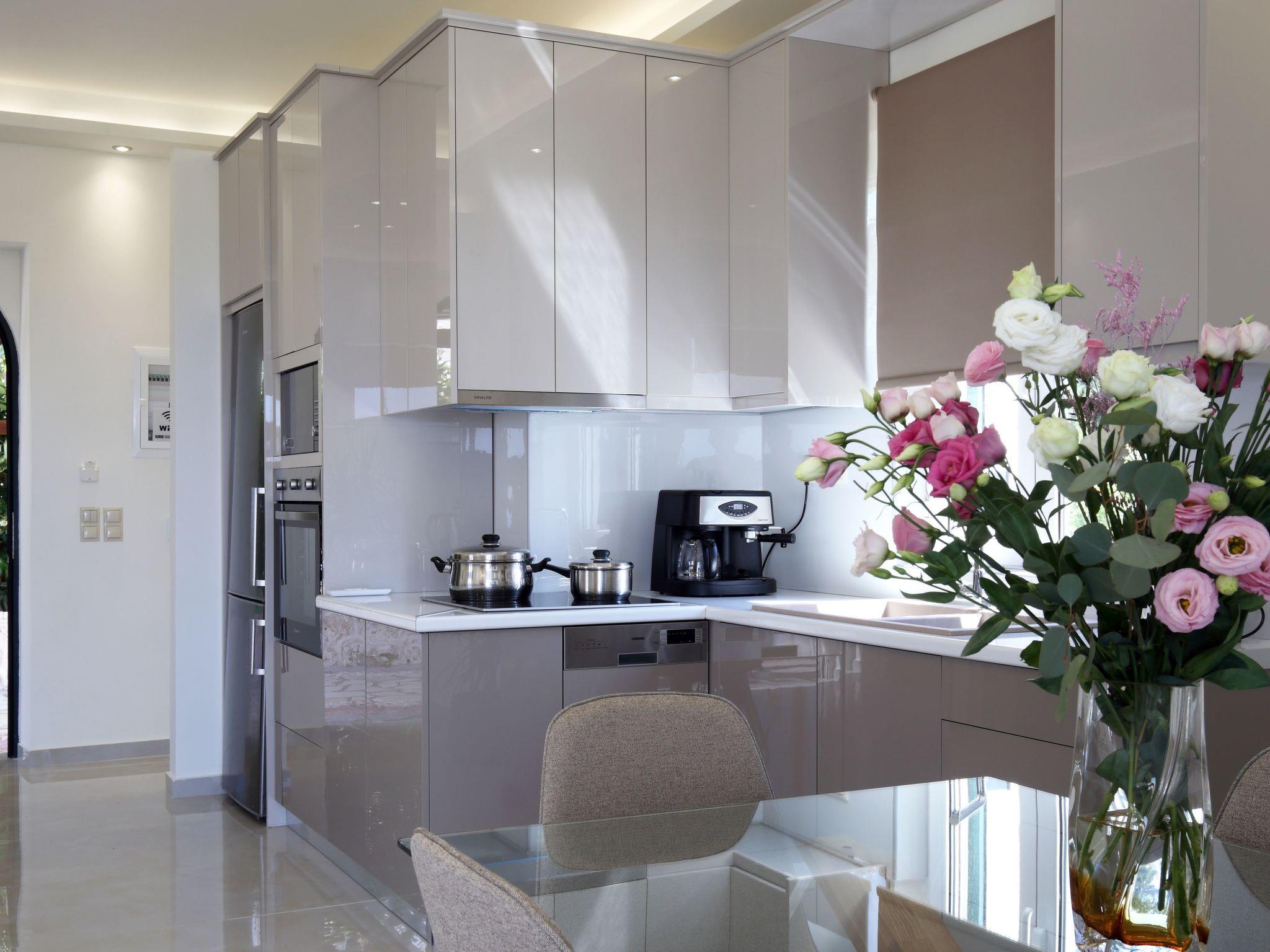 The exterior of Villa Thanasis is designed to seamlessly integrate with the surrounding nature, featuring a mesmerizing pool area that invites you to bask in the sun, relax, and enjoy the peaceful environment. The green garden, flourishing with flowers, and the dedicated barbecue area offer additional spaces for outdoor leisure and dining. Ample parking space confirms that every aspect of your stay is catered to with thoughtful attention to detail.