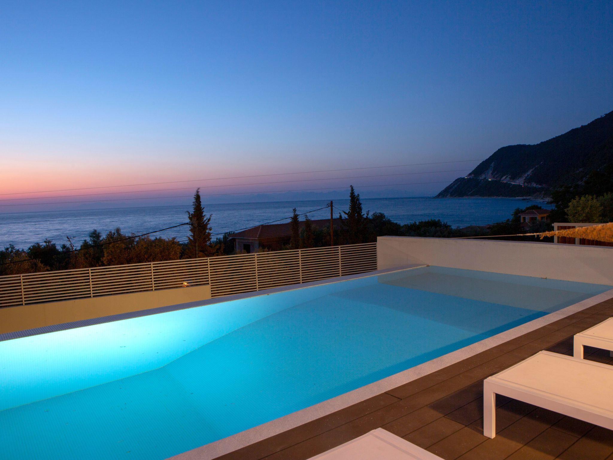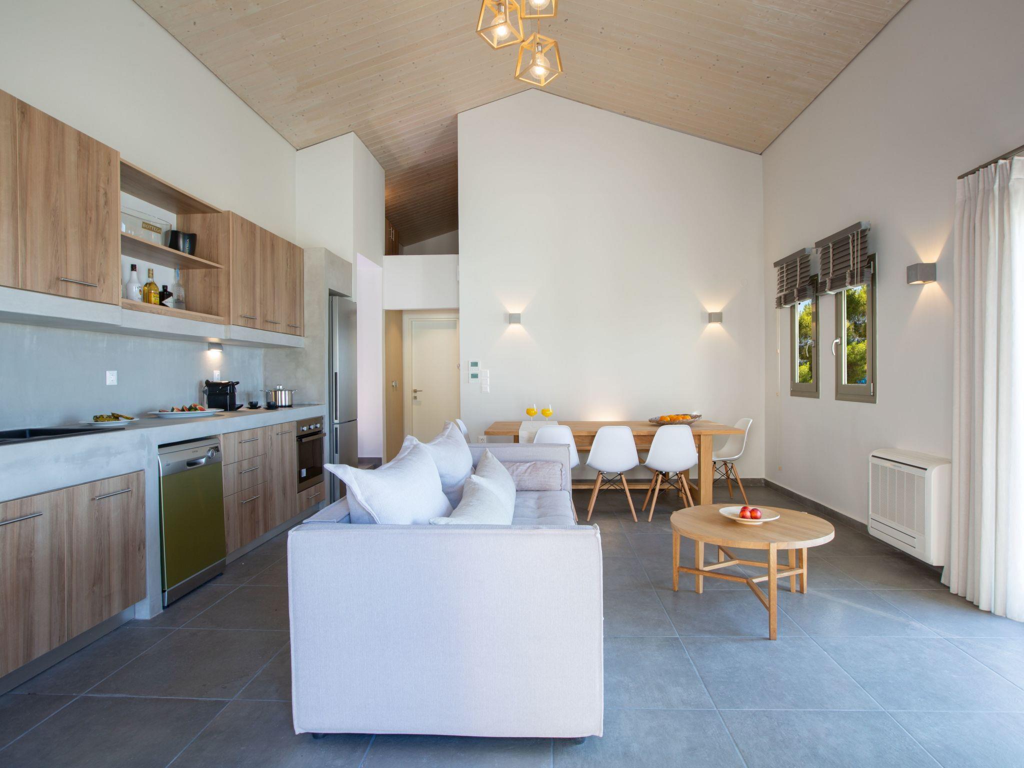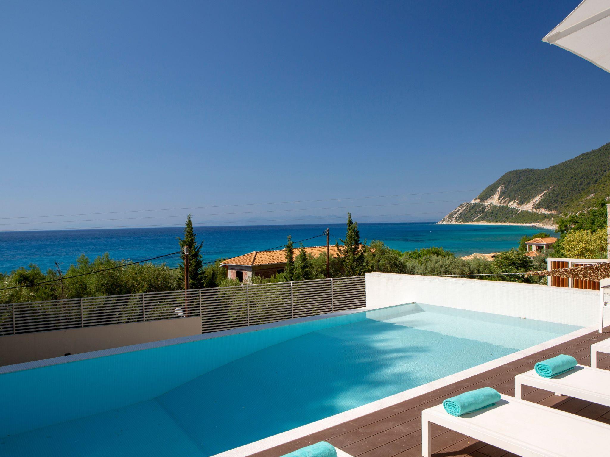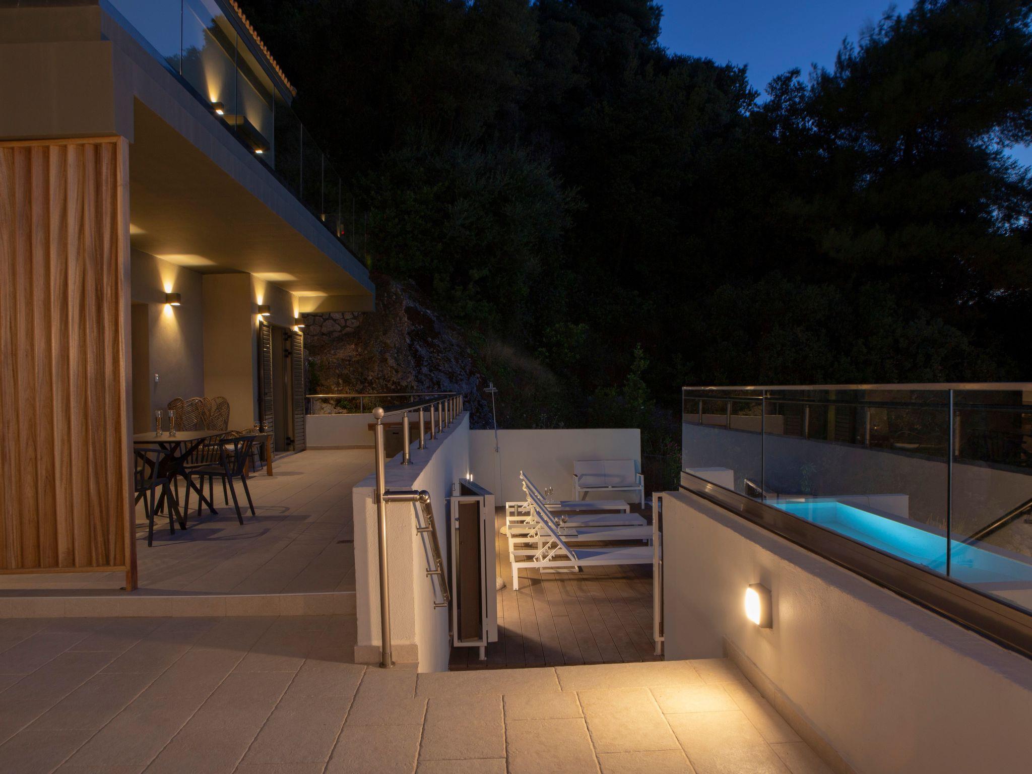 Ionian White villa has 5 bedrooms in total and can comfortably accommodate 9 guests and offers a folded extra bed for one more guest. The property is separated in two independent floors, allowing guests to enjoy privacy and seclusion. From the parking area, just few steps lead you to the swimming pool area with sunbeds and umbrellas that invite you to gaze at the endless blue Ionian sea and savor summer evenings. The stairs near the pool will lead you to the first floor of the villa that composes of a contemporary large kitchen with open layout, in contact with living room and dining area, plus one double bedroom with ensuite bathroom. Walking behind the dining area and few steps up is a second bedroom with double bed and ensuite bathroom.Outside the first floor, a large veranda with lovely sea views and an easy access to the swimming pool area is accessible through the front bedroom and living room, so you can enjoy the nice outdoor sitting area. From the beautiful outside space you can walk up the stairs to reach the second floor of the villa. Outside the entrance you find a large concrete summer living room, that will generously host you for your evening drinks. When entering the second floor, you see elegantly designed high ceilings, spacious open plan and wonderful natural sun light in the kitchen and living room, that will welcome you in. Through this large living room, connected to the wide kitchen and lovely dining area, you can access the spacious balcony with a panoramic view of the endless turquoise water of the west coast.On this floor are situated, one master bedroom in the front with access to the balcony, a bathroom with shower, and in the back one more room with 2 single beds, that can be easily converted to king size double bed with ensuite bathroom. Right beside this room, a small extra bedroom with one single bed is also an excellent option to sleep a child.