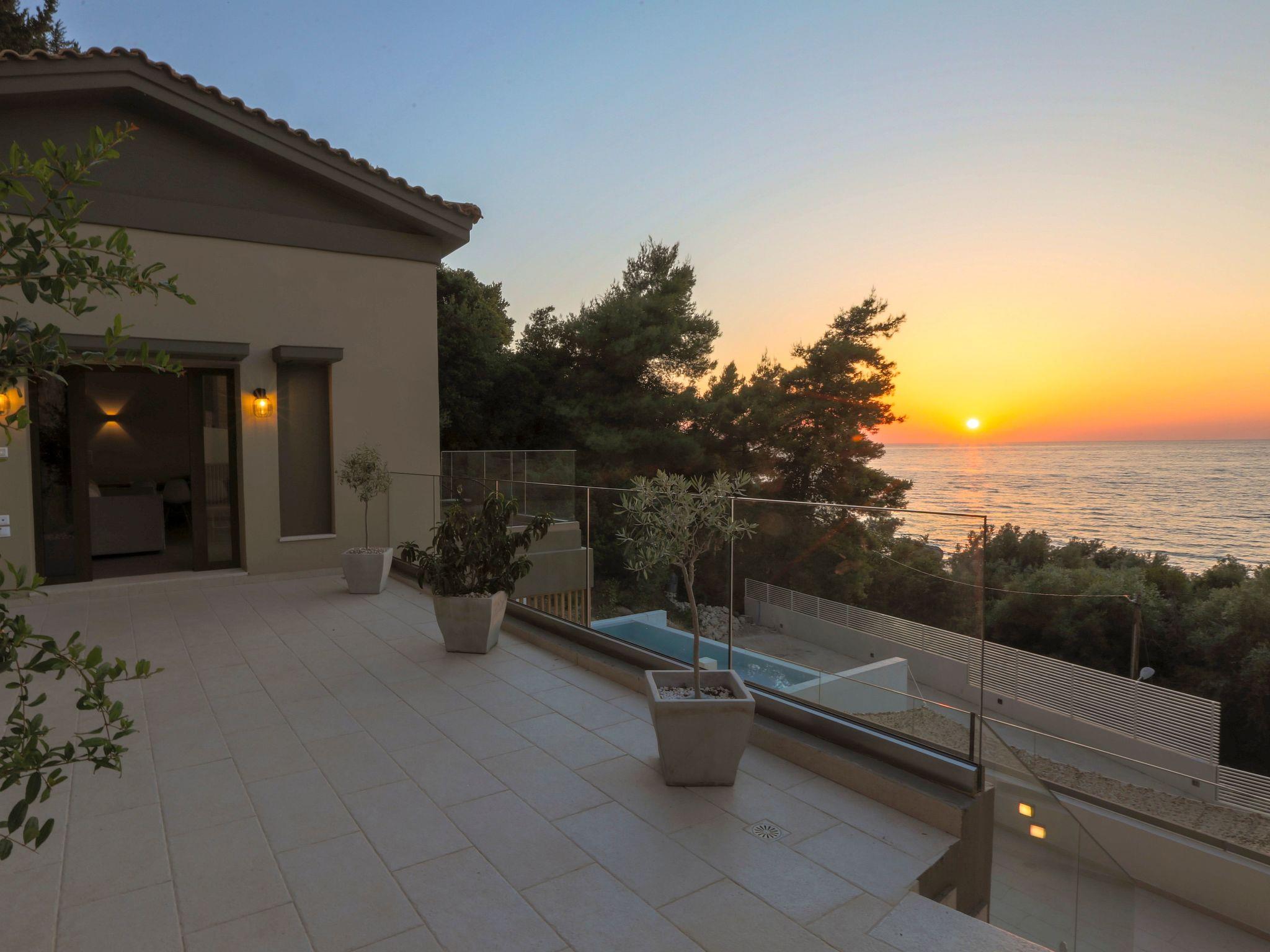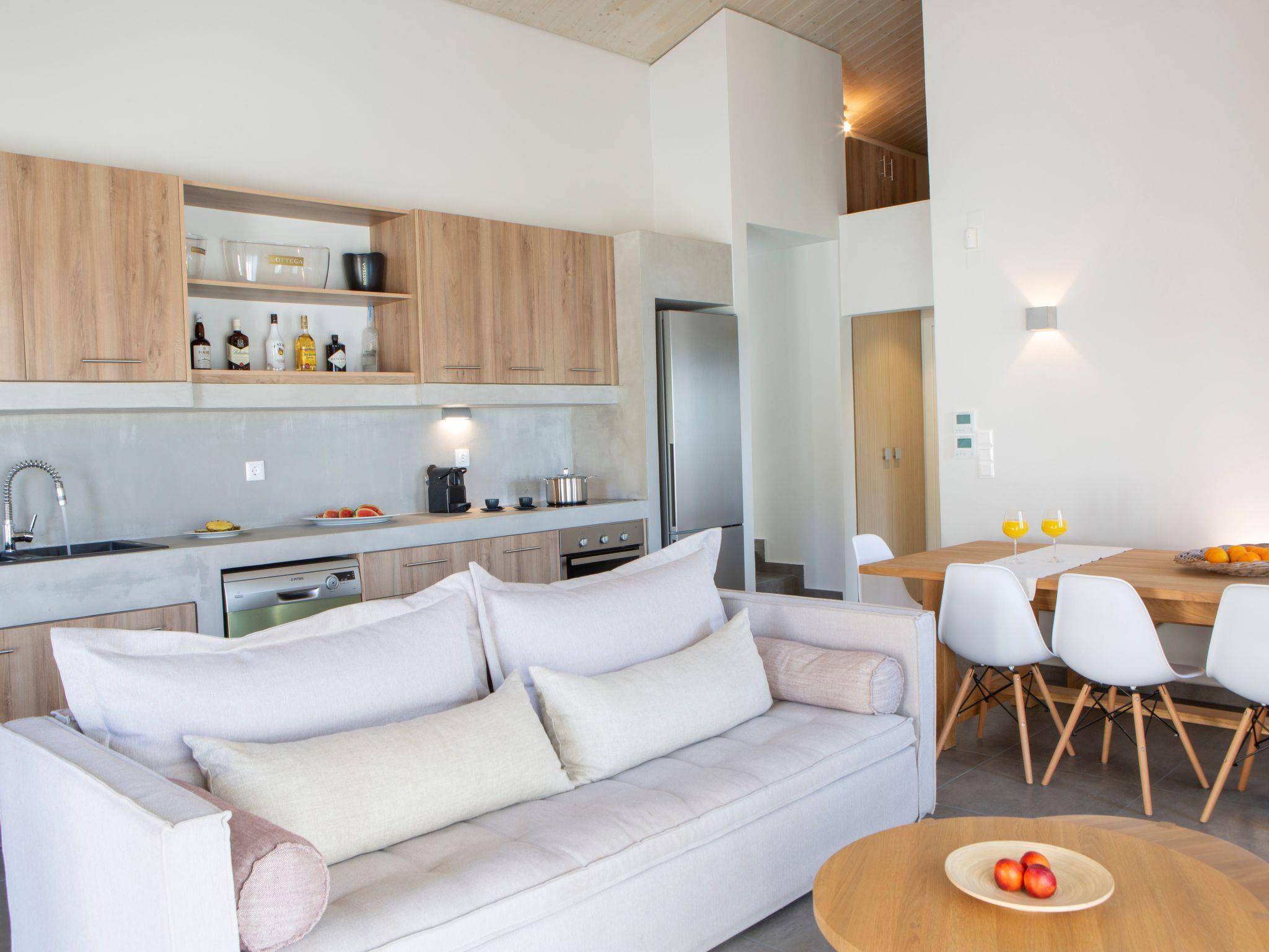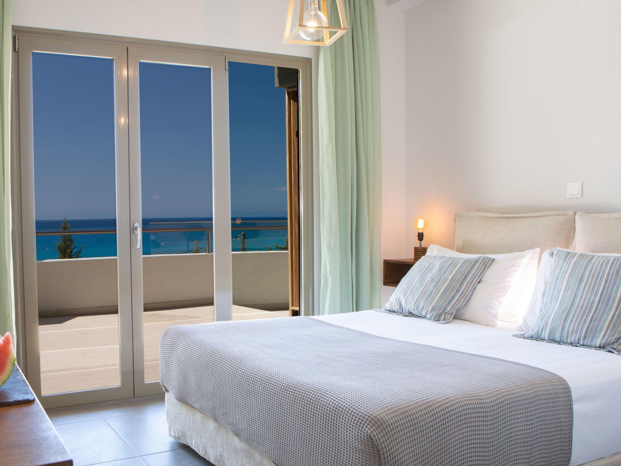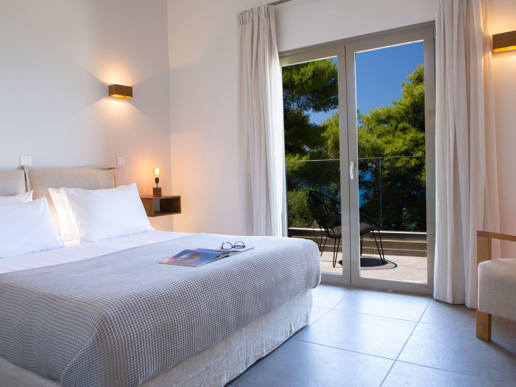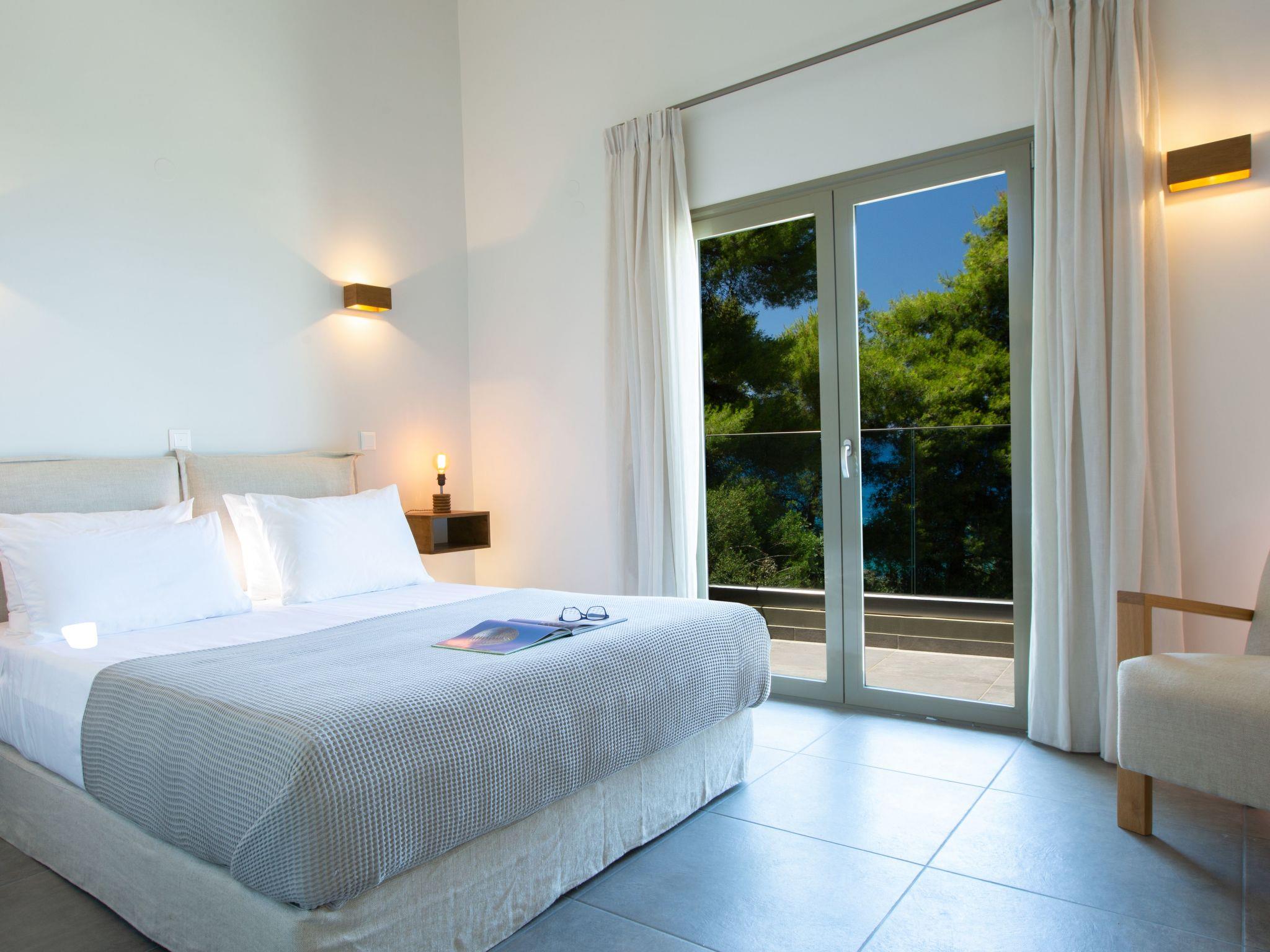 Ionian White villa has 5 bedrooms in total and can comfortably accommodate 9 guests and offers a folded extra bed for one more guest. The property is separated in two independent floors, allowing guests to enjoy privacy and seclusion. From the parking area, just few steps lead you to the swimming pool area with sunbeds and umbrellas that invite you to gaze at the endless blue Ionian sea and savor summer evenings. The stairs near the pool will lead you to the first floor of the villa that composes of a contemporary large kitchen with open layout, in contact with living room and dining area, plus one double bedroom with ensuite bathroom. Walking behind the dining area and few steps up is a second bedroom with double bed and ensuite bathroom.Outside the first floor, a large veranda with lovely sea views and an easy access to the swimming pool area is accessible through the front bedroom and living room, so you can enjoy the nice outdoor sitting area. From the beautiful outside space you can walk up the stairs to reach the second floor of the villa. Outside the entrance you find a large concrete summer living room, that will generously host you for your evening drinks. When entering the second floor, you see elegantly designed high ceilings, spacious open plan and wonderful natural sun light in the kitchen and living room, that will welcome you in. Through this large living room, connected to the wide kitchen and lovely dining area, you can access the spacious balcony with a panoramic view of the endless turquoise water of the west coast.On this floor are situated, one master bedroom in the front with access to the balcony, a bathroom with shower, and in the back one more room with 2 single beds, that can be easily converted to king size double bed with ensuite bathroom. Right beside this room, a small extra bedroom with one single bed is also an excellent option to sleep a child.