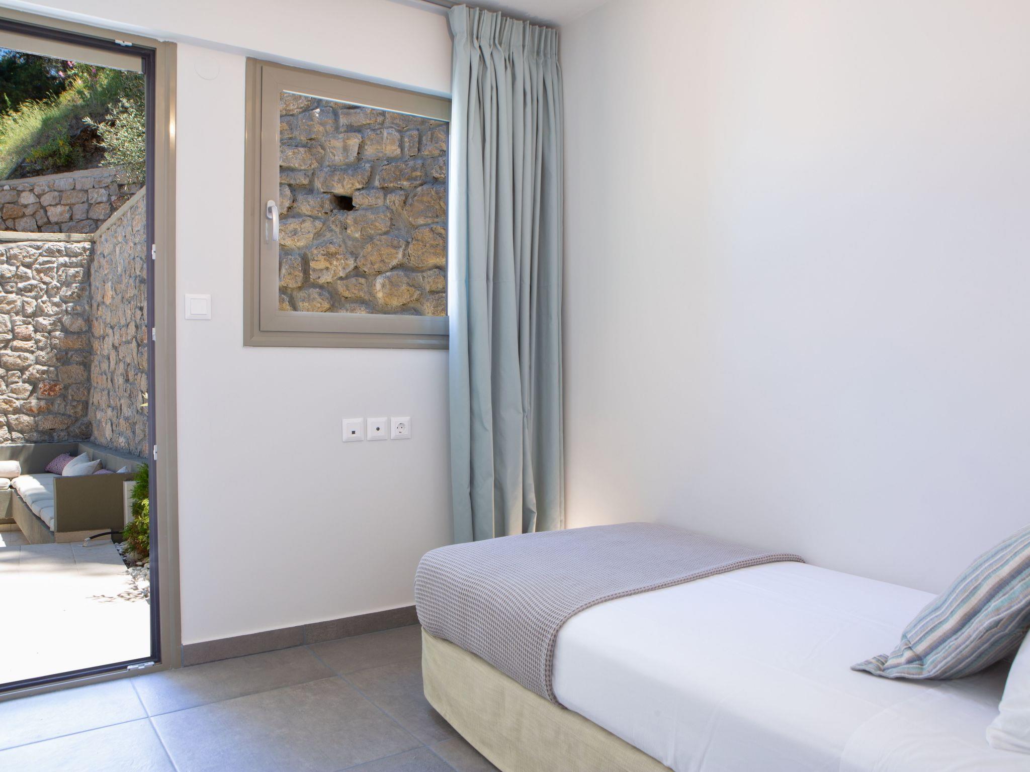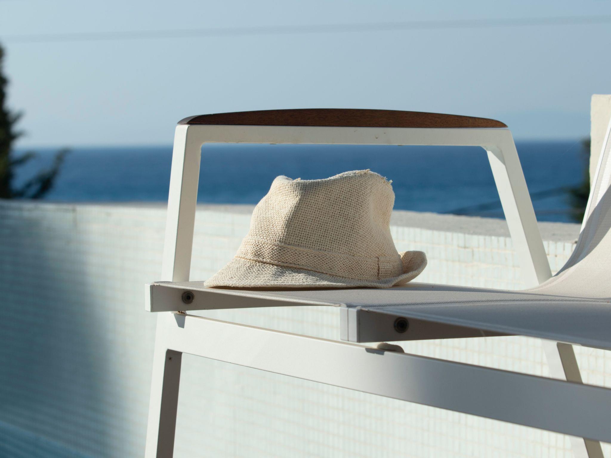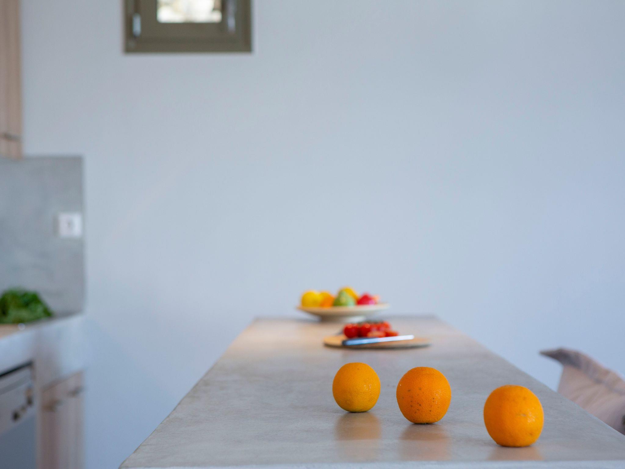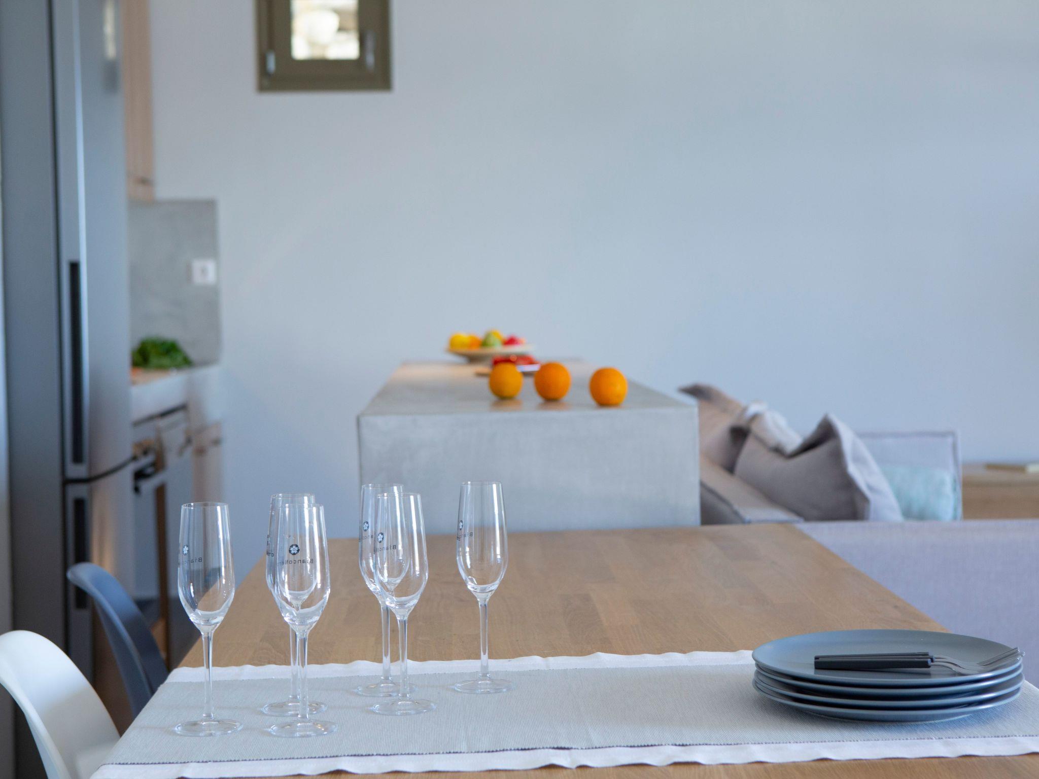 Ionian White villa has 5 bedrooms in total and can comfortably accommodate 9 guests and offers a folded extra bed for one more guest. The property is separated in two independent floors, allowing guests to enjoy privacy and seclusion. From the parking area, just few steps lead you to the swimming pool area with sunbeds and umbrellas that invite you to gaze at the endless blue Ionian sea and savor summer evenings. The stairs near the pool will lead you to the first floor of the villa that composes of a contemporary large kitchen with open layout, in contact with living room and dining area, plus one double bedroom with ensuite bathroom. Walking behind the dining area and few steps up is a second bedroom with double bed and ensuite bathroom.Outside the first floor, a large veranda with lovely sea views and an easy access to the swimming pool area is accessible through the front bedroom and living room, so you can enjoy the nice outdoor sitting area. From the beautiful outside space you can walk up the stairs to reach the second floor of the villa. Outside the entrance you find a large concrete summer living room, that will generously host you for your evening drinks. When entering the second floor, you see elegantly designed high ceilings, spacious open plan and wonderful natural sun light in the kitchen and living room, that will welcome you in. Through this large living room, connected to the wide kitchen and lovely dining area, you can access the spacious balcony with a panoramic view of the endless turquoise water of the west coast.On this floor are situated, one master bedroom in the front with access to the balcony, a bathroom with shower, and in the back one more room with 2 single beds, that can be easily converted to king size double bed with ensuite bathroom. Right beside this room, a small extra bedroom with one single bed is also an excellent option to sleep a child.