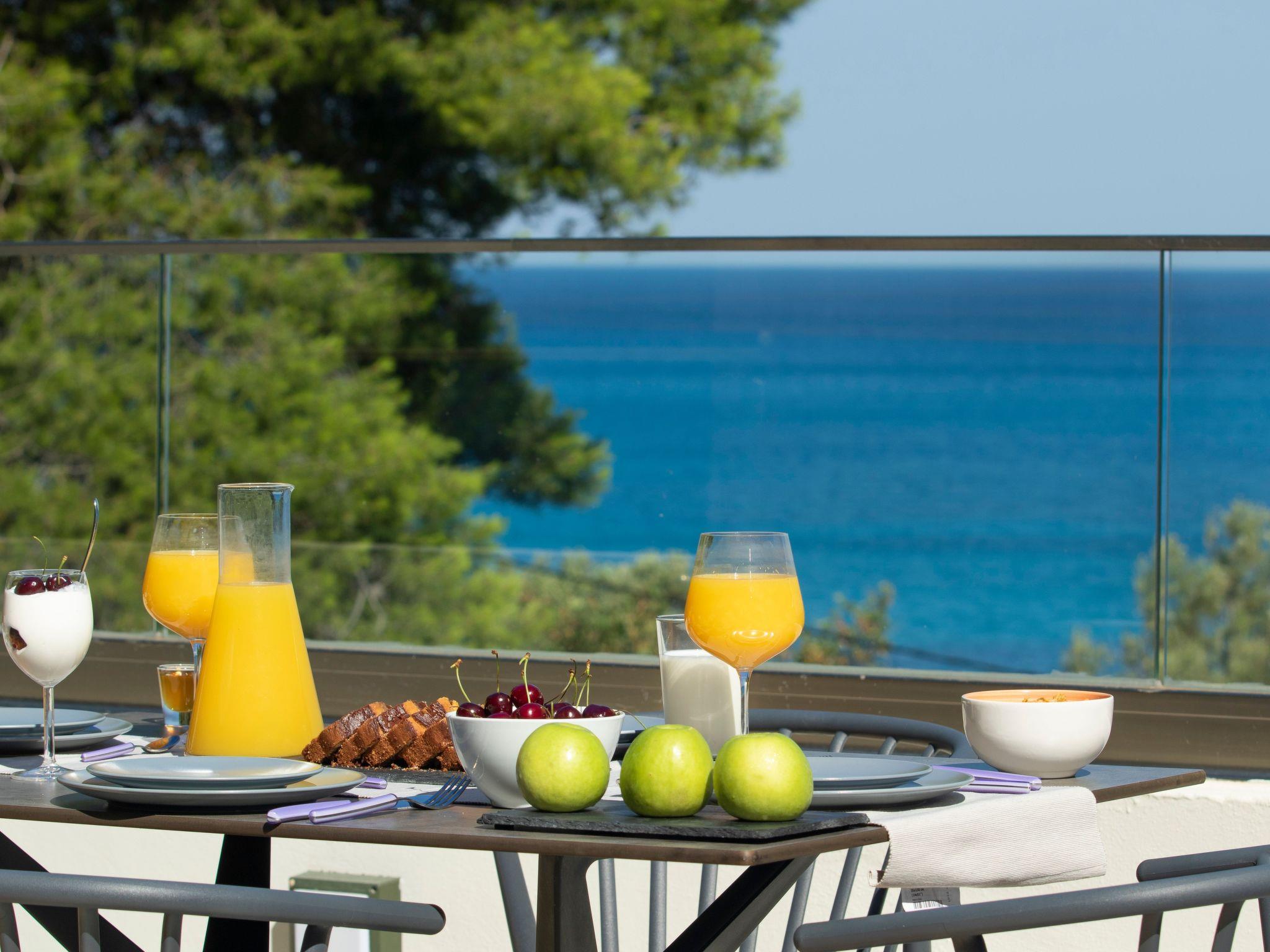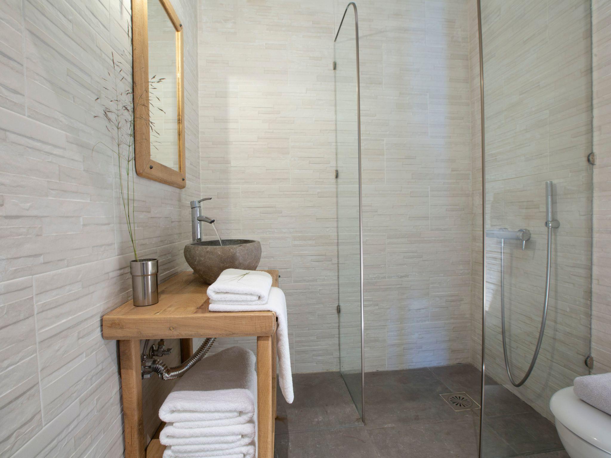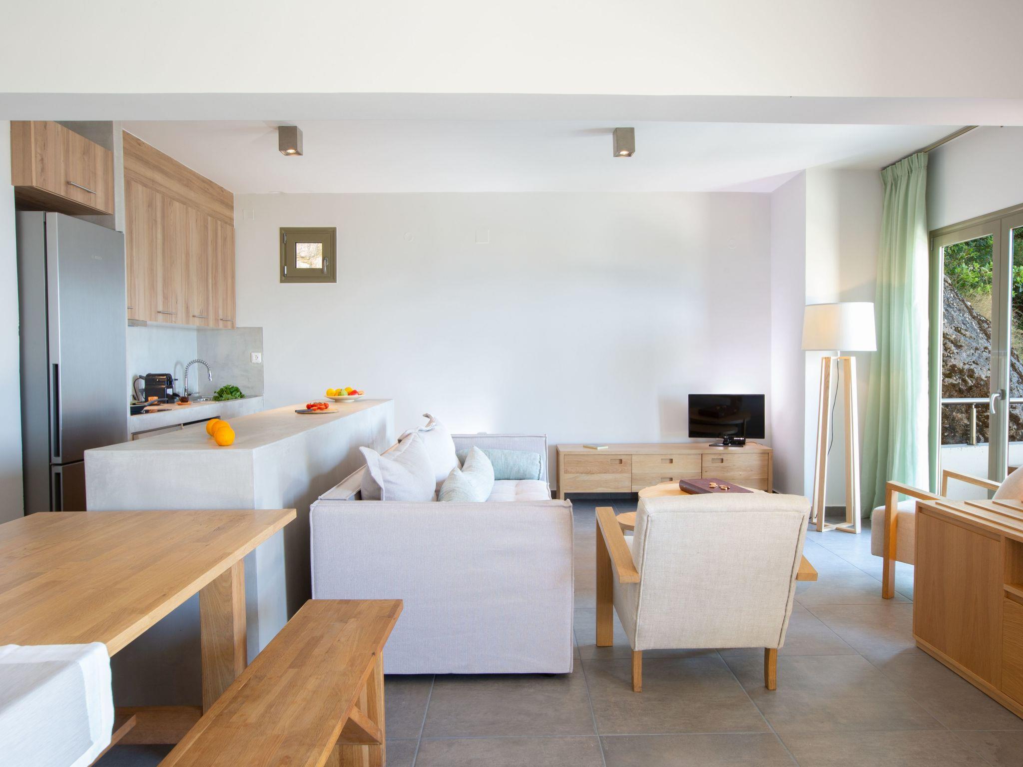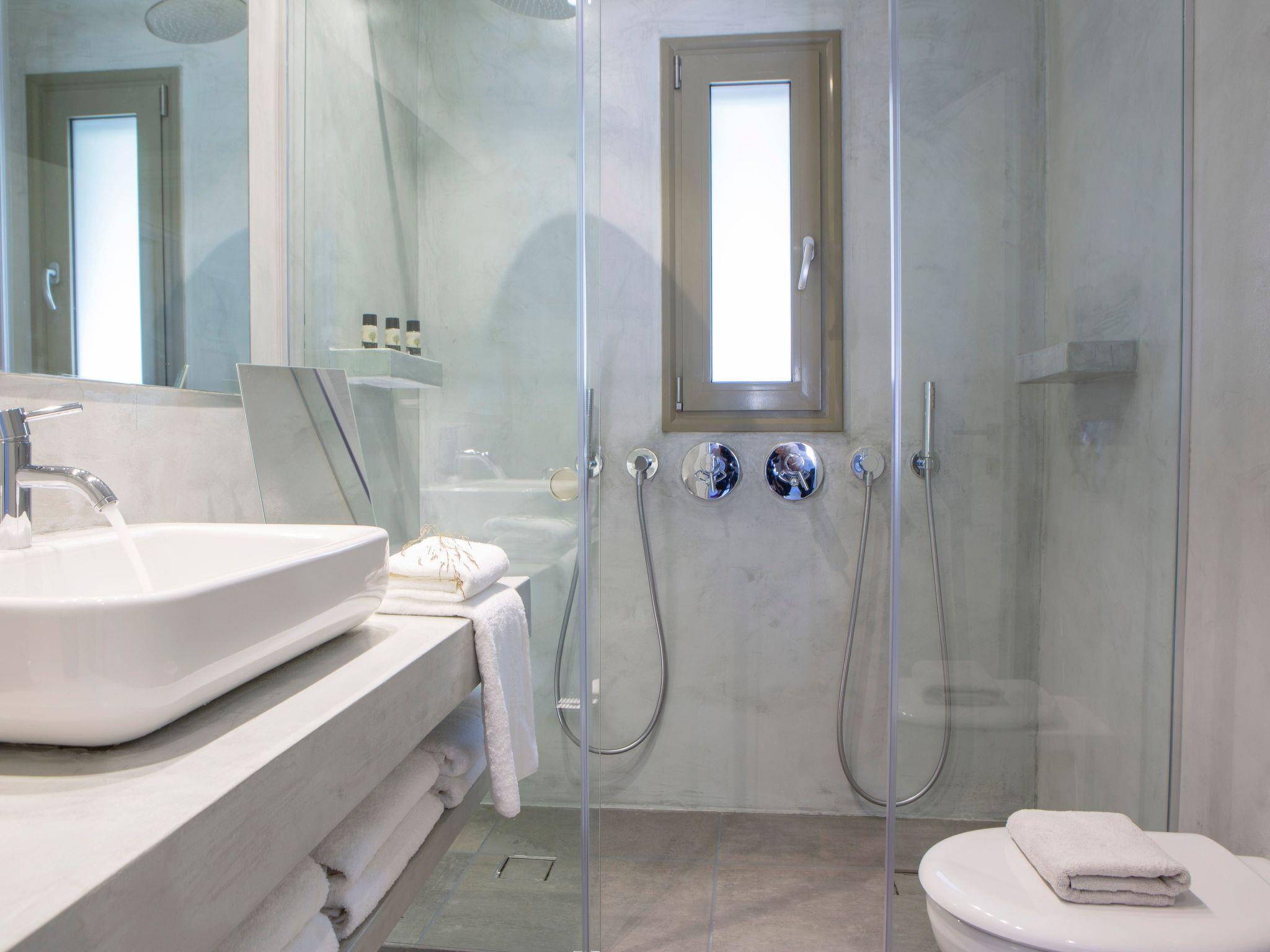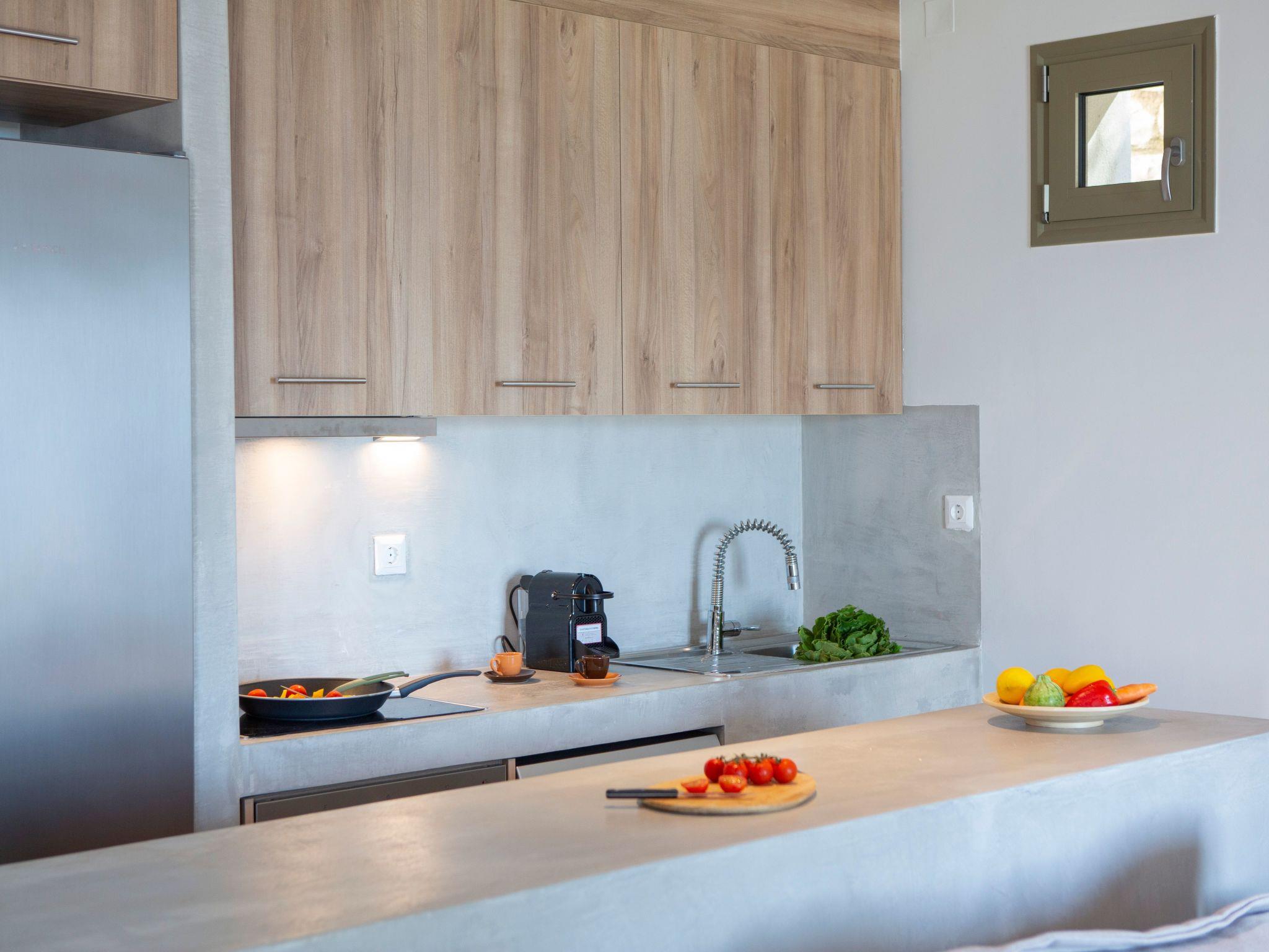 Ionian White villa has 5 bedrooms in total and can comfortably accommodate 9 guests and offers a folded extra bed for one more guest. The property is separated in two independent floors, allowing guests to enjoy privacy and seclusion. From the parking area, just few steps lead you to the swimming pool area with sunbeds and umbrellas that invite you to gaze at the endless blue Ionian sea and savor summer evenings. The stairs near the pool will lead you to the first floor of the villa that composes of a contemporary large kitchen with open layout, in contact with living room and dining area, plus one double bedroom with ensuite bathroom. Walking behind the dining area and few steps up is a second bedroom with double bed and ensuite bathroom.Outside the first floor, a large veranda with lovely sea views and an easy access to the swimming pool area is accessible through the front bedroom and living room, so you can enjoy the nice outdoor sitting area. From the beautiful outside space you can walk up the stairs to reach the second floor of the villa. Outside the entrance you find a large concrete summer living room, that will generously host you for your evening drinks. When entering the second floor, you see elegantly designed high ceilings, spacious open plan and wonderful natural sun light in the kitchen and living room, that will welcome you in. Through this large living room, connected to the wide kitchen and lovely dining area, you can access the spacious balcony with a panoramic view of the endless turquoise water of the west coast.On this floor are situated, one master bedroom in the front with access to the balcony, a bathroom with shower, and in the back one more room with 2 single beds, that can be easily converted to king size double bed with ensuite bathroom. Right beside this room, a small extra bedroom with one single bed is also an excellent option to sleep a child.