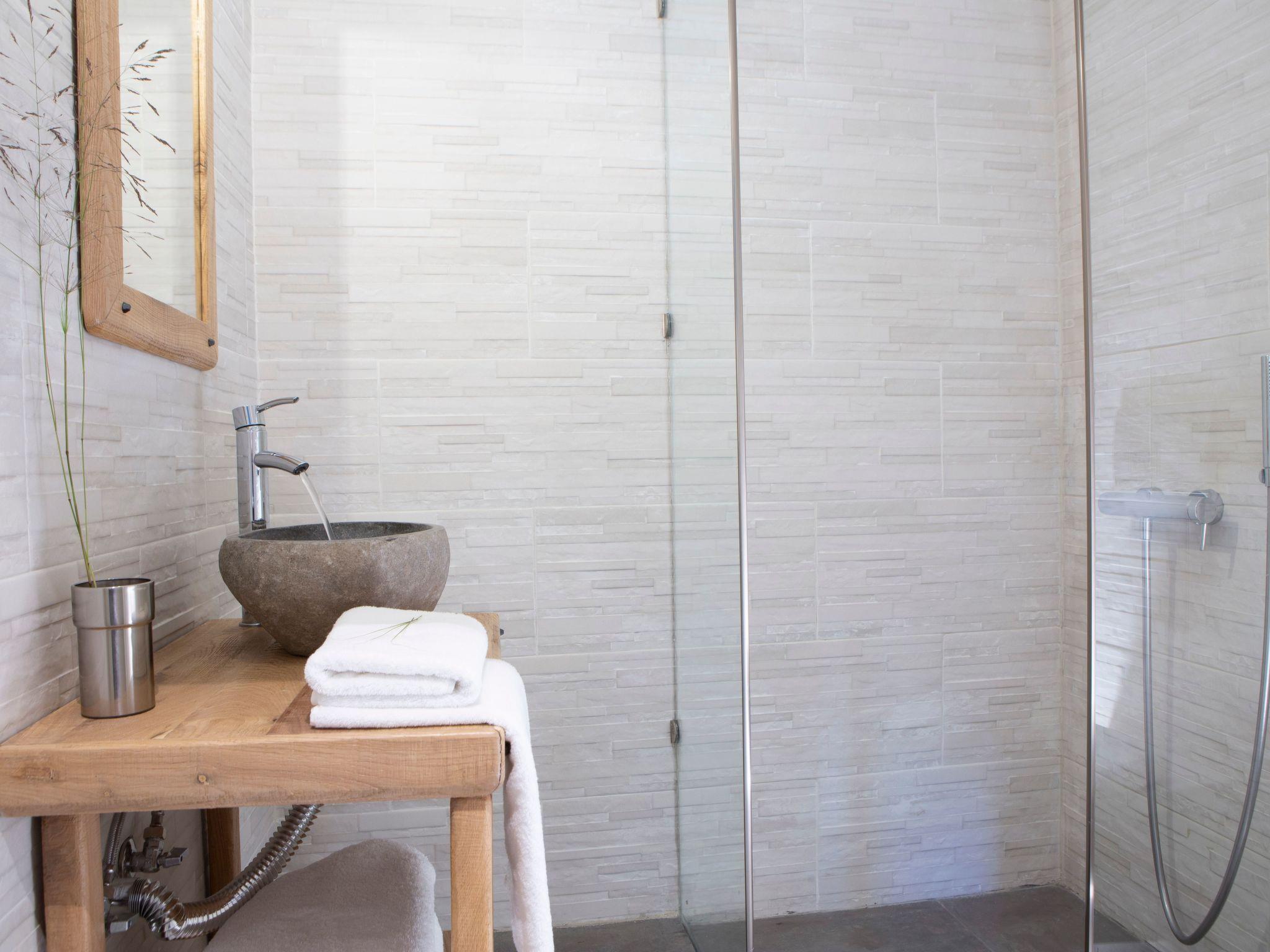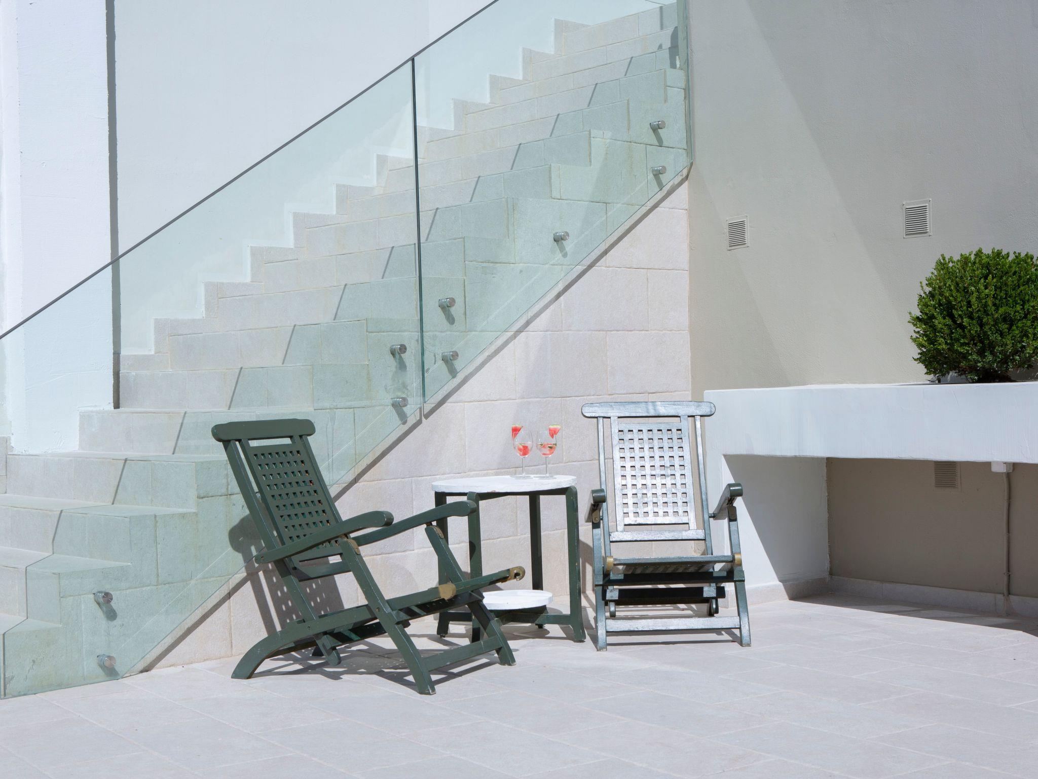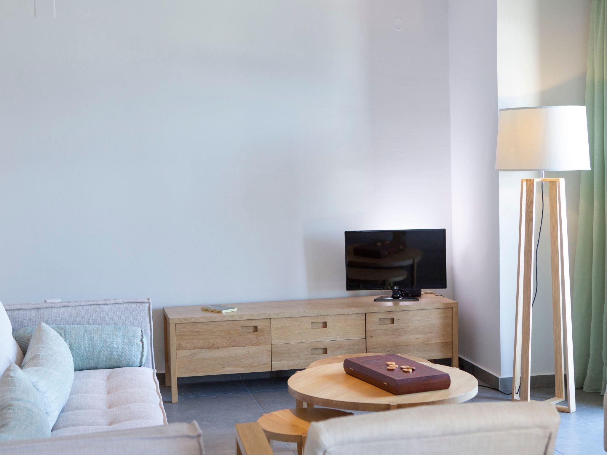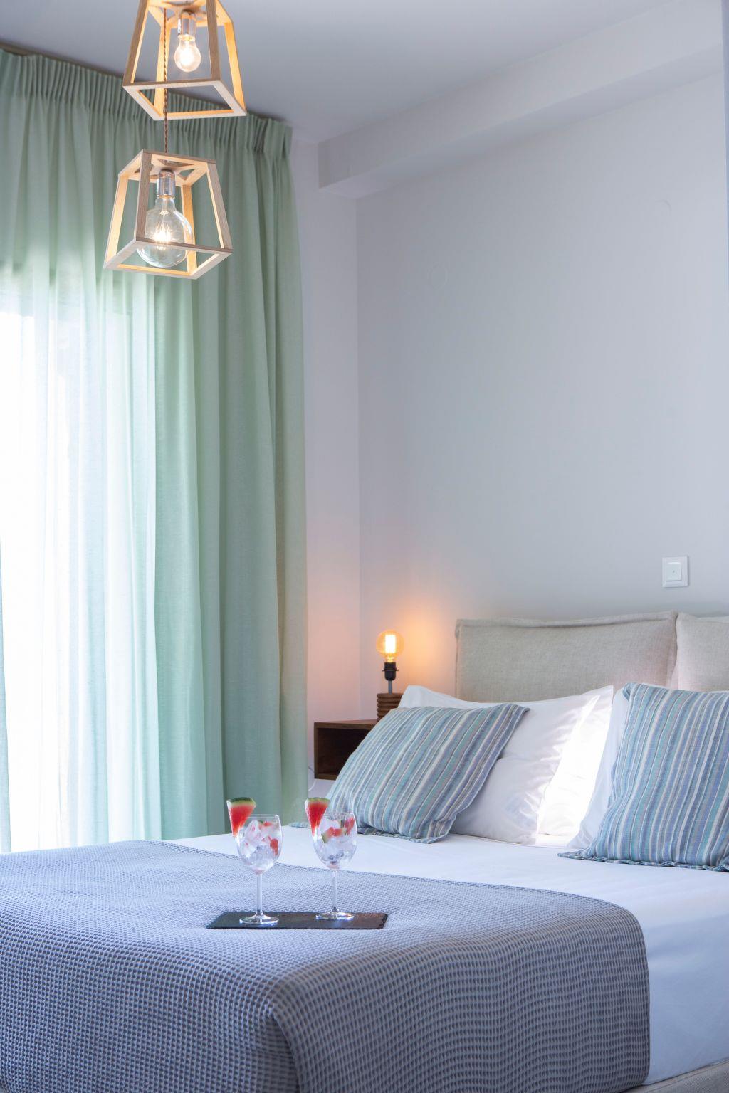 Ionian White villa has 5 bedrooms in total and can comfortably accommodate 9 guests and offers a folded extra bed for one more guest. The property is separated in two independent floors, allowing guests to enjoy privacy and seclusion. From the parking area, just few steps lead you to the swimming pool area with sunbeds and umbrellas that invite you to gaze at the endless blue Ionian sea and savor summer evenings. The stairs near the pool will lead you to the first floor of the villa that composes of a contemporary large kitchen with open layout, in contact with living room and dining area, plus one double bedroom with ensuite bathroom. Walking behind the dining area and few steps up is a second bedroom with double bed and ensuite bathroom.Outside the first floor, a large veranda with lovely sea views and an easy access to the swimming pool area is accessible through the front bedroom and living room, so you can enjoy the nice outdoor sitting area. From the beautiful outside space you can walk up the stairs to reach the second floor of the villa. Outside the entrance you find a large concrete summer living room, that will generously host you for your evening drinks. When entering the second floor, you see elegantly designed high ceilings, spacious open plan and wonderful natural sun light in the kitchen and living room, that will welcome you in. Through this large living room, connected to the wide kitchen and lovely dining area, you can access the spacious balcony with a panoramic view of the endless turquoise water of the west coast.On this floor are situated, one master bedroom in the front with access to the balcony, a bathroom with shower, and in the back one more room with 2 single beds, that can be easily converted to king size double bed with ensuite bathroom. Right beside this room, a small extra bedroom with one single bed is also an excellent option to sleep a child.