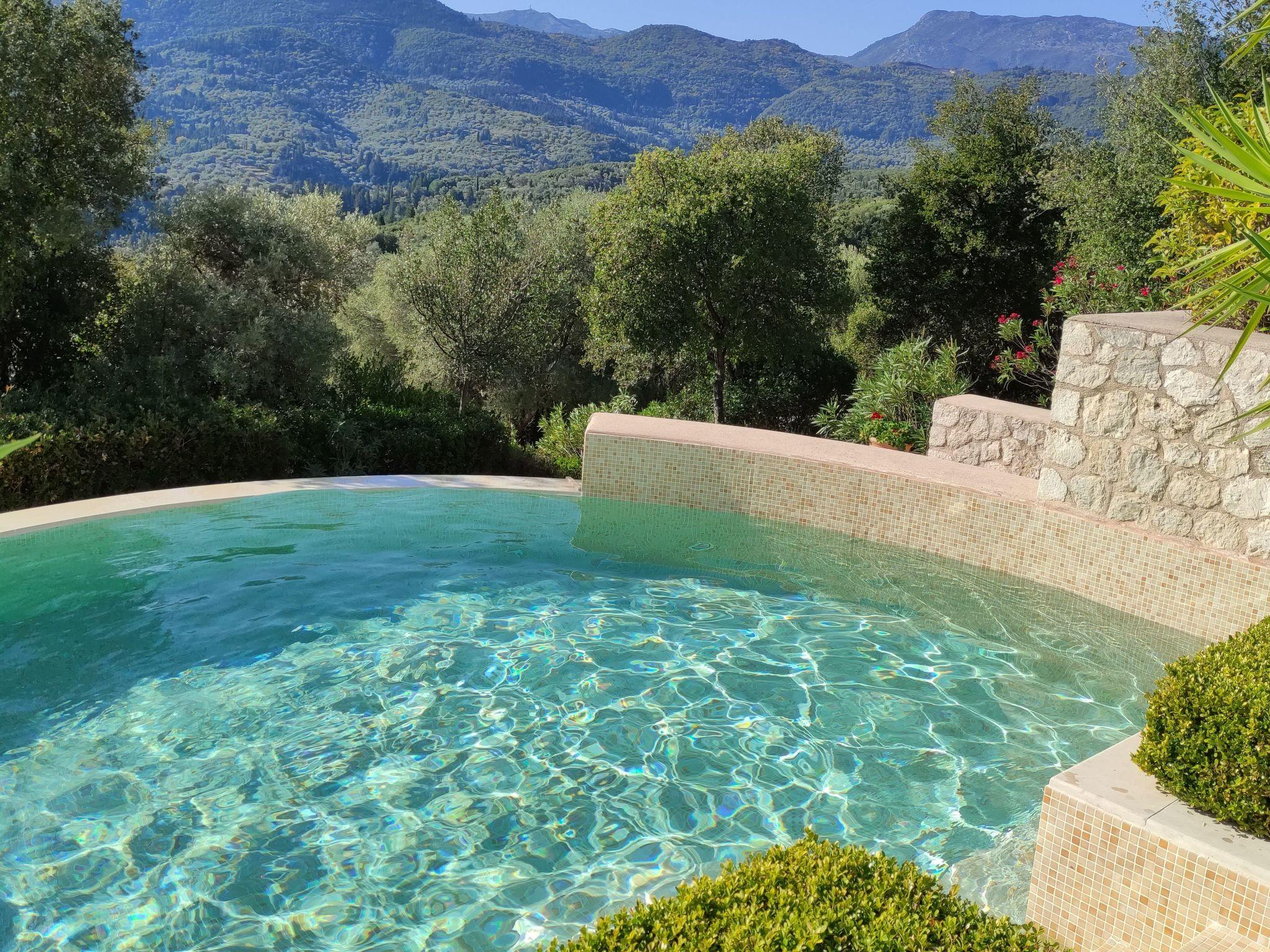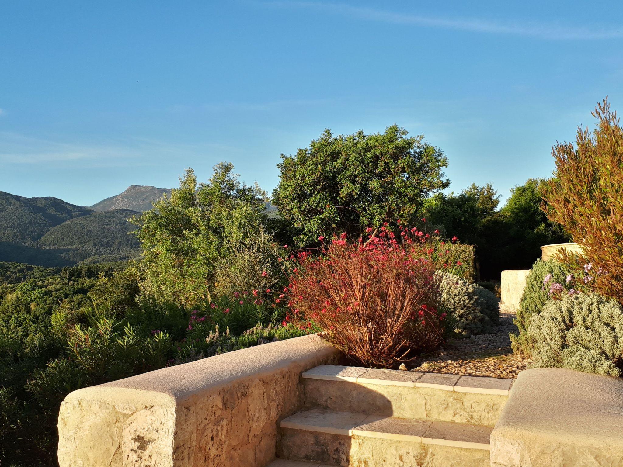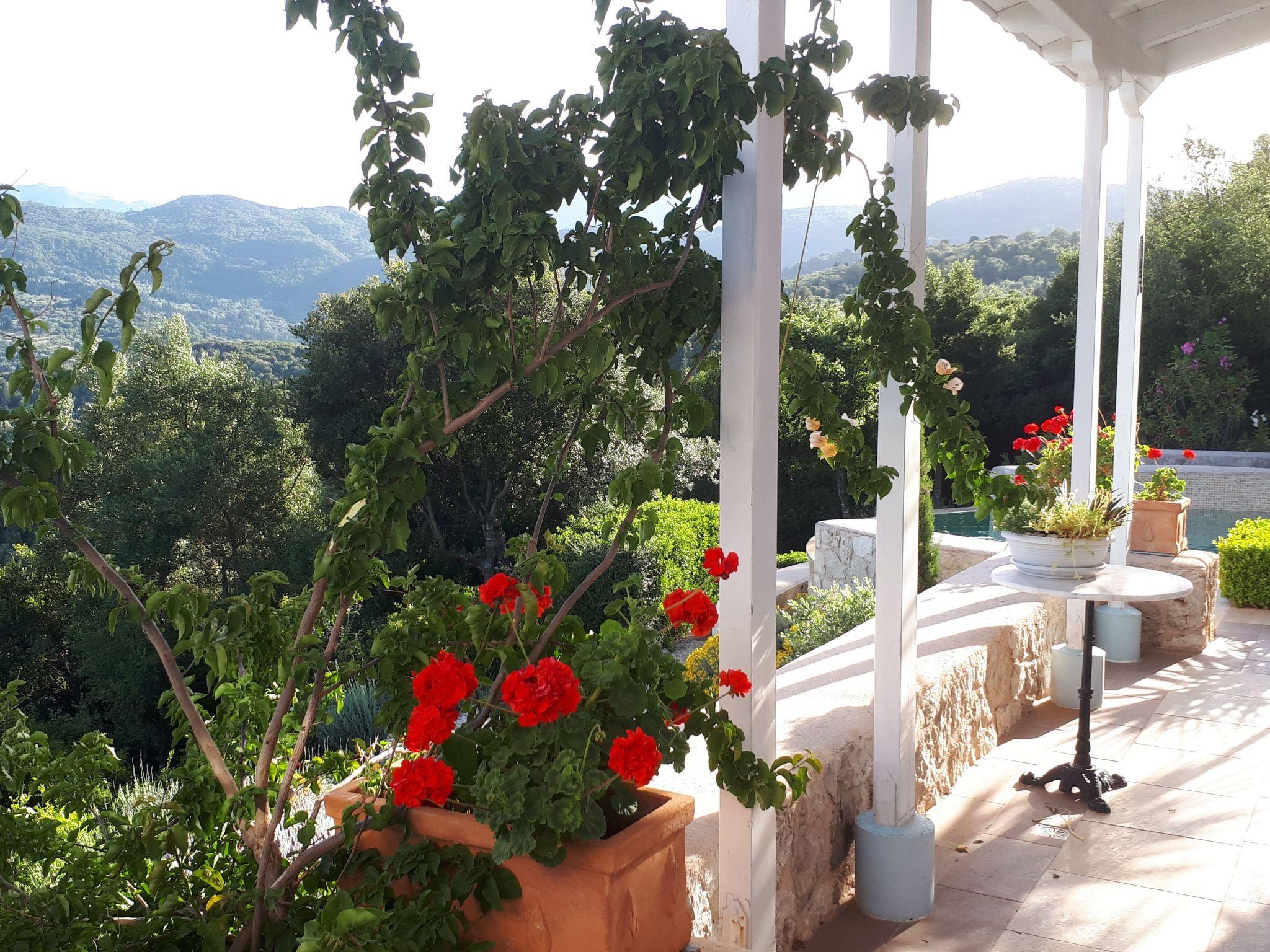 In the two-storey main house you will find the large living room with integrated, fully equipped kitchen, a dining table for 6 people, the couch group by the fireplace and the balcony from which you can enjoy a fantastic view. On the lower floor there is an additional bathroom. There is also our bedroom, which is not rented out. Of course, we are not present while you are renting the property, so you can enjoy the wonderful privacy of the house undisturbed. In the Wing - which is connected to the upper floor of the main house by a glazed passage - on the sea side you will find a bedroom (walk-through room with a comfortable sofa bed) which can also be used as a second living room, a separate toilet room with washbasin and another bedroom with its own master-bathroom. This makes the Wing ideal for a couple or parents with one child. On the opposite side of the pool terrace (which offers the most beautiful views towards the sea and mountains) there is a detached studio with integrated living/bedroom, en-suite bathroom and mini-kitchen as well as its own small terrace. This is ideal for two adults or teenagers.