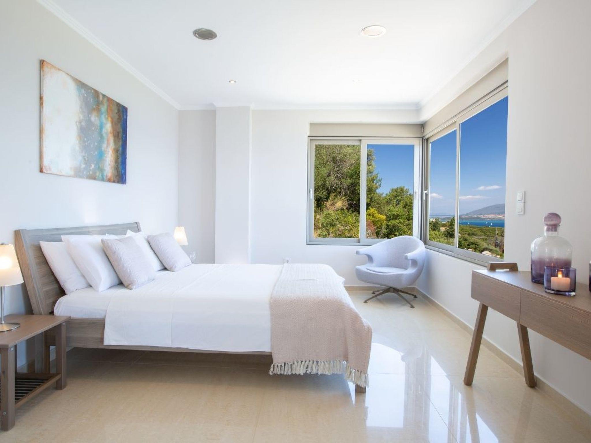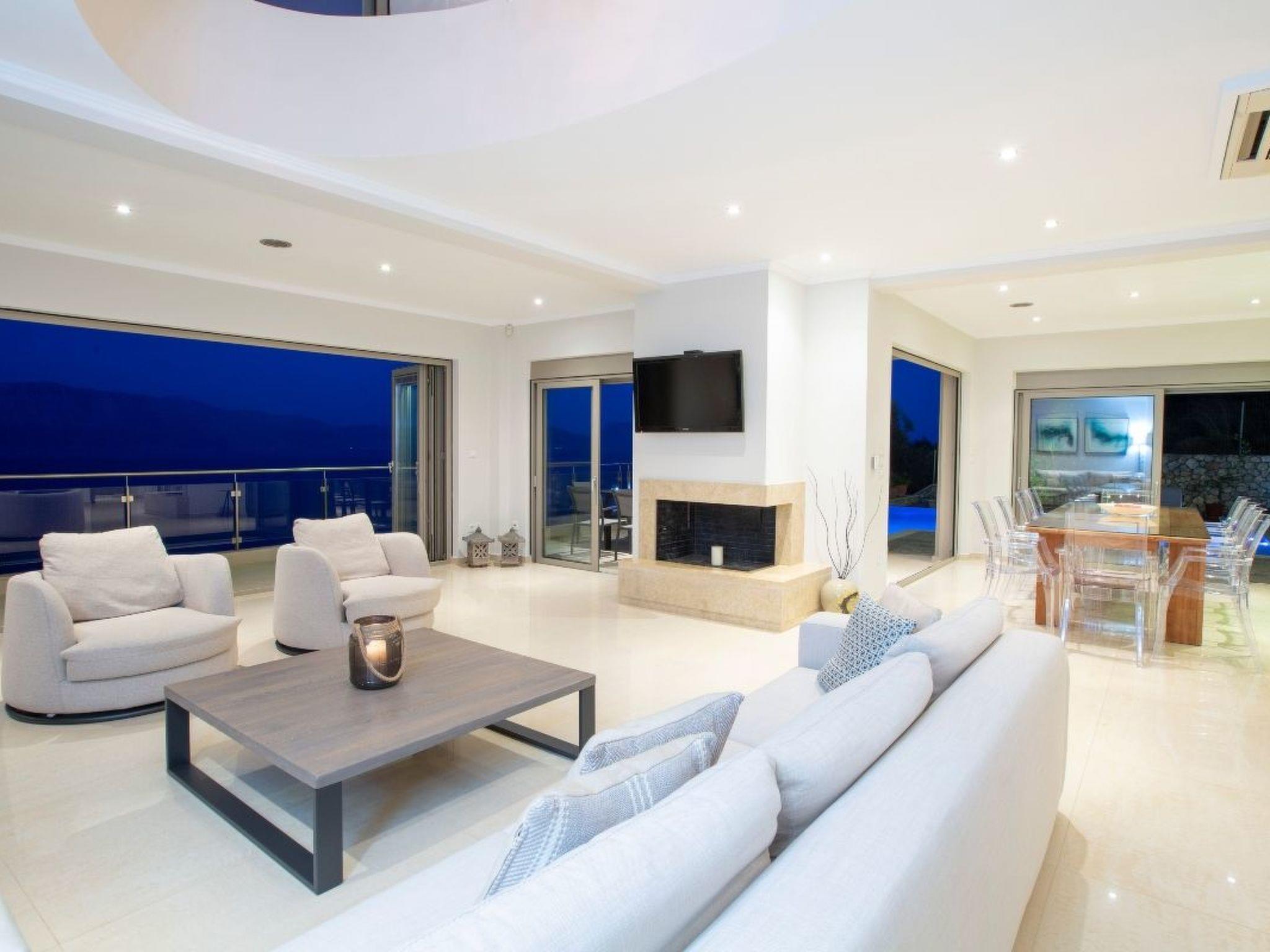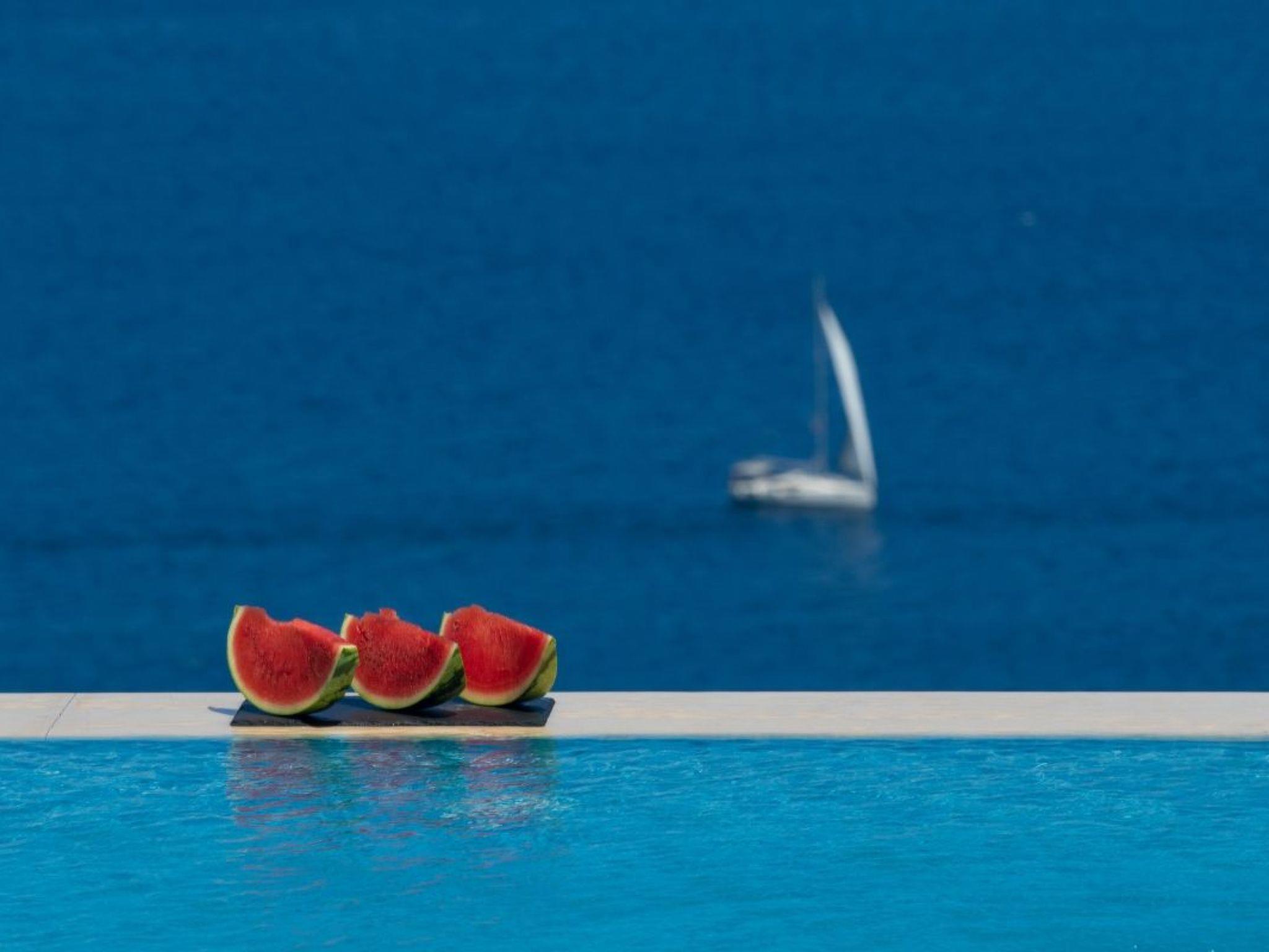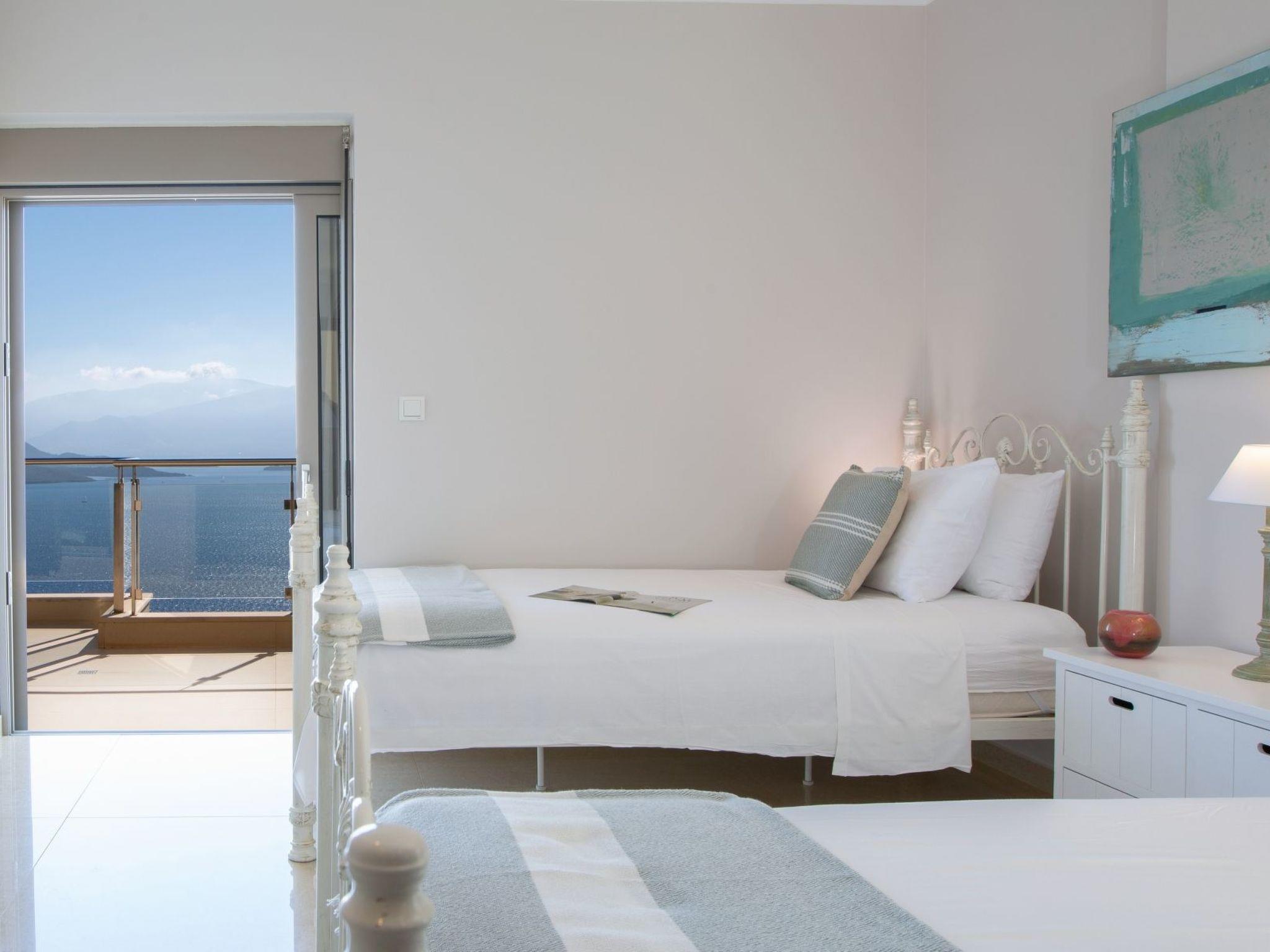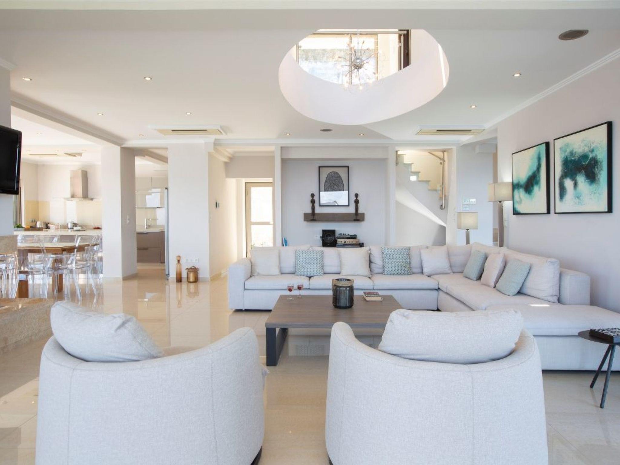 The interior of Villa Lilaea has been thoughtfully designed to offer comfort and elegance. The main living space boasts an open plan kitchen and living room with expansive sliding glass doors that seamlessly blend the indoor space with the outdoor pool area, allowing guests to fully enjoy the stunning sea views. The villa features five beautifully appointed bedrooms, each with en-suite facilities, to ensure privacy and convenience for all guests. The bedrooms vary from master doubles to double-twin setups, catering to various group or family compositions, and are spread out over three levels to provide ample space.