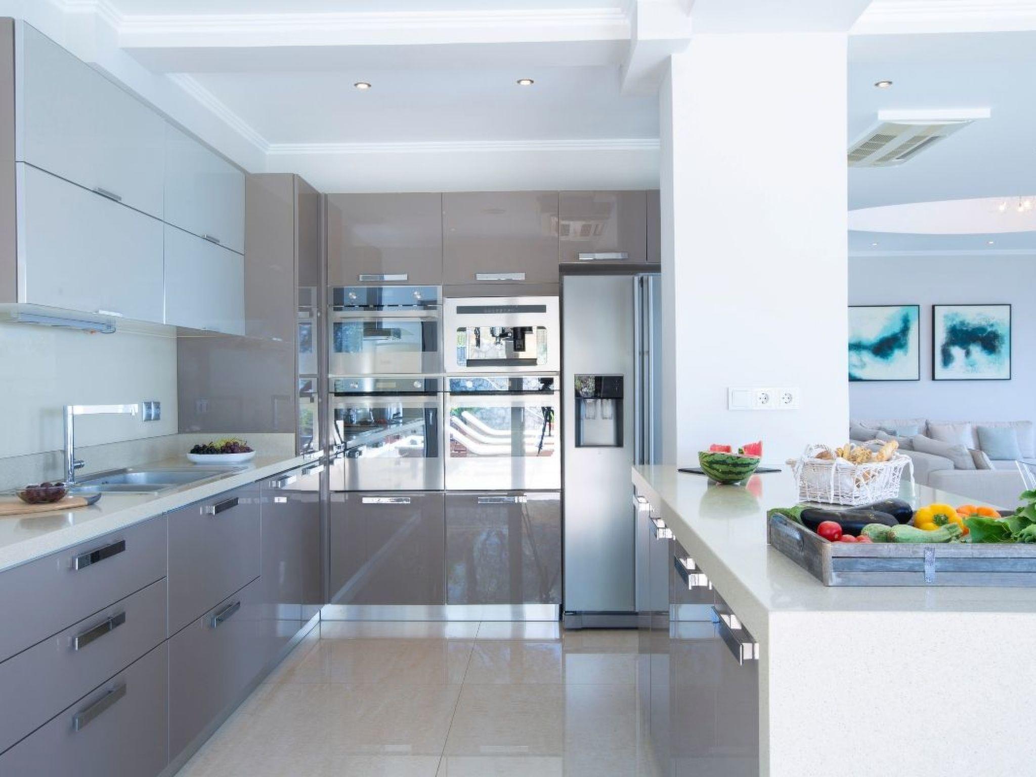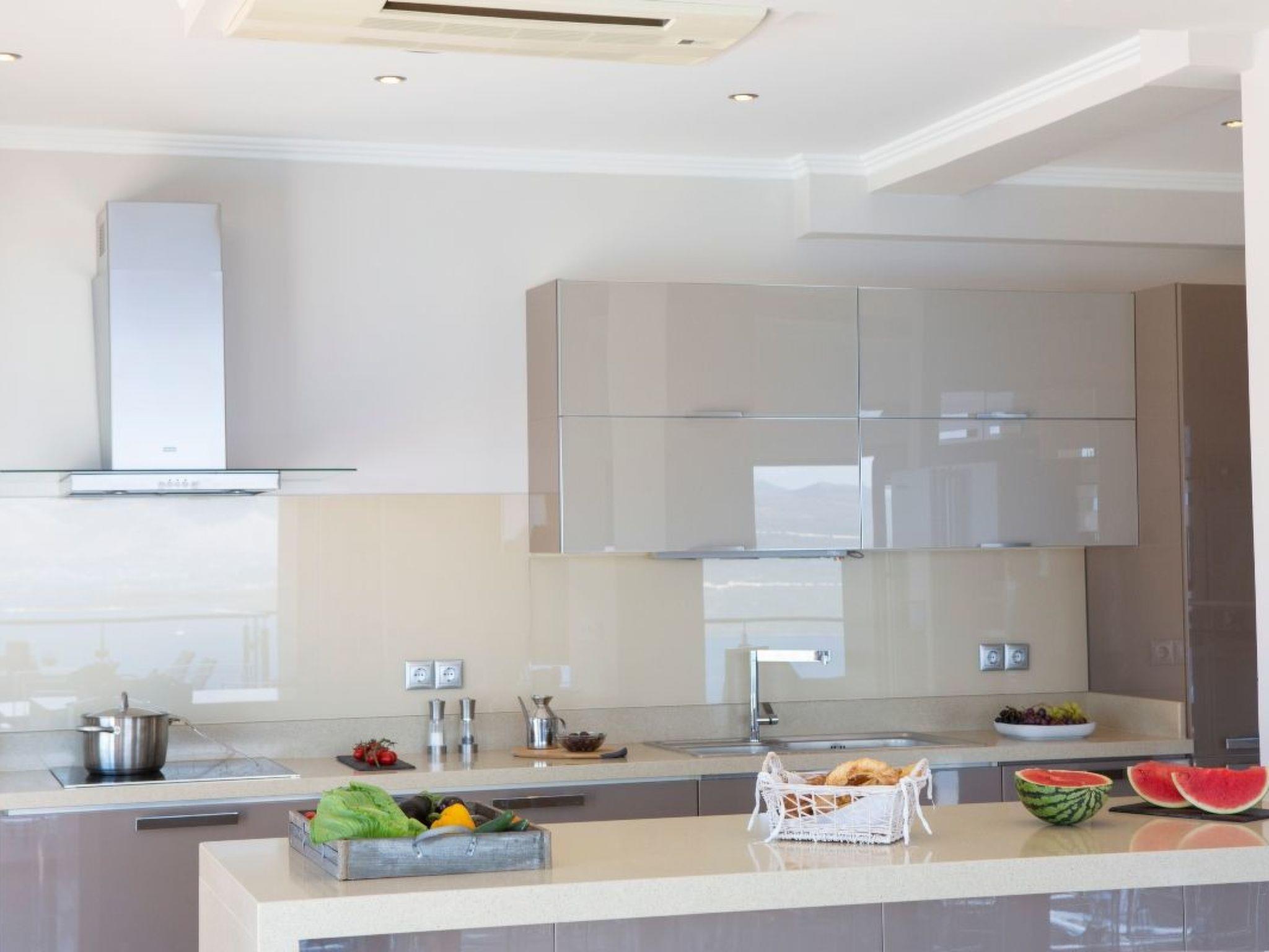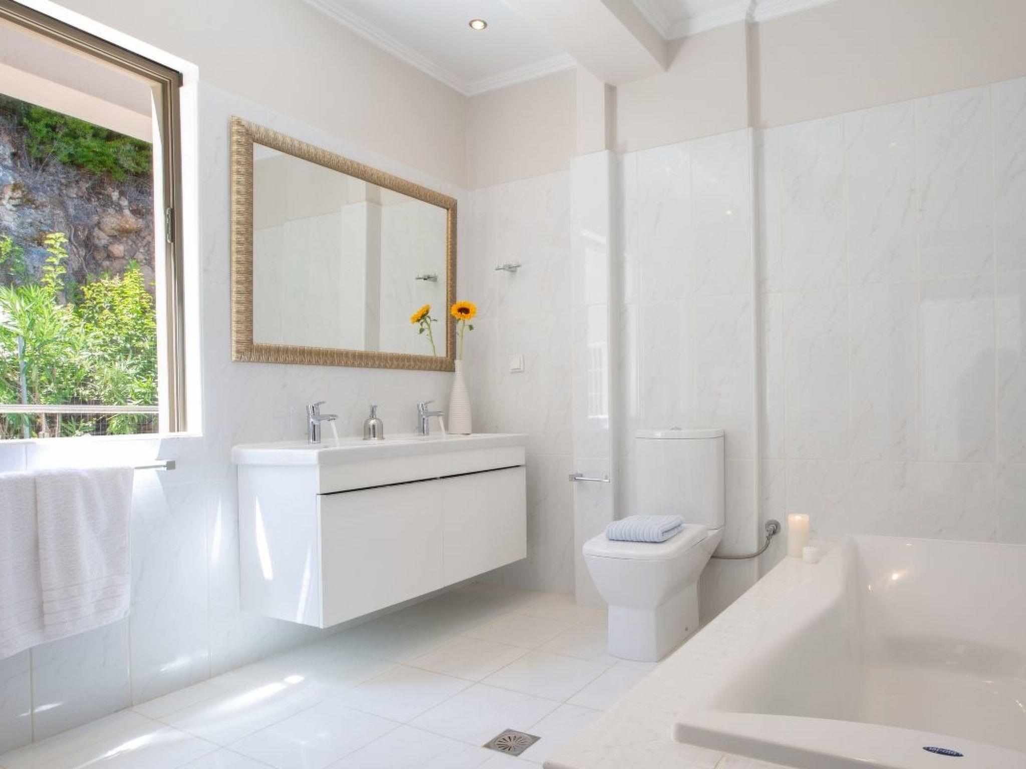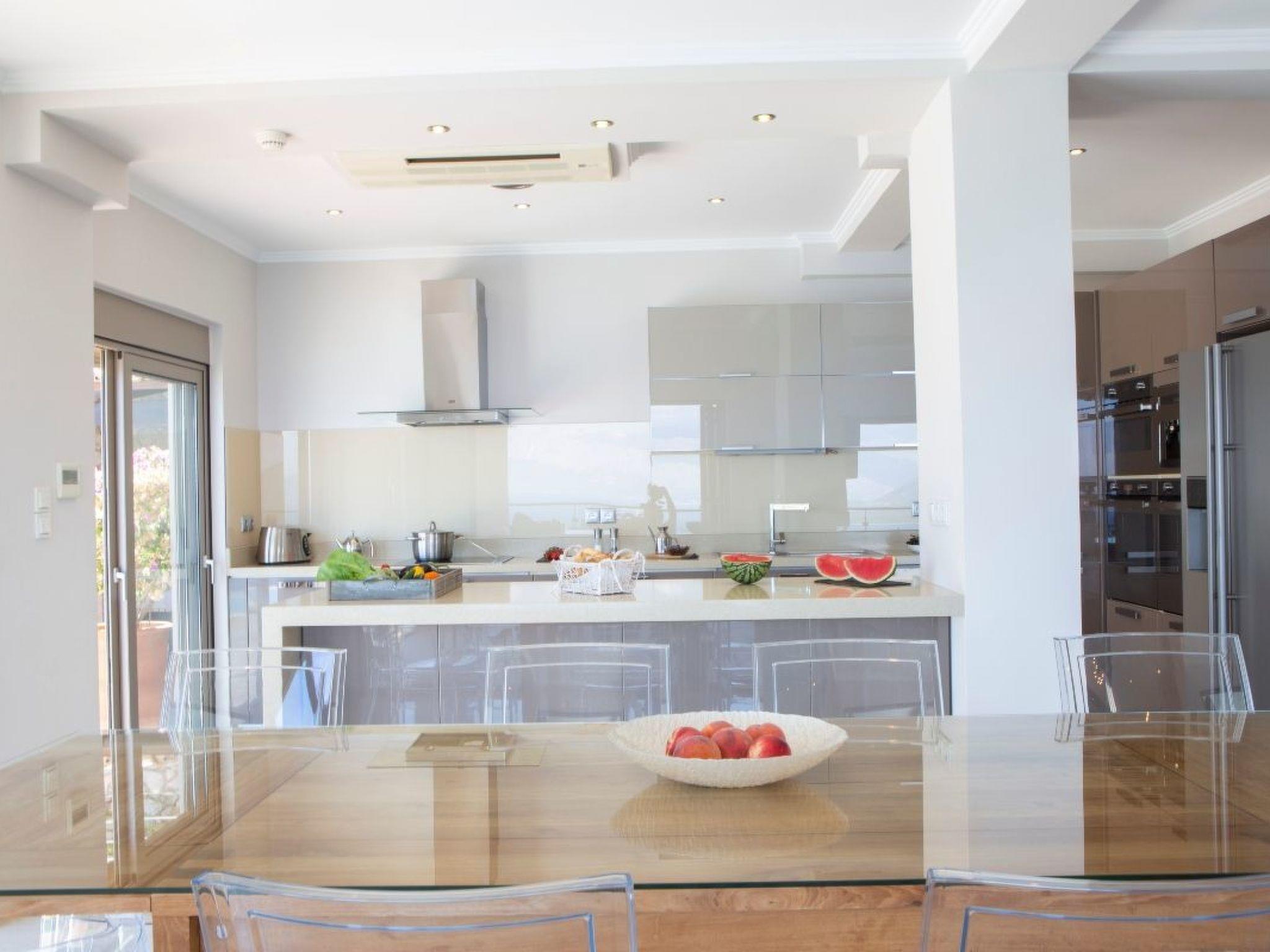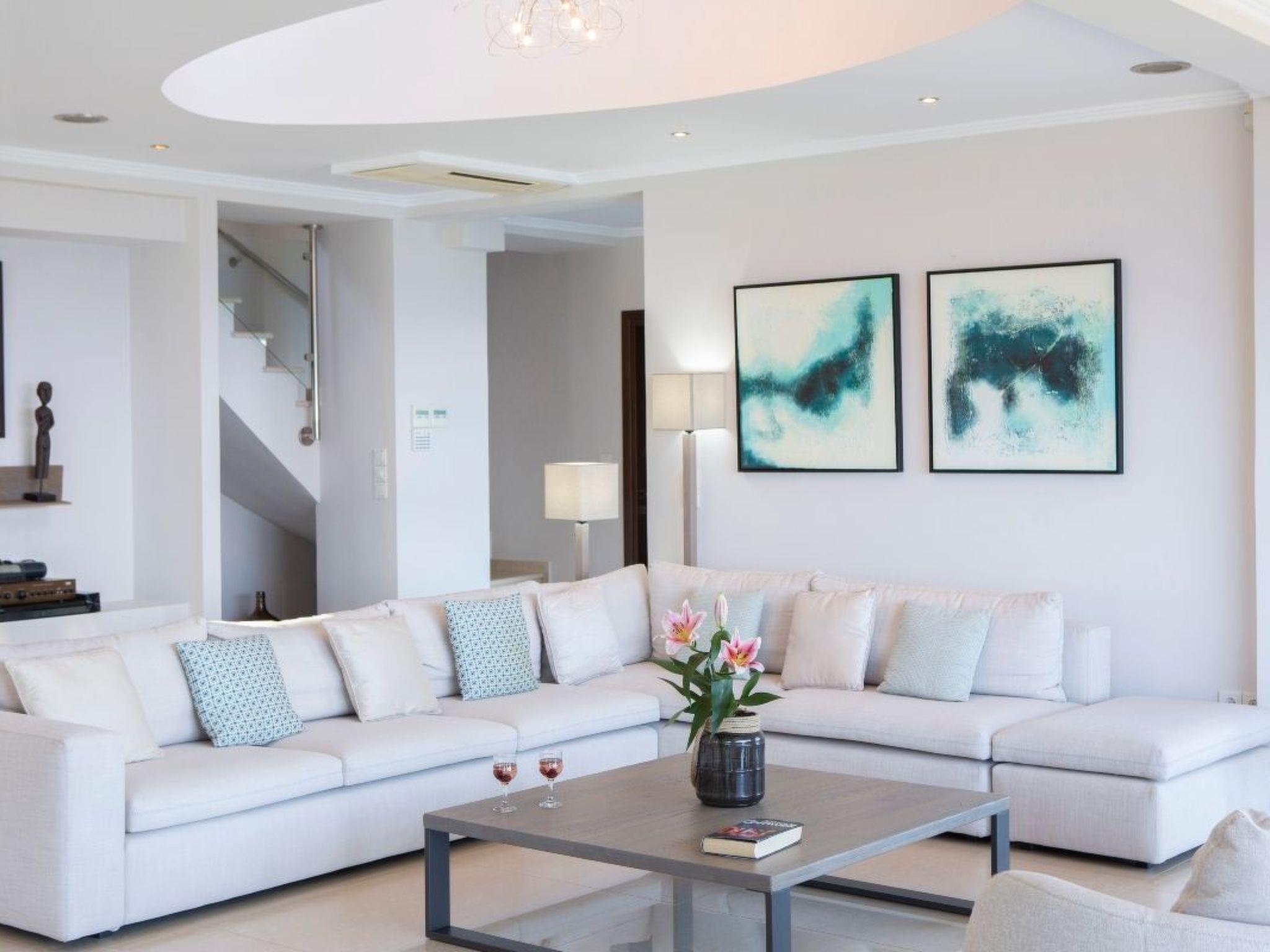 The interior of Villa Lilaea has been thoughtfully designed to offer comfort and elegance. The main living space boasts an open plan kitchen and living room with expansive sliding glass doors that seamlessly blend the indoor space with the outdoor pool area, allowing guests to fully enjoy the stunning sea views. The villa features five beautifully appointed bedrooms, each with en-suite facilities, to ensure privacy and convenience for all guests. The bedrooms vary from master doubles to double-twin setups, catering to various group or family compositions, and are spread out over three levels to provide ample space.