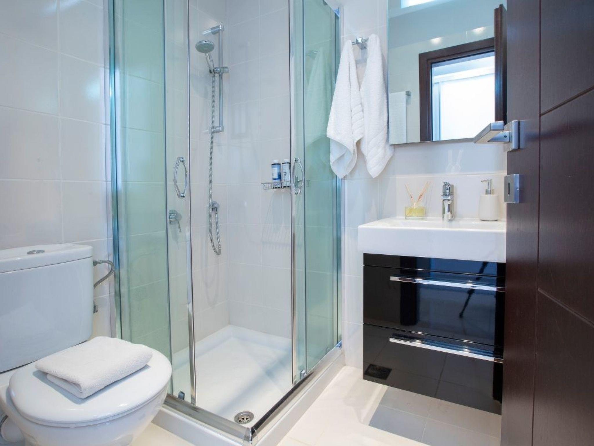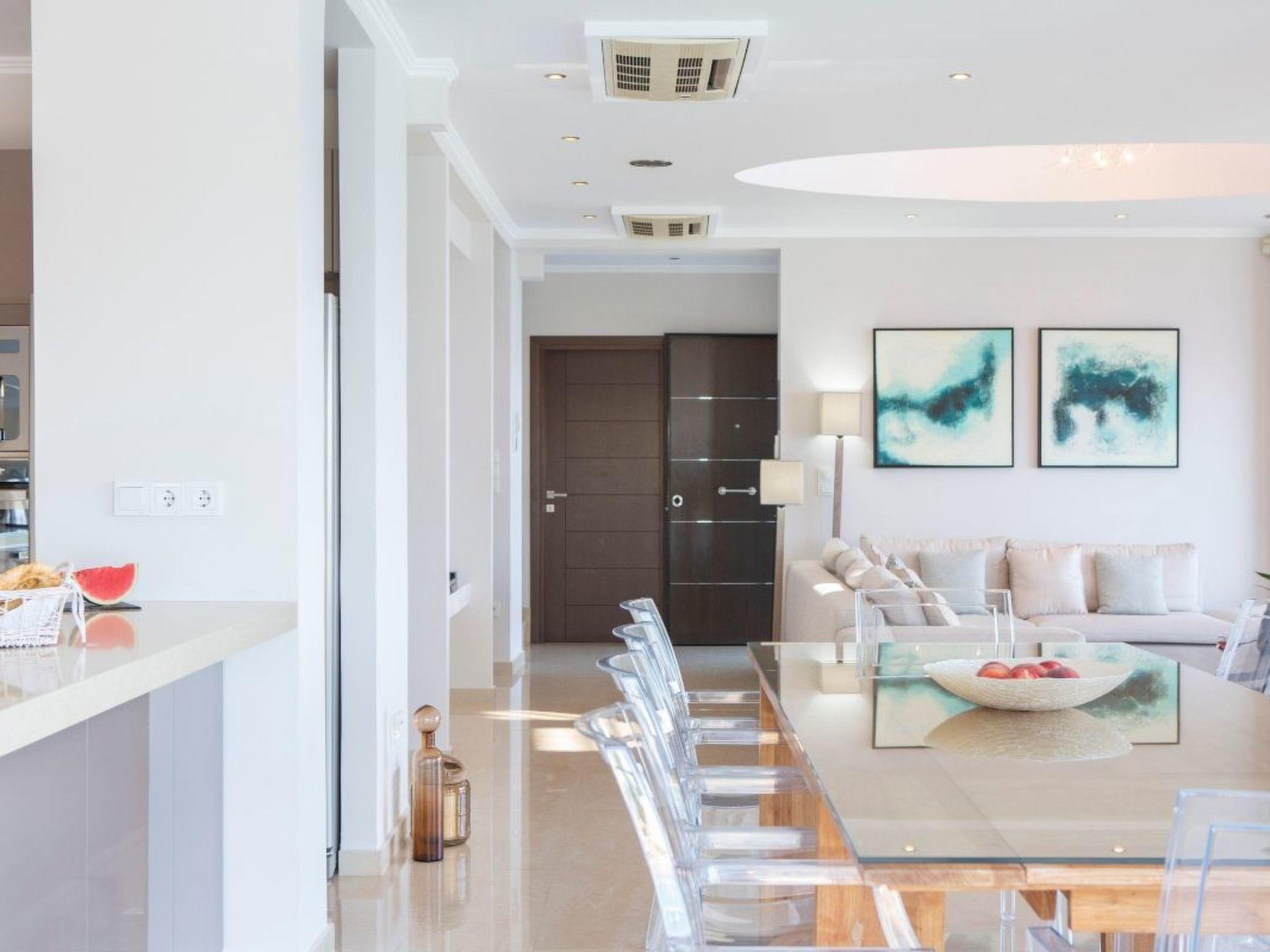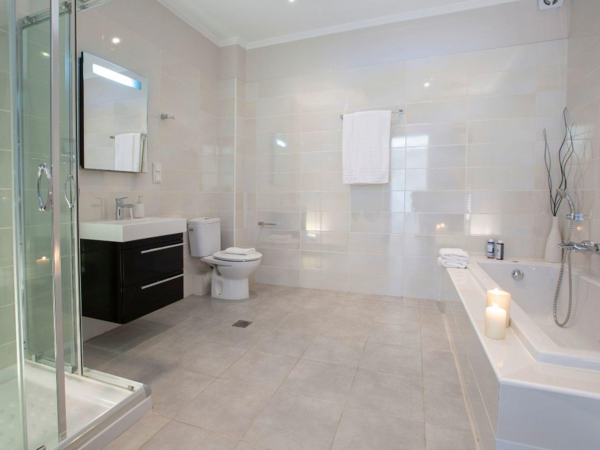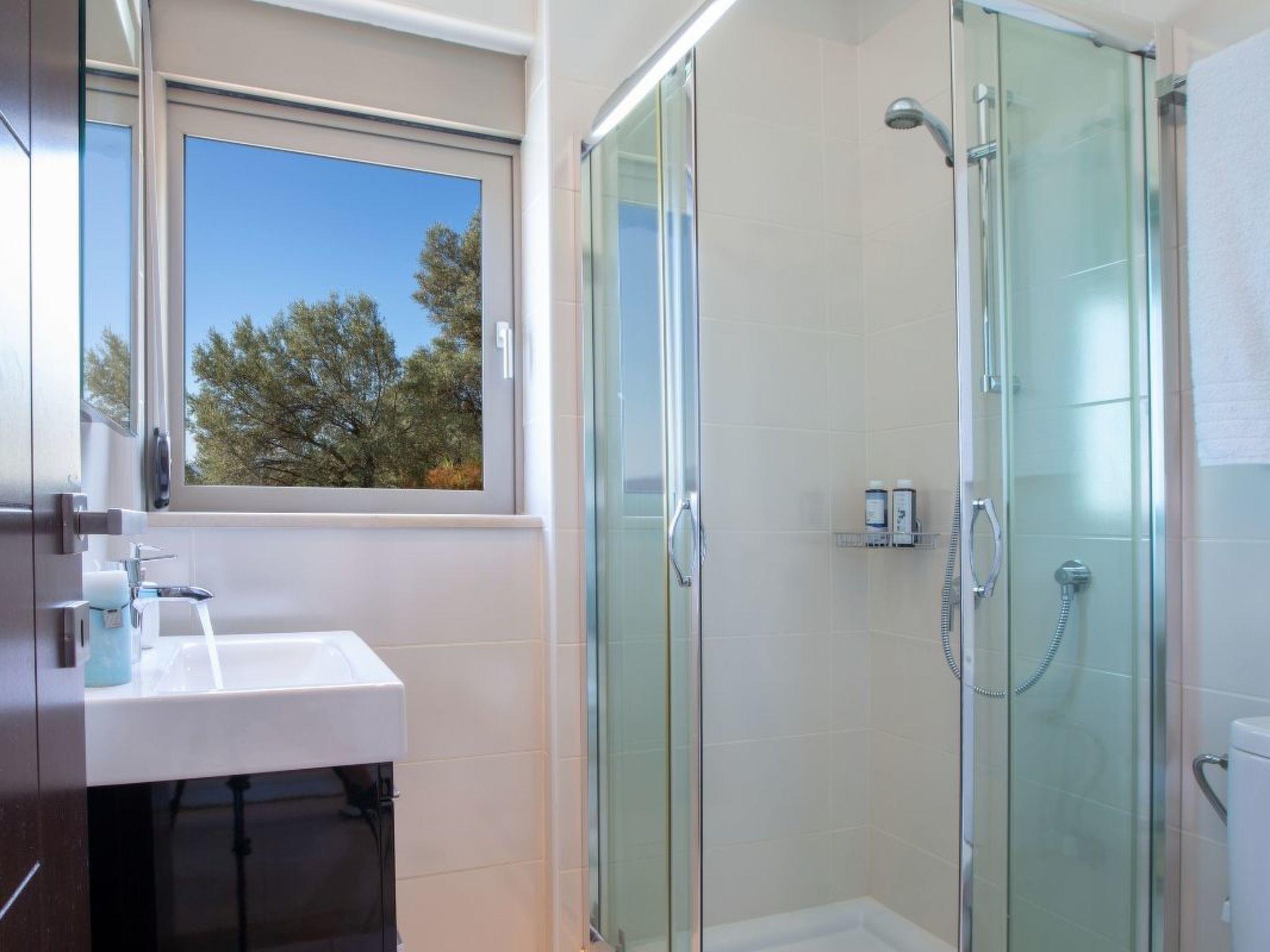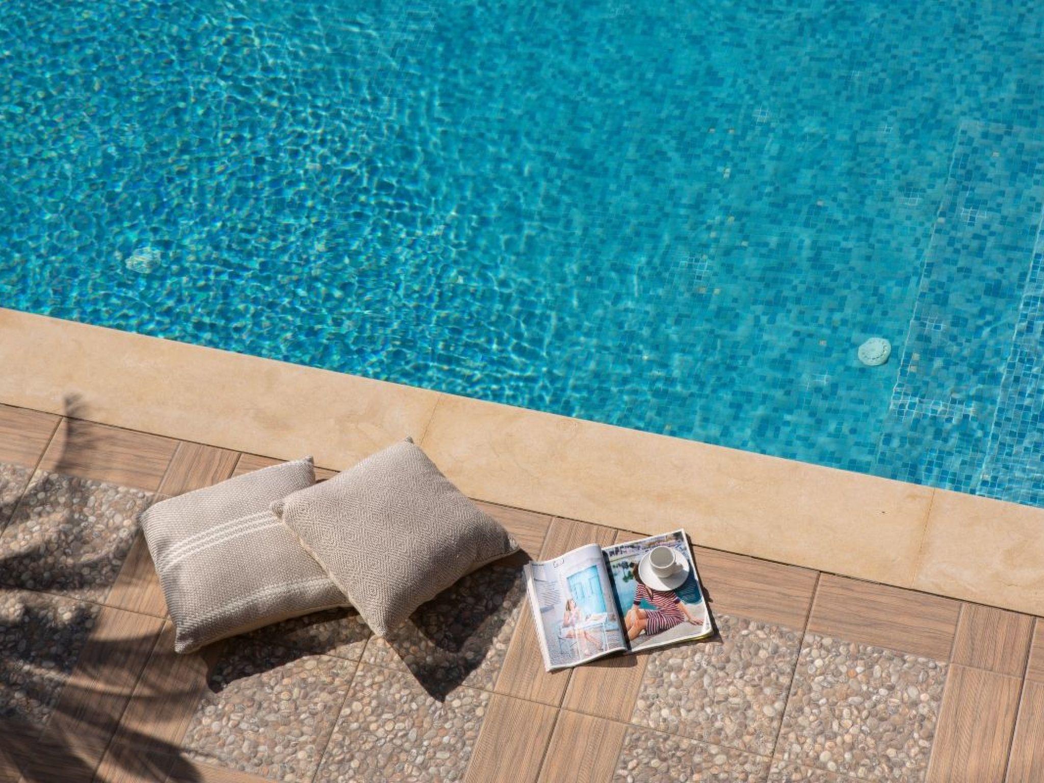 The interior of Villa Lilaea has been thoughtfully designed to offer comfort and elegance. The main living space boasts an open plan kitchen and living room with expansive sliding glass doors that seamlessly blend the indoor space with the outdoor pool area, allowing guests to fully enjoy the stunning sea views. The villa features five beautifully appointed bedrooms, each with en-suite facilities, to ensure privacy and convenience for all guests. The bedrooms vary from master doubles to double-twin setups, catering to various group or family compositions, and are spread out over three levels to provide ample space.