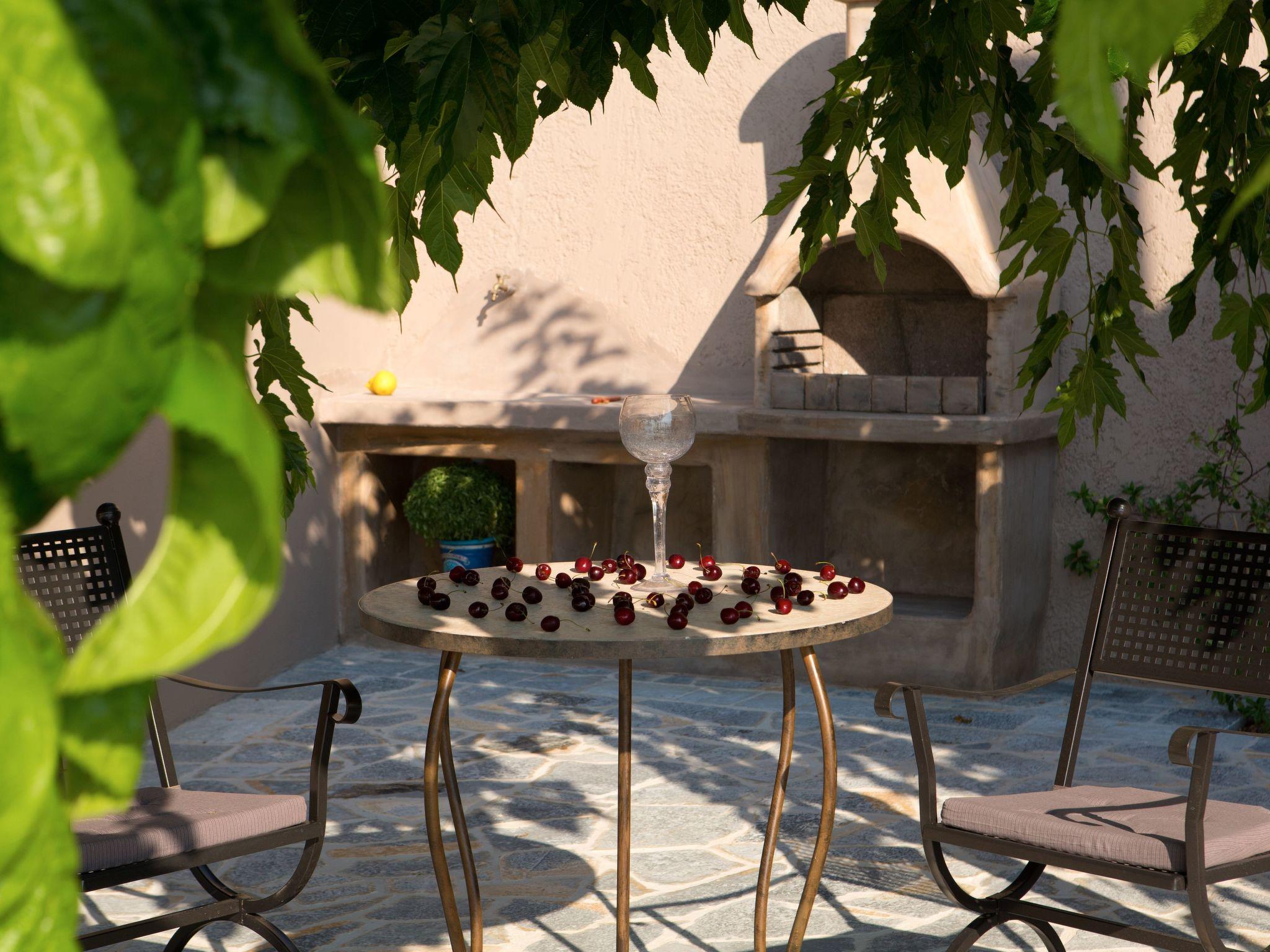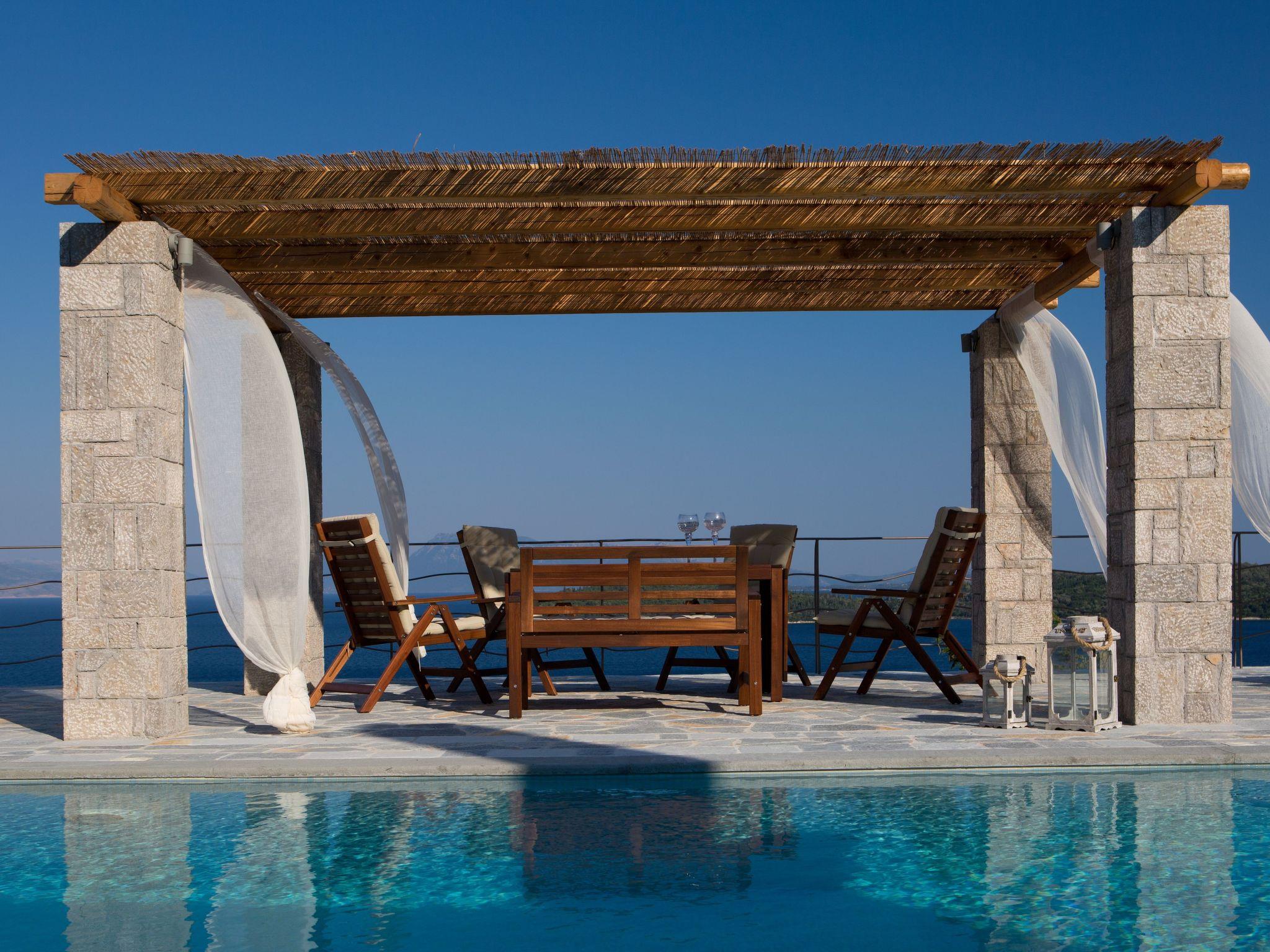 The stone paved terrace that stretches across the entire front of the villa is the jewel of this property. A simple wood pergola, adorned with natural muslin to create a cool and relaxing haven offers completely unobstructed views of the gorgeous Ionian Sea. Scattered around the terrace are a number of comfy bean bags and sunbeds with thick mattresses for ultimate comfort. In the shade of a beautiful, mature, Linden tree is the modern built BBQ perfect for preparing a tasty Mediterranean lunch or dinner.
