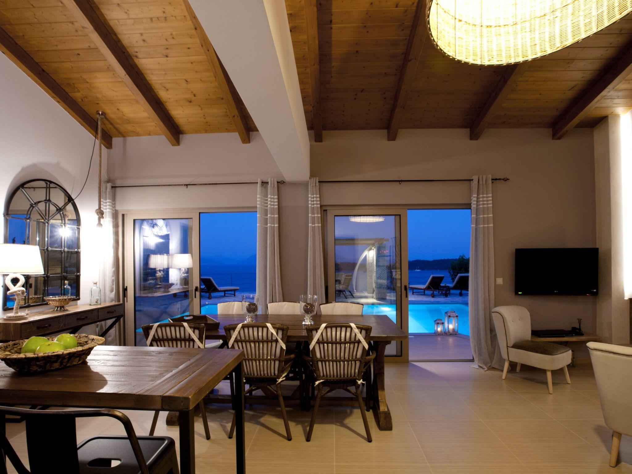 The spacious lounge, next to the dining room with huge windows allow for the unforgettable view to penetrate the villa; the cool translucent pool water comes in line with the deep blue sea, dotted with little islands as far as the eye can see.