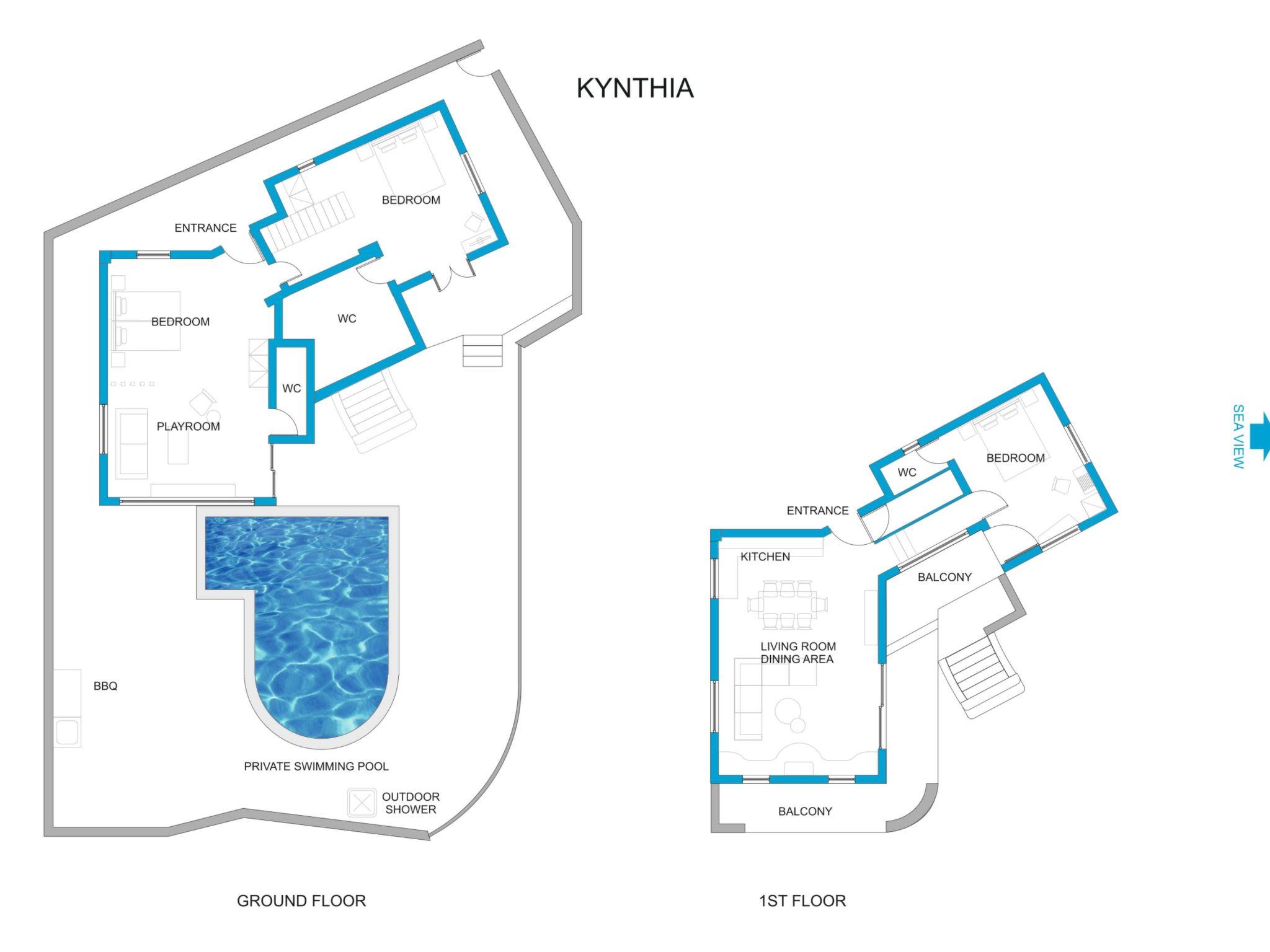 The main entrance leads straight into a comfortable open-plan lounge and fully equipped kitchen – dining room. The large comfortable corner sofa surrounded by soft vintage lighting makes the perfect spot for relaxing and enjoying the sea view. The Master bedroom is furnished with a large double four poster bed decorated with natural muslin and the picture frame windows allow the sunlight and sea views to stream in to the bedroom. The Double bedroom, with large double bed, has direct access to the pool terrace. The very spacious Twin bedroom has two single beds plus a sofa and comfy bean bags set up around a flat screen TV with Playstation.