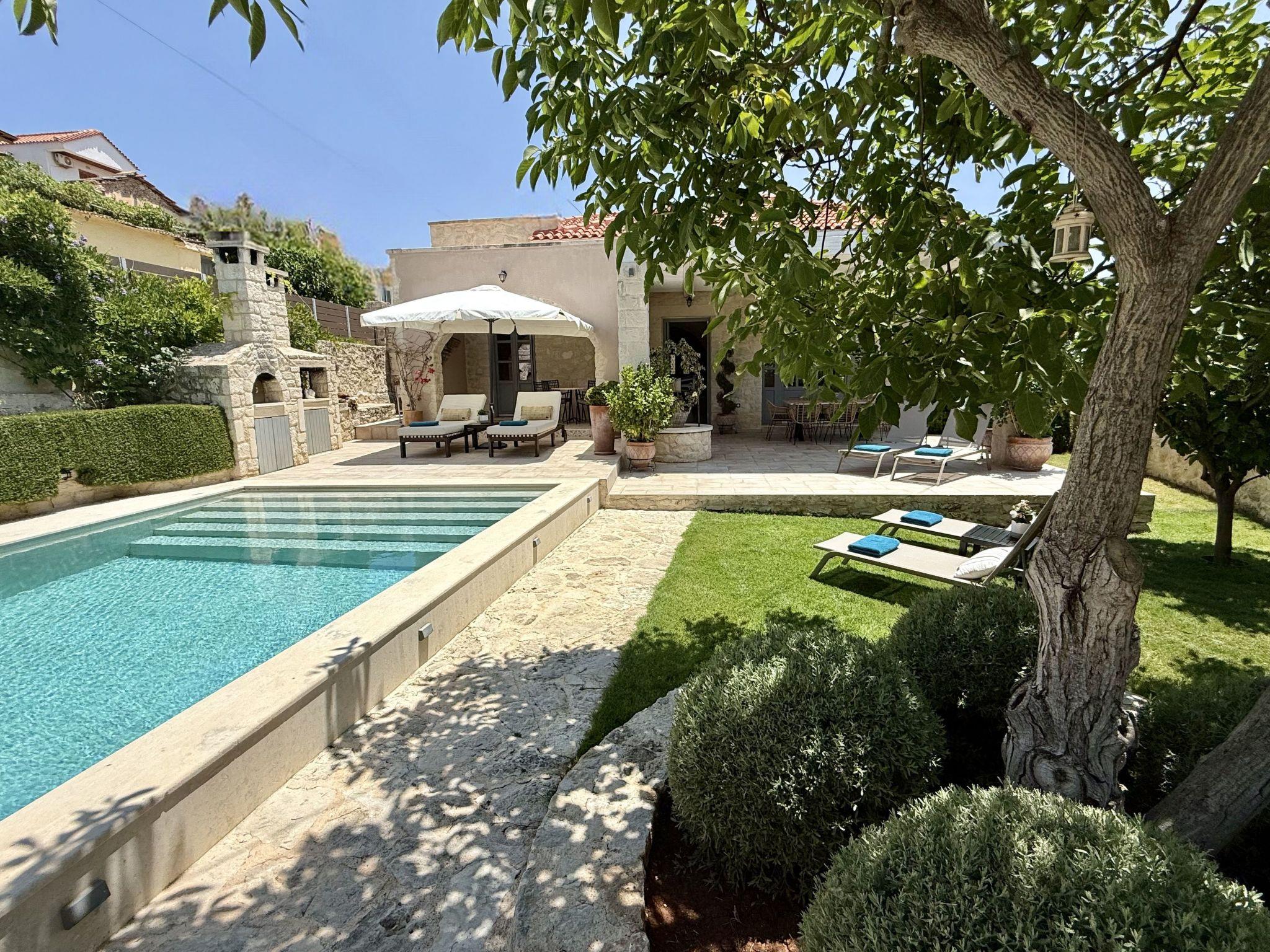 Outdoors, the villa offers a beautifully landscaped private garden and a spacious terrace, where guests can unwind under the Mediterranean sun. The private outdoor swimming pool, measuring 20 sq.m. (3.80 x 5.30 m) with a depth of 1.50 m, provides a refreshing retreat during warm summer days. Around the pool, sun loungers and umbrellas offer total relaxation, while two pergola-shaded dining areas create the ideal setting for al fresco meals and sunset gatherings.