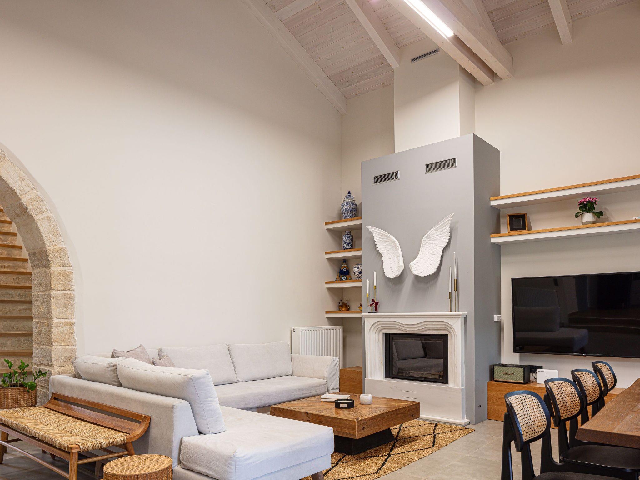 Inside, the villa unfolds across two thoughtfully designed levels with stylish interiors and a warm, welcoming atmosphere. The open-plan living area on the ground floor features a comfortable sofa, a 65-inch Smart TV with satellite channels, and a decorative fireplace, seamlessly connecting to the outdoor terrace through large glass doors. The fully equipped kitchen includes all modern appliances and cookware, ideal for preparing meals with fresh local ingredients, while the adjacent dining area comfortably seats eight, perfect for sharing food and laughter.