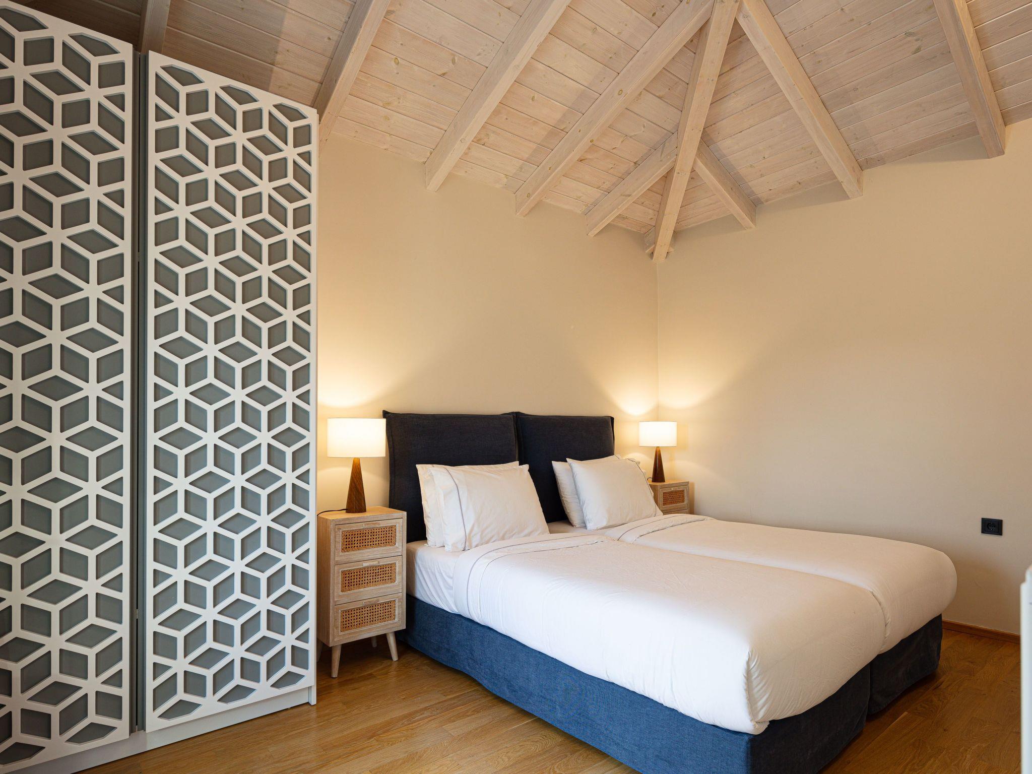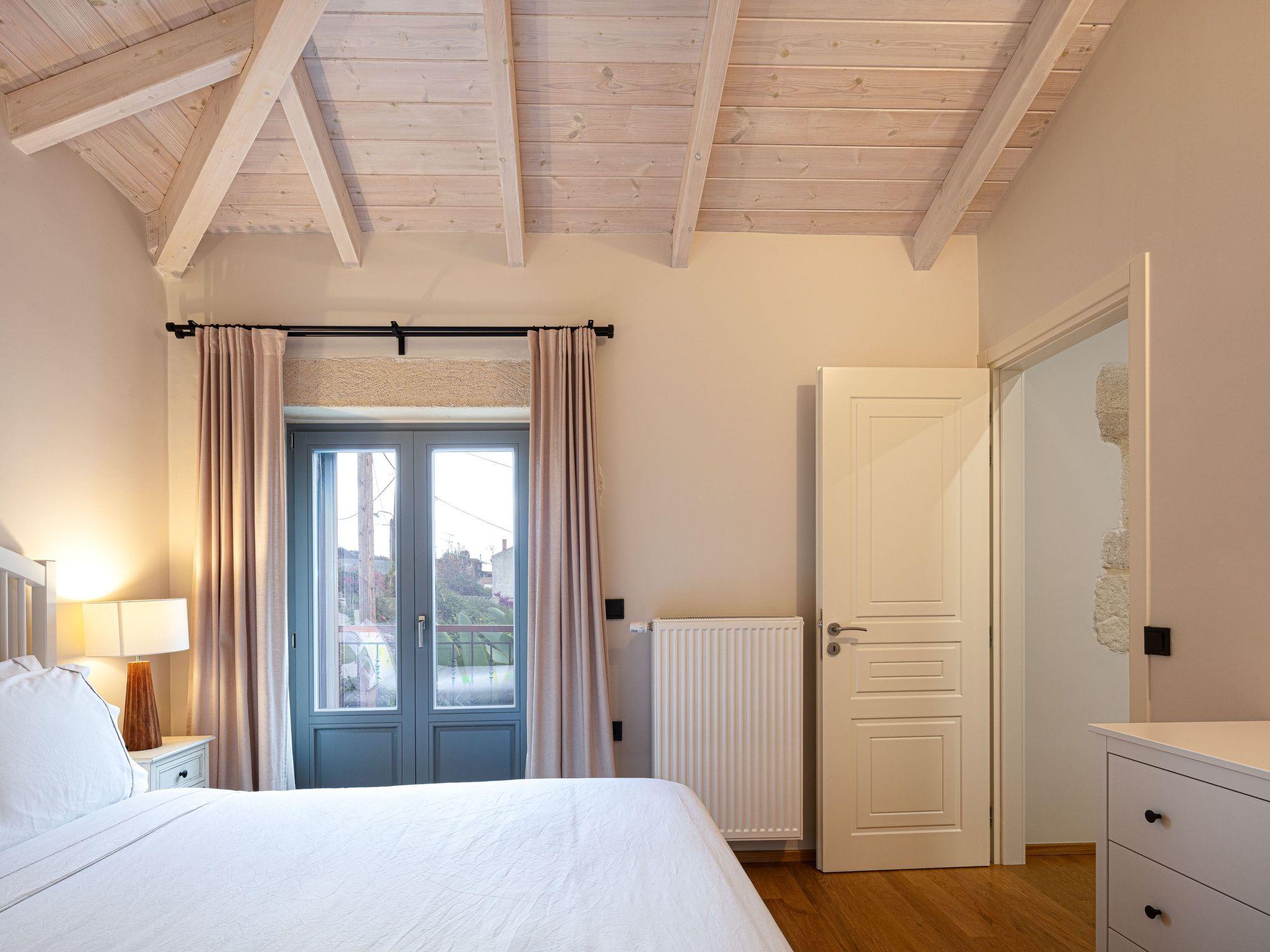 Upstairs, two more elegant bedrooms await. One features twin-size beds and a private balcony, ideal for enjoying the calm village atmosphere. The second bedroom includes a queen-size bed, an ensuite bathroom with a modern shower, and access to a private balcony offering spectacular views of the Cretan mountains.